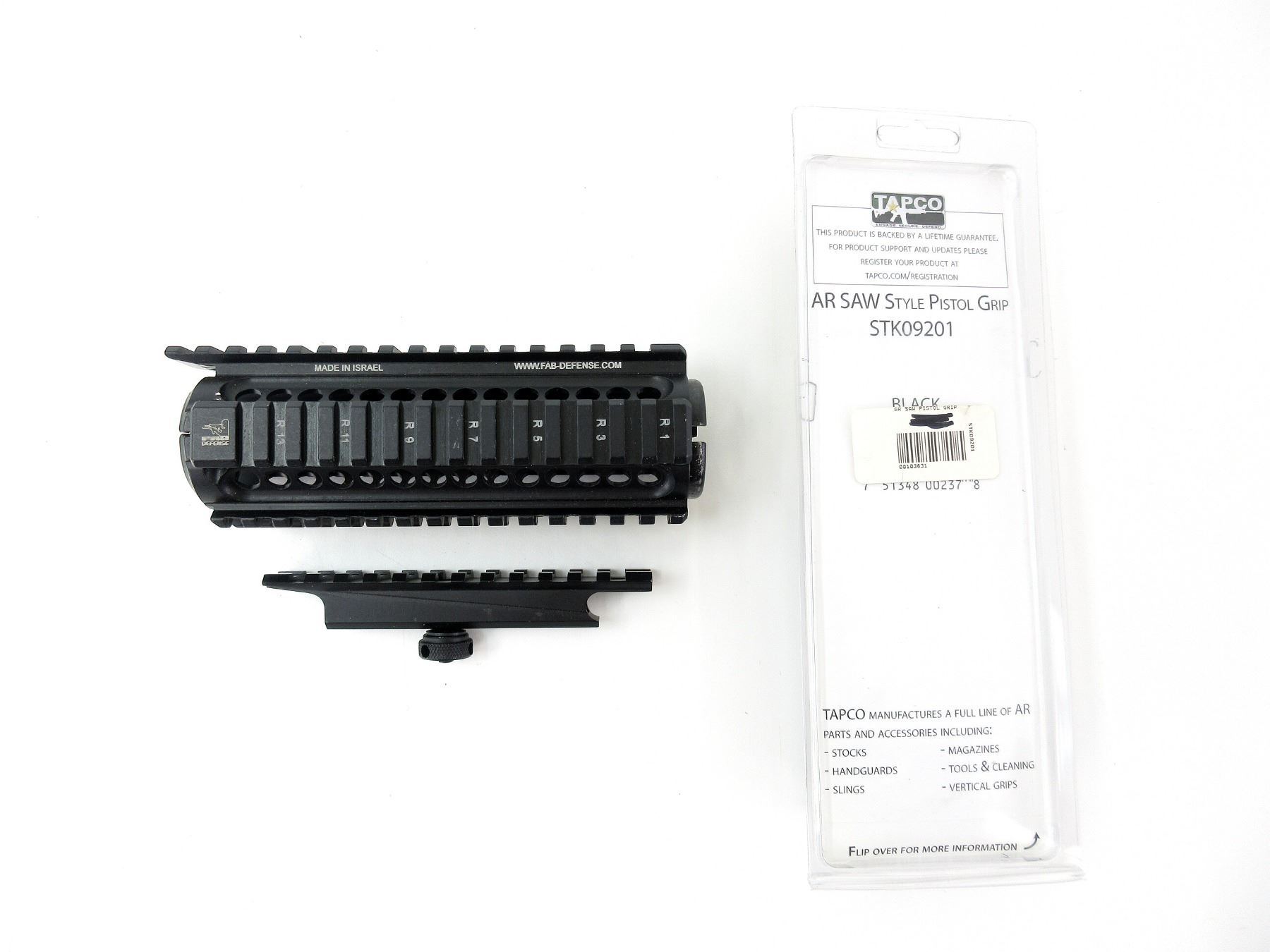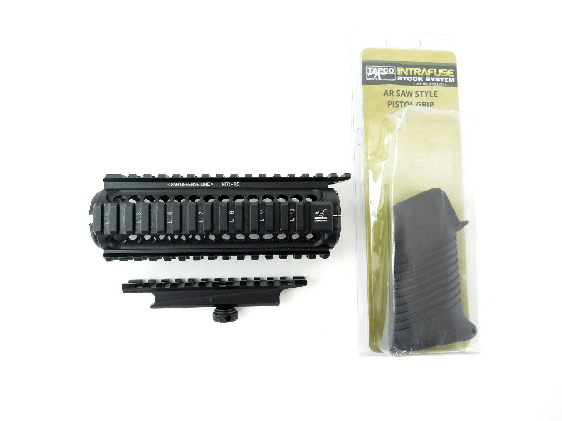LOT INCLUDES; (1) FAB DEFENSE LINE QUAD RAIL 2-PIECE HAND GUARD, BLACKENED ALUMINIUM, MARKED: "NFR-RS", OAL APPROX. 7", (1) A2 SCOPE MOUNT RAIL, BLACKENED METAL, OAL APPROX. 5.25" & (1) TAPCO INTRAFUSE AR SAW STYLE PISTOL GRIP, BLACK POLYMER, PART #: STK09201, APPEARS NOS, IN ORIGINAL PACKAGING, OAL APPROX 4 3/8". MAY REQUIRE FITTING. SEE PHOTOS.