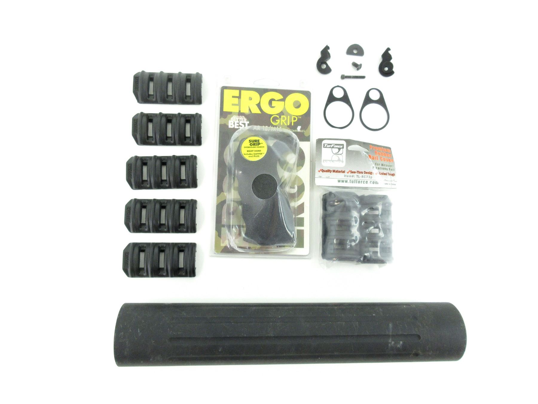 LOT INCLUDES; (1) HANDGUARD, BLACK ALUMINUM CONSTRUCTION, UNMARKED, OAL APPROX. 12.75", (1) ERGO GRIP AR15 / M16, RIGHT HANDED, BLACK RUBBER CONSTRUCTION, WITH ORIGINAL PACKAGING, OAL APPROX. 4.25", (9) TUFFORCE RAIL COVERS, BLACK RUBBER CONSTRUCTION, FOR WEAVER / PICATINNY RAILS, ETC. MAY REQUIRE FITTING. SEE PHOTOS.