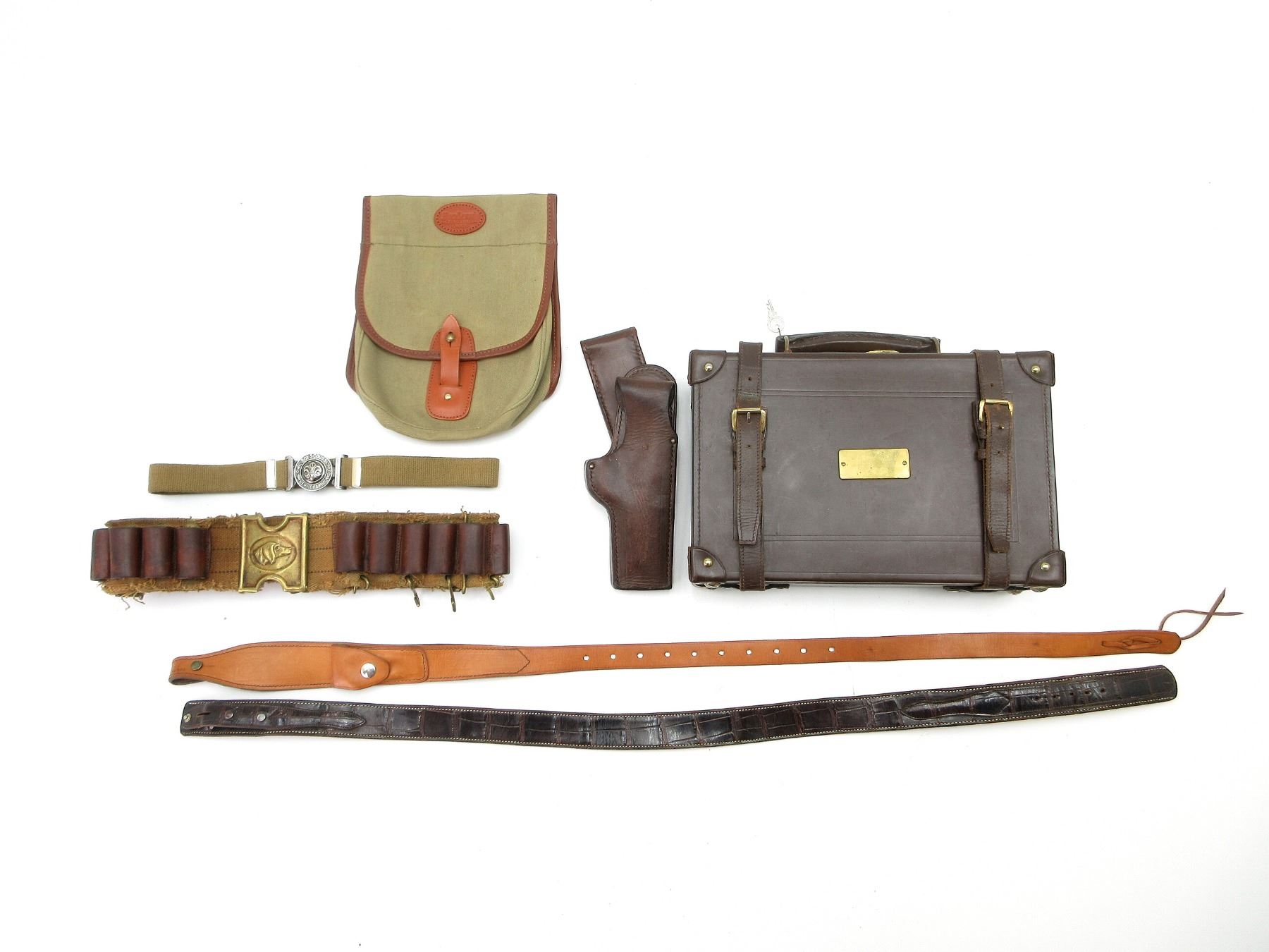 LOT INCLUDES; (1) SHOTGUN AMMO BELT, CANVAS / LEATHER CONSTRUCTION, WITH BRASS BELT BUCKLE, 24 LEATHER LOOPS, FITS 12 GAUGE SHOTGUN SHELLS, SHOWS WEAR & TEAR, ADJUSTABLE OAL APPROX. 32", (1) BOY SCOUTS BELT, CANVAS CONSTRUCTION, METAL BELT BUCKLE, ADJUSTABLE, OAL APPROX. 30", (1) UNKNOWN BROWN LEATHER BELT, UNMARKED, OAL APPROX. 36", (1) BROWN LEATHER HOLSTER, RIGHT HANDED, OAL APPROX. 8.5", (1) BROWN LEATHER PADDED CASE, WITH VARIOUS FABRIC LINED COMPARTMENTS, STRAP CLOSURES, WITH LOCK, APPROX. 13.75" X 9" X 3.75", ETC. SEE PHOTOS.