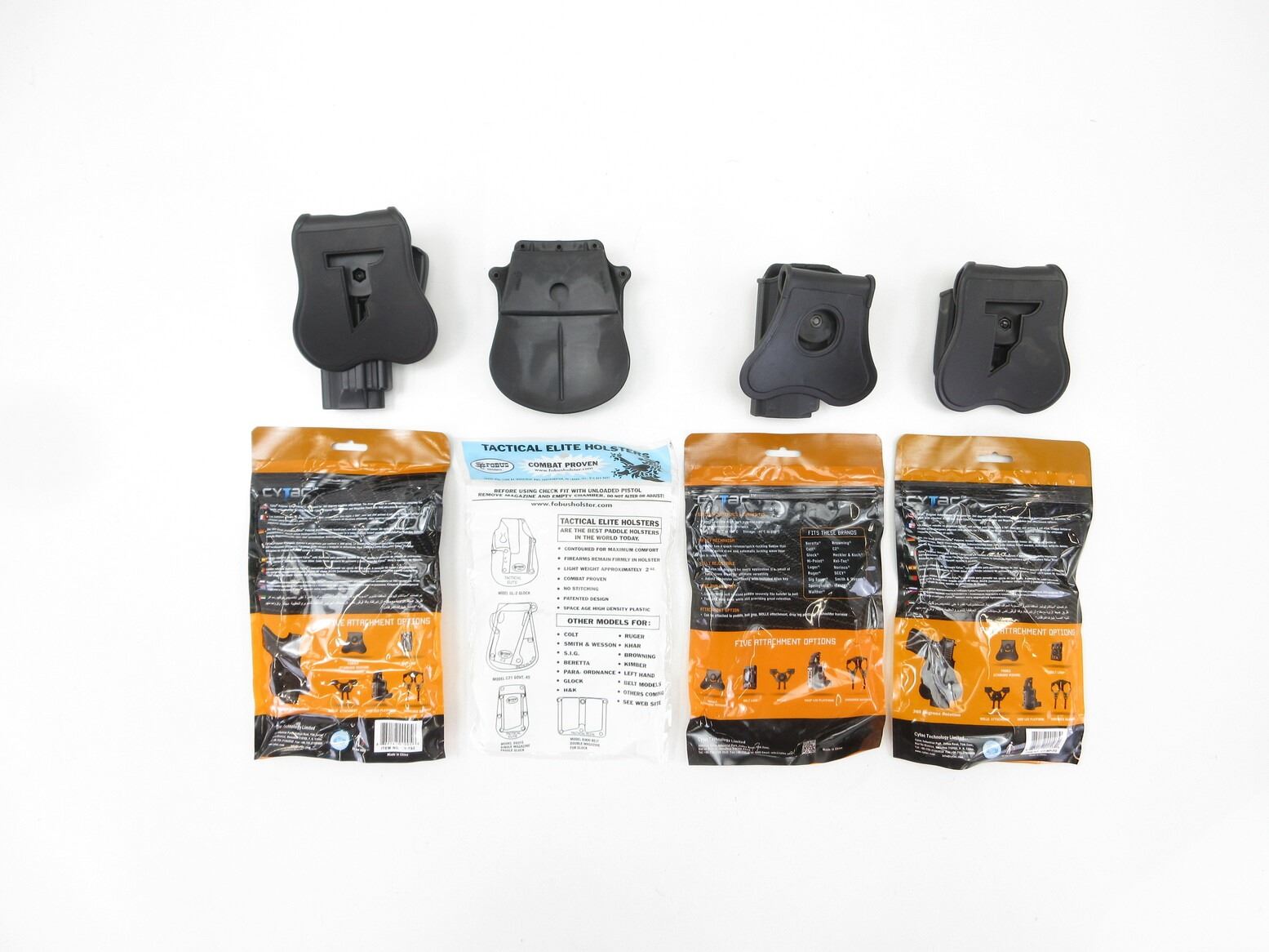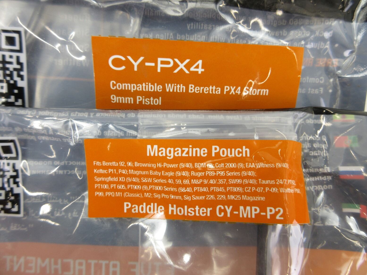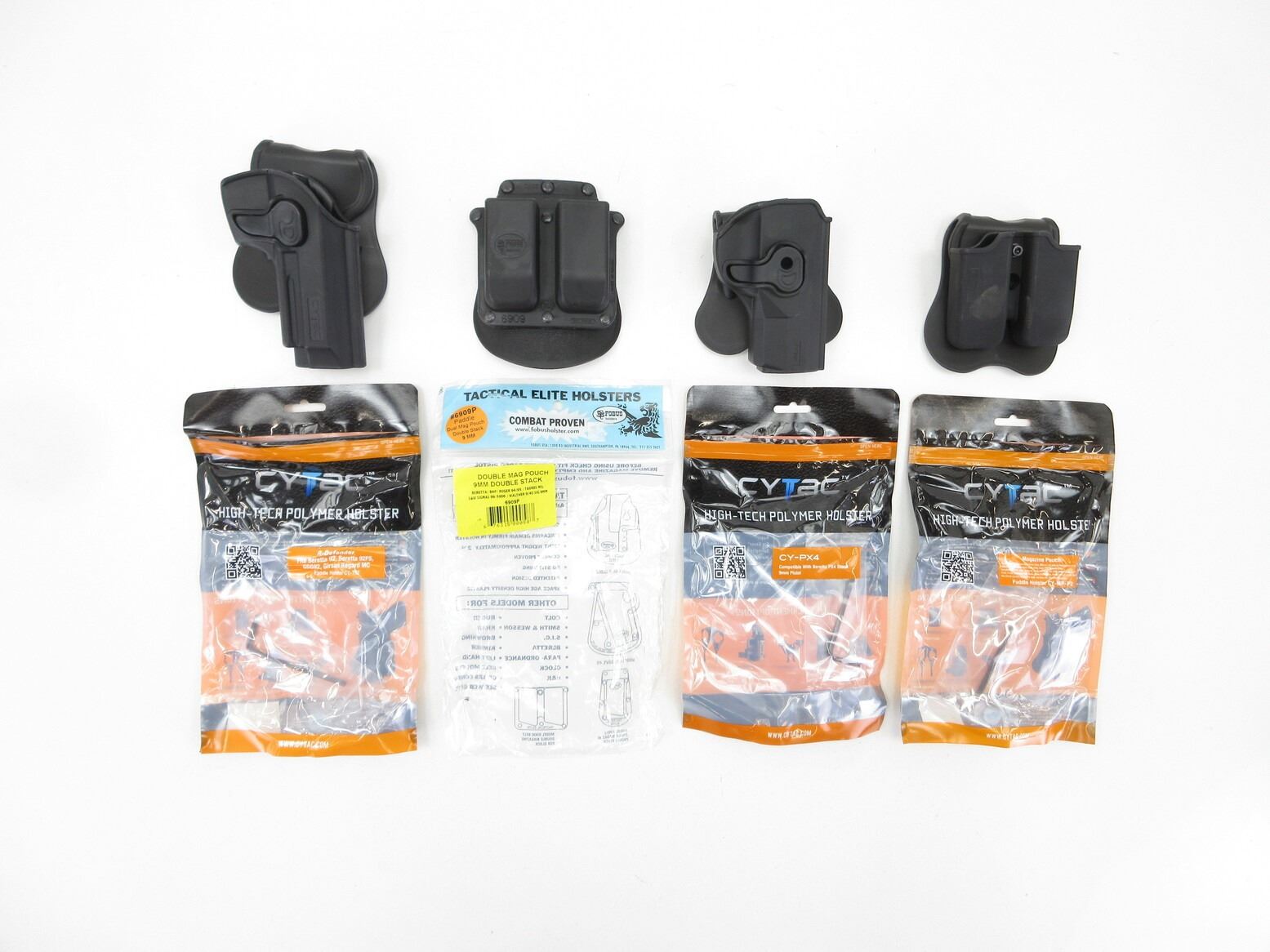 ASSORTED BERETTA PISTOL HOLSTERS AND MAG POUCHES LOT. LOT INCLUDES; (1) CYTAC CY-PX4 PISTOL HOLSTERS, FITS BERETTA PX4 STORM 9MM PISTOLS, RIGHT HANDED, BLACK POLYMER, NOS, UNOPENED, (1) CYTAC R-DEFENDER PISTOL HOLSTER, FITS BERETTA92, 92FS, GSG92, GIRSAN REGARD MC, PADDLE STYLE, RIGHT HANDED, NOS, UNOPENED, (1) CYTAC DOUBLE MAGAZINE POUCH, FITS BERETTA 92, 96, BROWNING HI-POWER, COLT 2000, ETC., PADDLE STYLE, BLACK POLYMER CONSTRUCTION, NOS, (1) TACTICAL ELITE HOLSTERS DOUBLE MAGAZINE POUCH, 9MM DOUBLE STACK, FITS BERETTA, BHP, RUGER 94 / 95, TAURUS MIL, S&W SIGMAS 99 ETC., PADDLE STYLE, BLACK POLYMER CONSTRUCTION, NOS, UNOPENED. SEE PHOTOS.