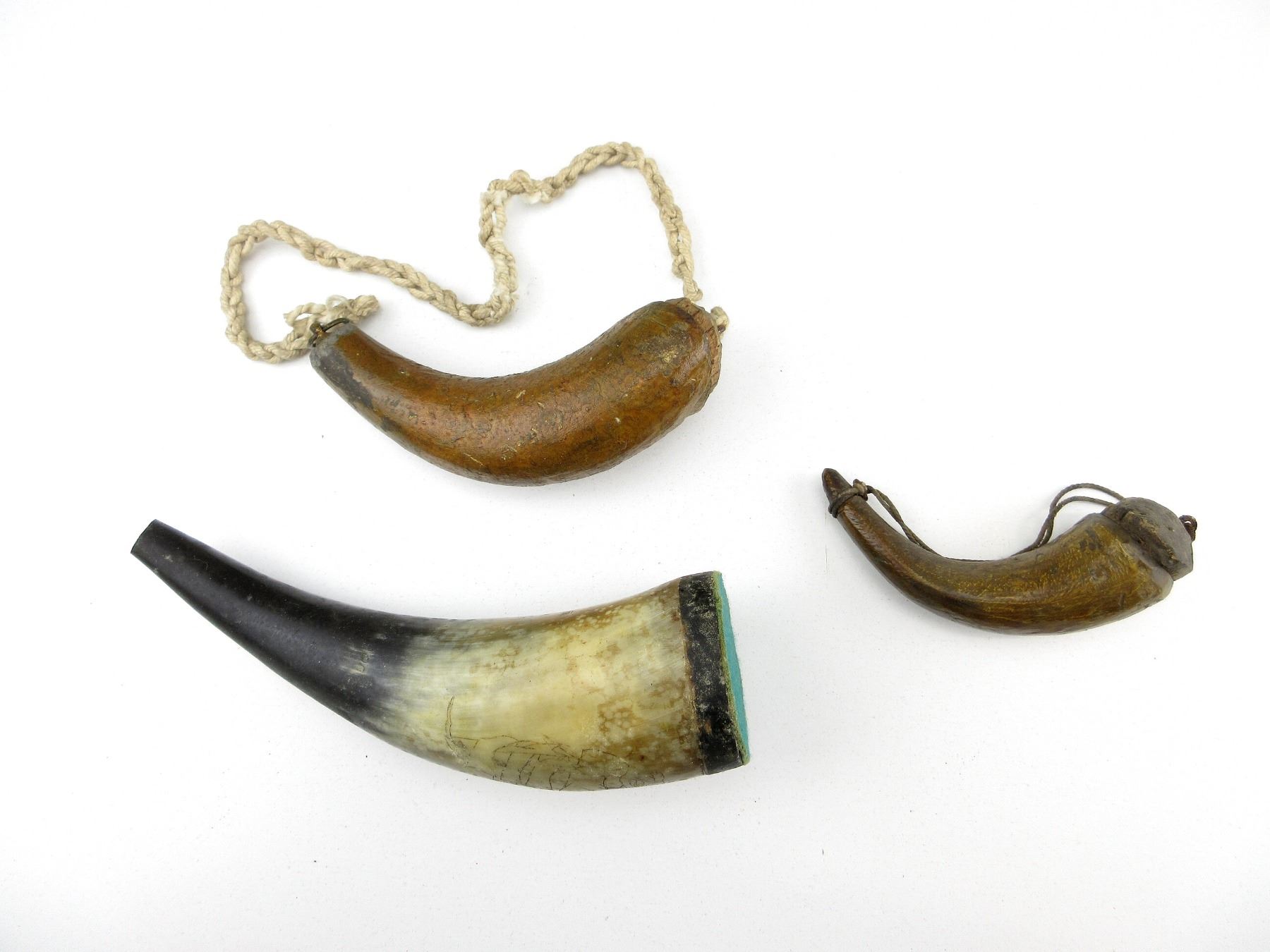 LOT INCLUDES; (1) LARGE BLACK POWDER HORN, MISSING CAP, ETCHED WITH BOAT DESIGN, OAL APPROX. 8 3/8", (1) MEDIUM BLACK POWDER HORN, WITH CAP & ROPE THONG, OAL APPROX. 5.75" & (1) SMALL BLACK POWDER HORN, WITH CAP & ROPE THONG, OAL APPROX. 4.75". SEE PHOTOS.