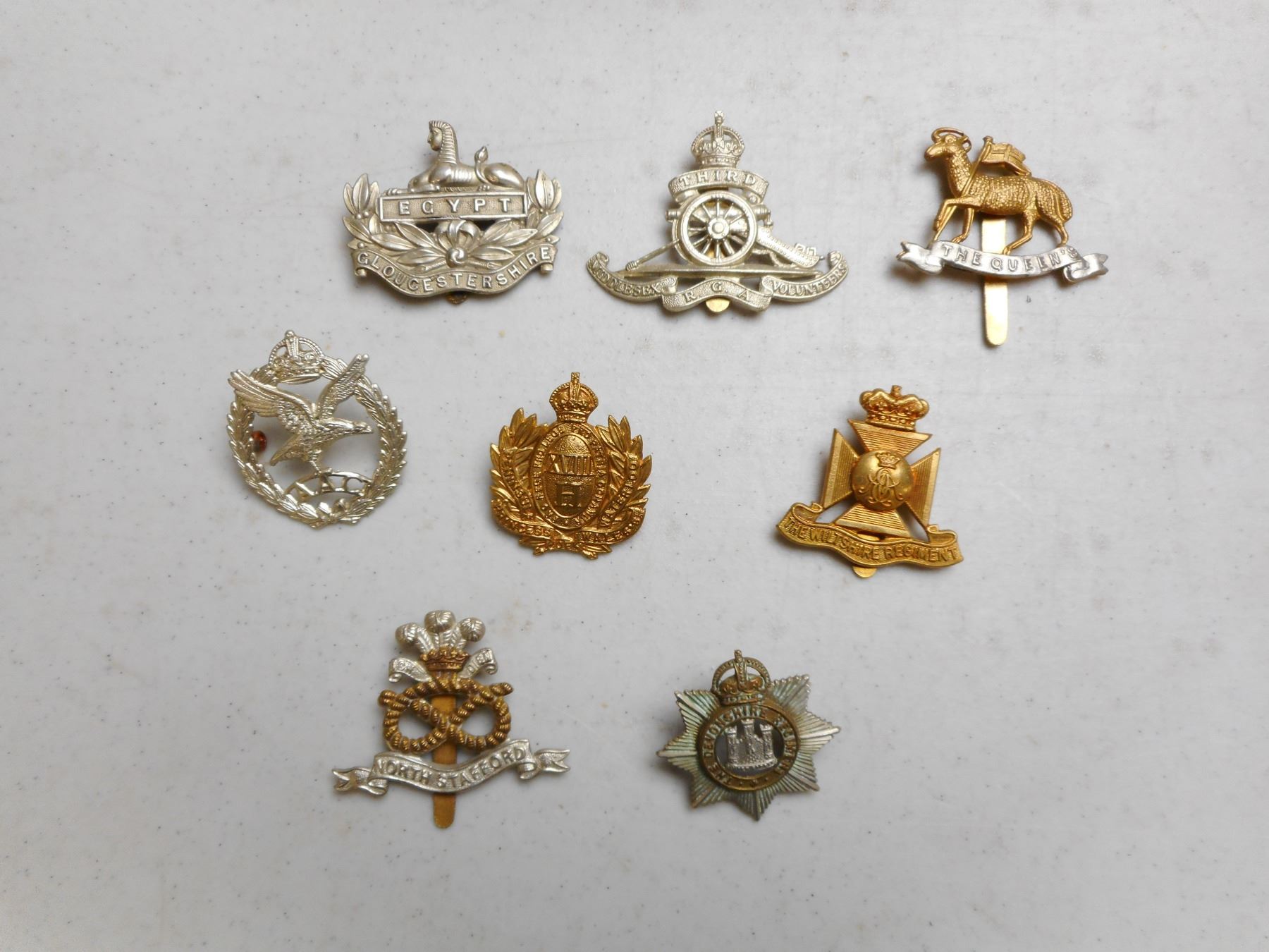 ASSORTED BRITISH ARMY CAP BADGES , INCLUDES GLOUCESTERSHIRE, NORTH STAFFORD, PRINCESSS OF WALES, THE DEVONSHIRE REGIMENT, THIRD MIDDLESEX VOLUNTEERS, THE WILTSHIRE REGIMENT, THE QUEEN'S, ARMY AIR CORPS