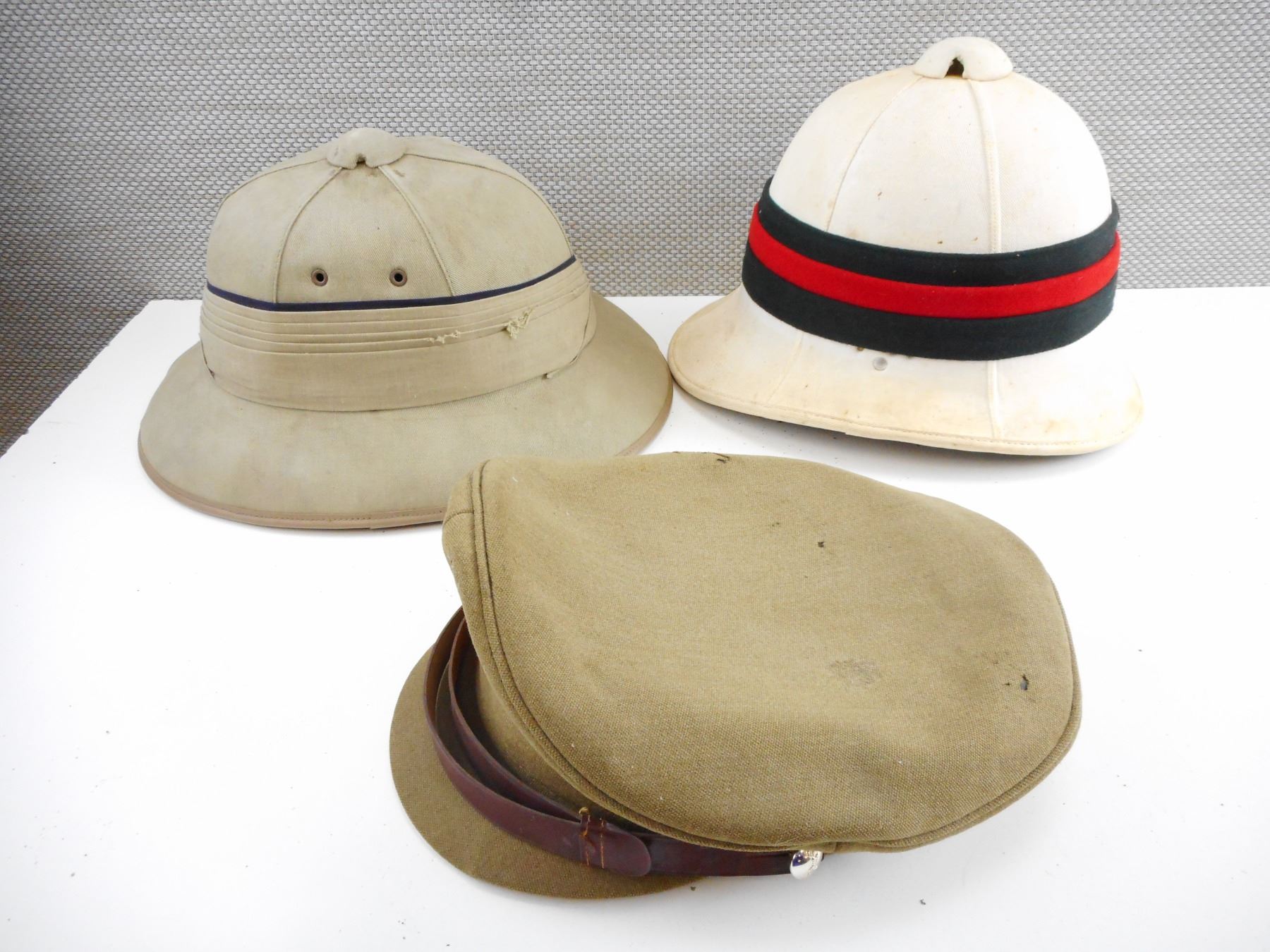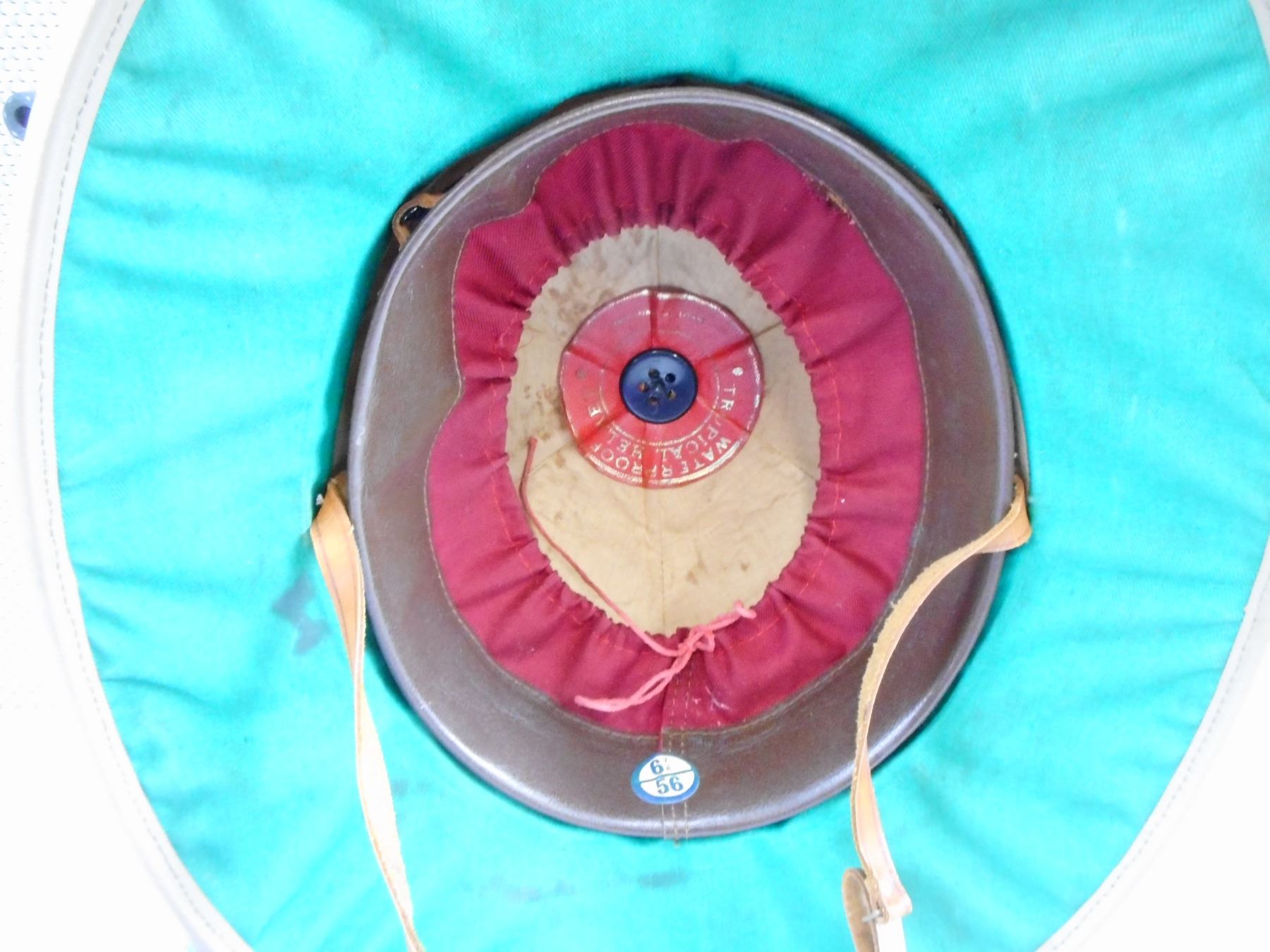 ASSORTED BRITISH/CANADIAN HELMETS , (1) MARKED WATERPROOF TROPICAL HELMET, SIZE 6 7/8/56. (1) MARKED MADE IN ENGLAND (1) CANADIAN CAP, FROM WILLIAM SCULLY SIZE 7