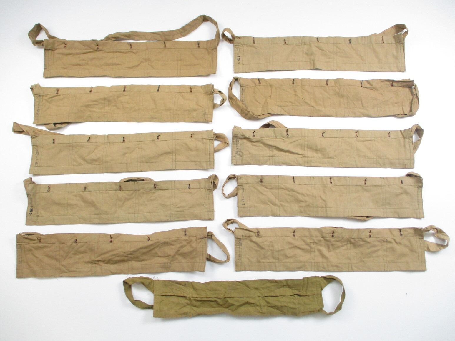 ASSORTED CANADIAN MILITARY BANDOLIER LOT. (11) TAN COTTON, 5 & 6 POCKETS, VARIOUS MARKINGS, DATED: 1945, ETC., C-BROAD ARROWS, ETC. SEE PHOTOS.