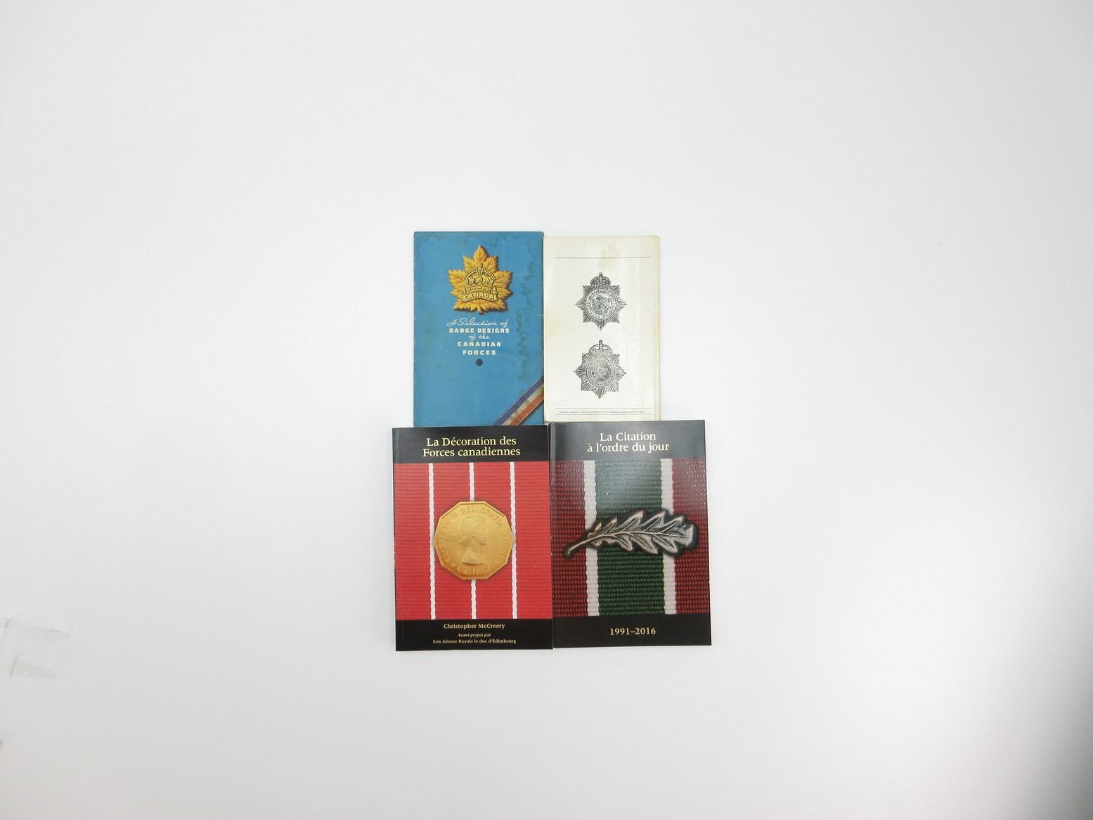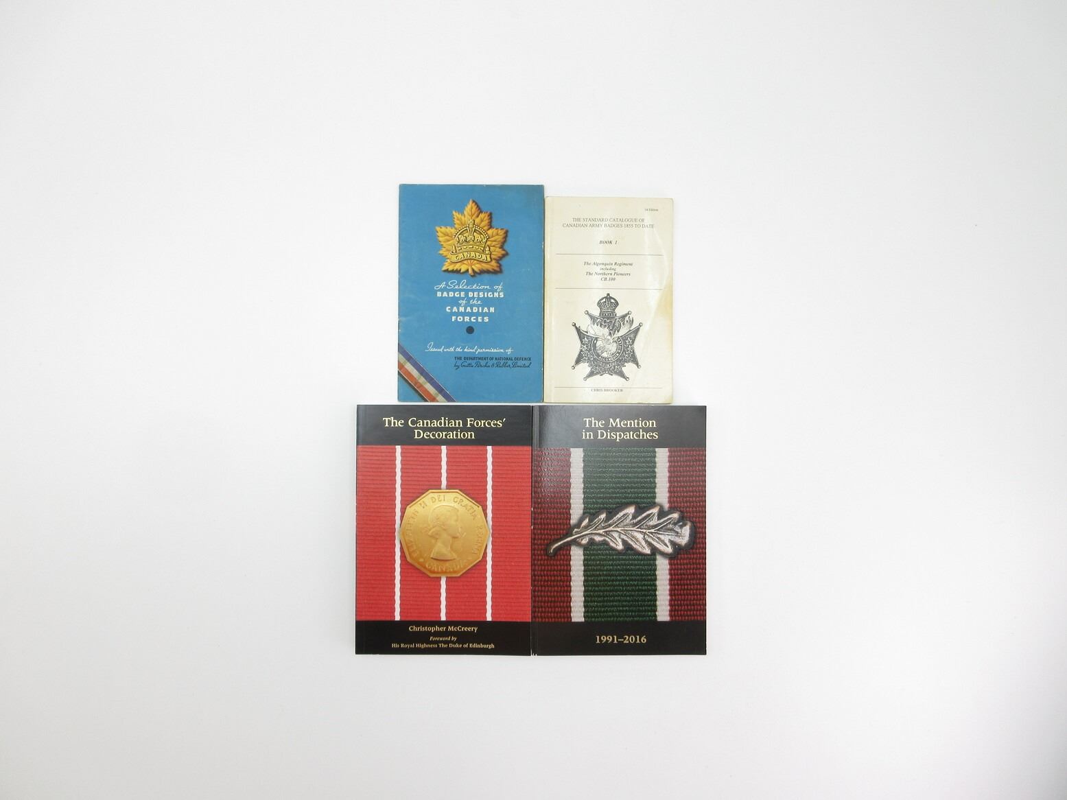 LOT INCLUDES; (1) "THE STANDARD CATALOGUE OF CANADIAN ARMY BADGES 1855 TO DATE, BOOK I, THE ALGONQUIN REGIMENT INCLUDING THE NORTHERN PIONEERS CB.100" BOOK BY CHRIS BROOKER, SOFT COVER, COPYRIGHT 1996, (1) "THE MENTION IN DISPATCHES, 1991-2016" BOOK, SOFT COVER, IN ENGLISH / FRENCH, ISBN: 978-0-660-03381-5, (1) "THE CANADIAN FORCES' DECORATION" BOOK BY CHRISTOPHER MCCREERY, SOFT COVER, IN ENGLISH / FRENCH & (1) "A SELECTION OF BADGE DESIGNS OF THE CANADIAN FORCES" BOOKLET, POSSIBLY WATER DAMAGE(?). SEE PHOTOS.