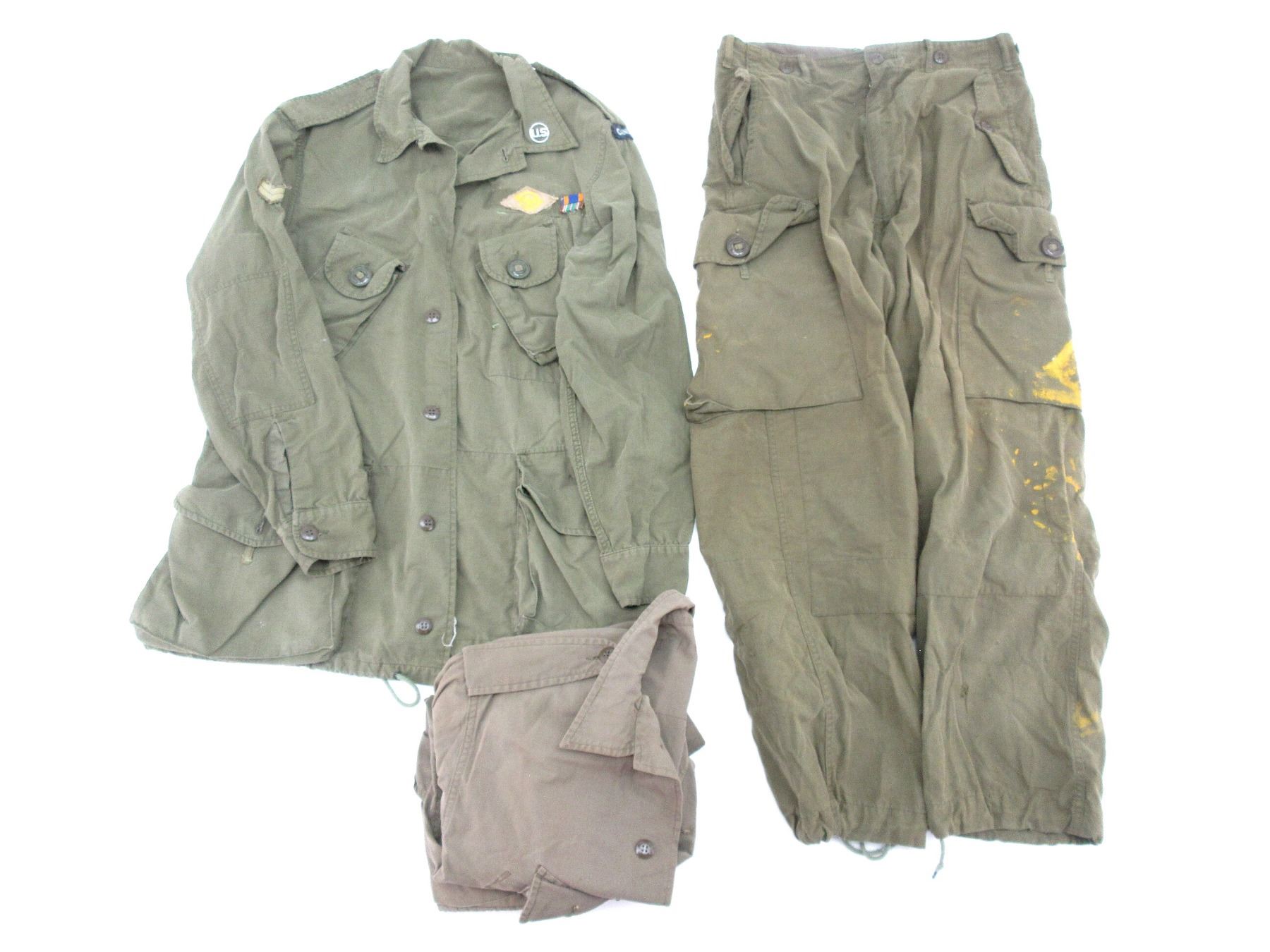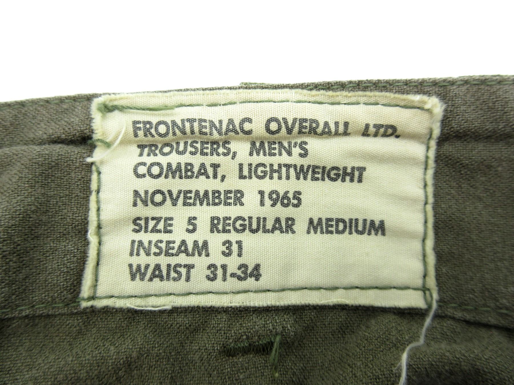 LOT INCLUDES; (1) CANADIAN MILITARY GREEN CANVAS COMBAT PANTS, MARKED: "FRONTENAC OVERALL LTD., TROUSERS, MEN'S COMBAT, LIGHTWEIGHT, NOVEMBER 1965, SIZE 5 REGULAR MEDIUM, INSEAM 31, WAIST 31-34", ZIPPERED-FLY (WORKS), SHOWS AGE / WEAR, (1) CANADIAN MILITARY GREEN CANVAS COMBAT SHIRT, MARKED: "BEACON UNIFORM CO. LTD., SHIRT-COAT, MAN'S COMBAT G.S., NYLON-COTTON TWIST, MARCH 1963, SIZE: 8 TALL MEDIUM", BUTTON FRONT, ONE BUTTON MISSING, SHOWS WEAR / SLIGHT TEARS & (1) CANADIAN / U.S. MILITARY GREEN CANVAS COMBAT SHIRT, MARKED: "FRONTENAC OVERALL LIMITED, SHIRT, COAT, MEN'S COMBAT G.S., AOUT 1966, SIZE 5 REGULAR MEDIUM, HEIGHT: 67.1 TO 71, BREAST: 37.1 TO 41", CANADA SHOULDER BADGE, RANK CHEVRONS, AIRFORCE BADGE, AIR MEDAL RIBBON, UNKNOWN RIBBON, BUTTON FRONT, SHOWS WEAR. SEE PHOTOS.