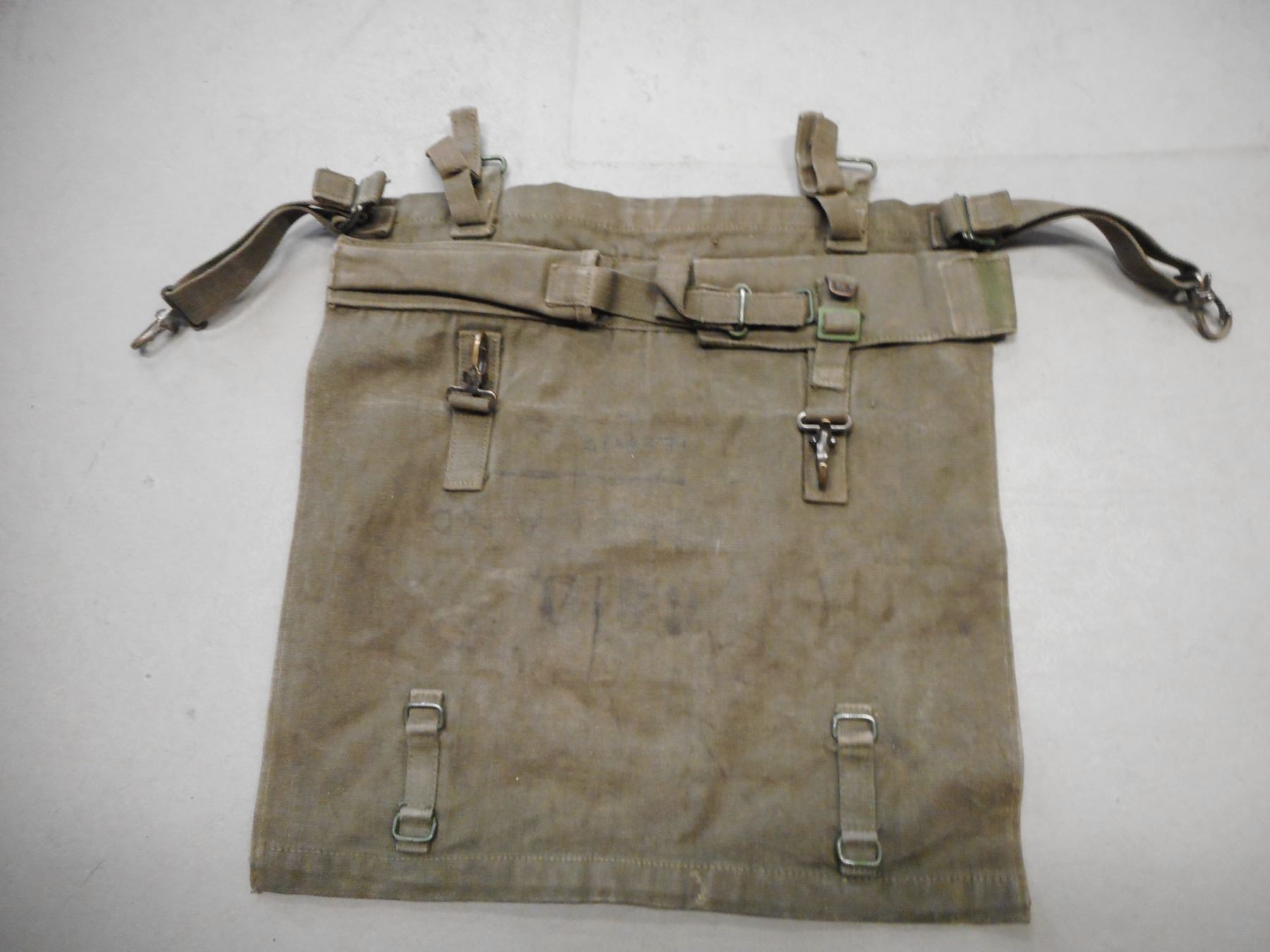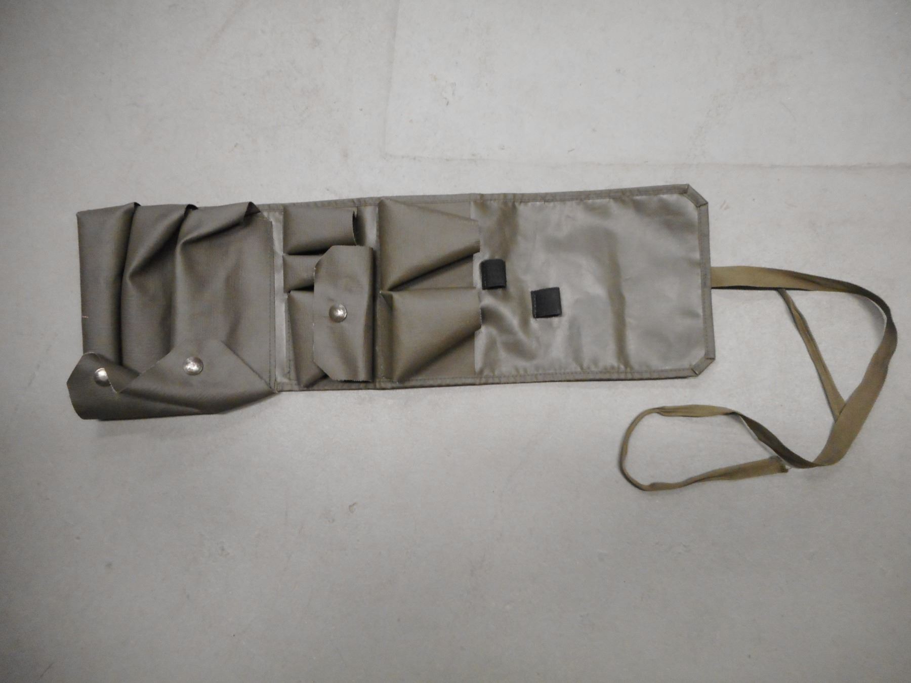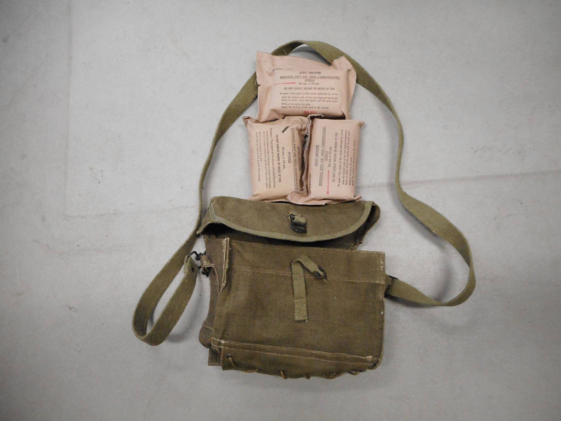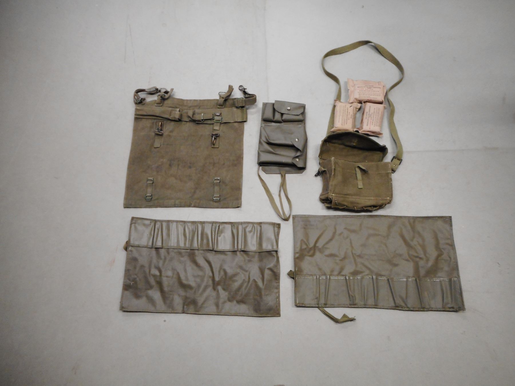 ASSORTED CLEANING EQUIPMENT , (3) EMPTY CLEANING BAGS, (1) CANVAS POUCH WITH 3 FIELD DRESSING (1) BACK PACK CARRIER, MARKED MEDCO 1961 BROAD ARROW. LOT OF 5