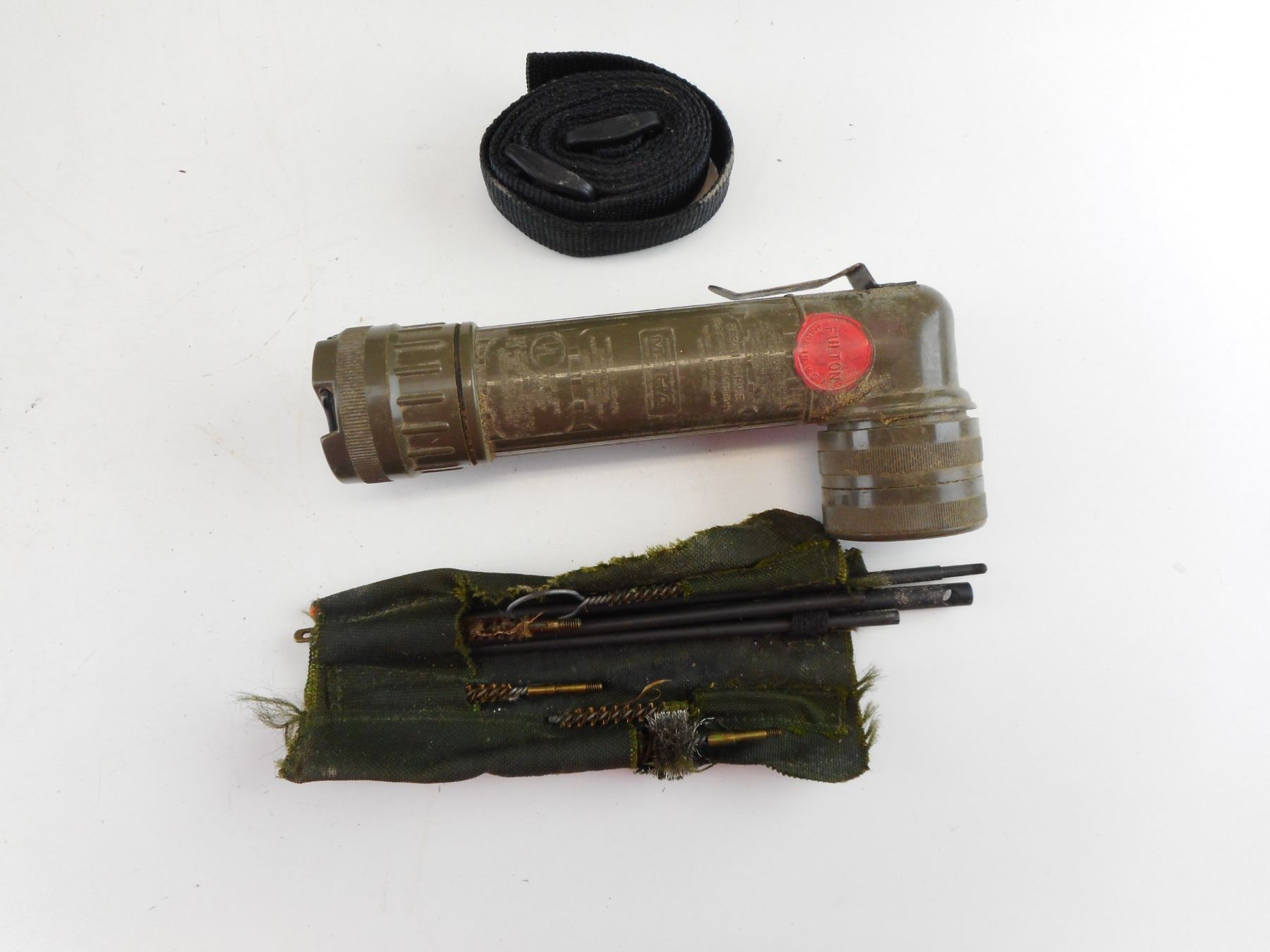 ASSORTED CLEANING SUPPLIES AND ACCESSORIES , (1) INCOMPLETE OUTERS CLEANING KIT (1) INCOMPLETE PHONE (NO BASE). (1) FLASHLIGHT, UNSURE IF IN WORKING CONDITION. (1) AR-15/C7 CLEANING KIT. COMES IN WOODEN AMMO CRATE (NO LID), APPROX. DIMENSIONS 14.75" X 8.75". SEE PHOTO