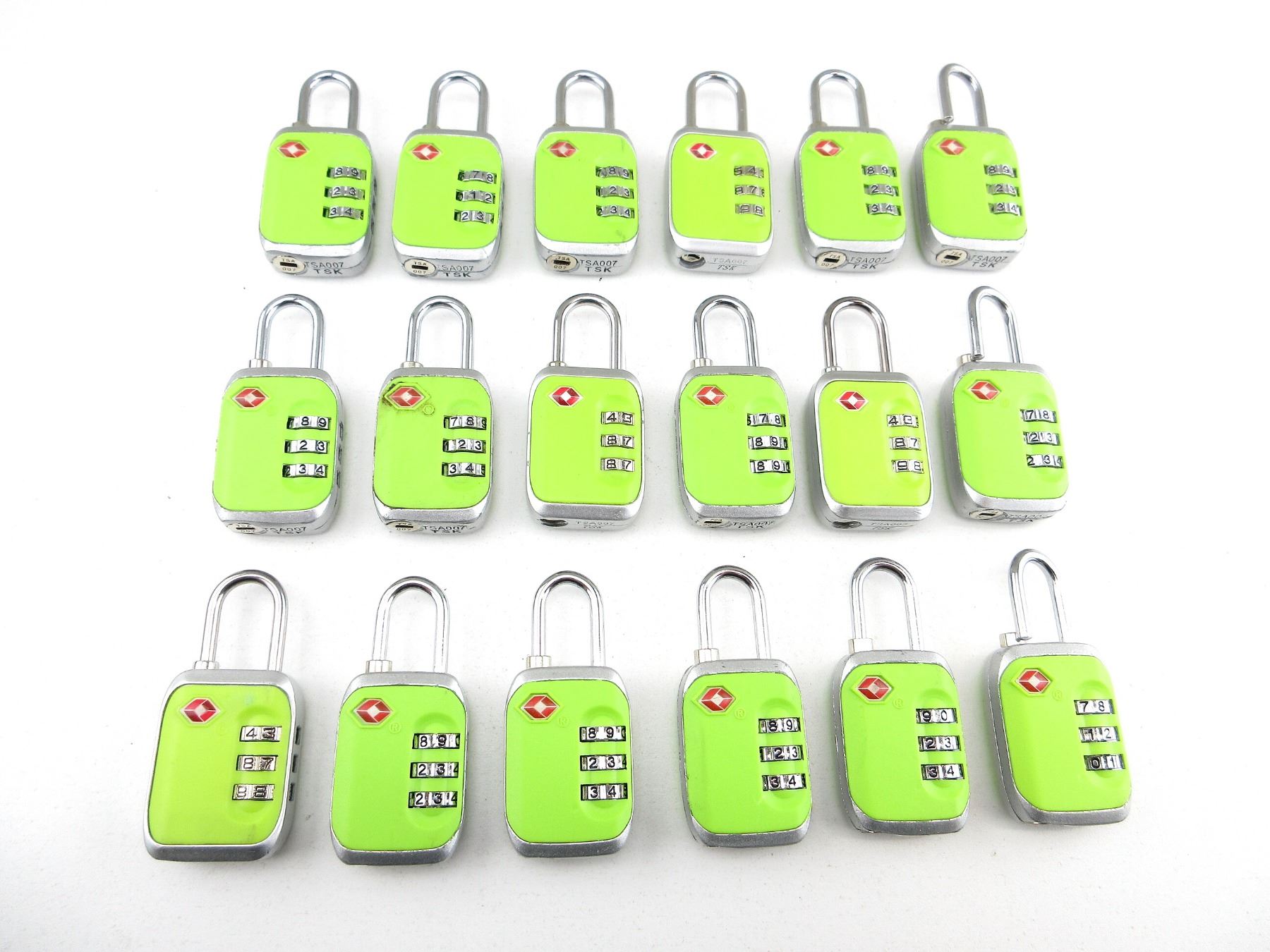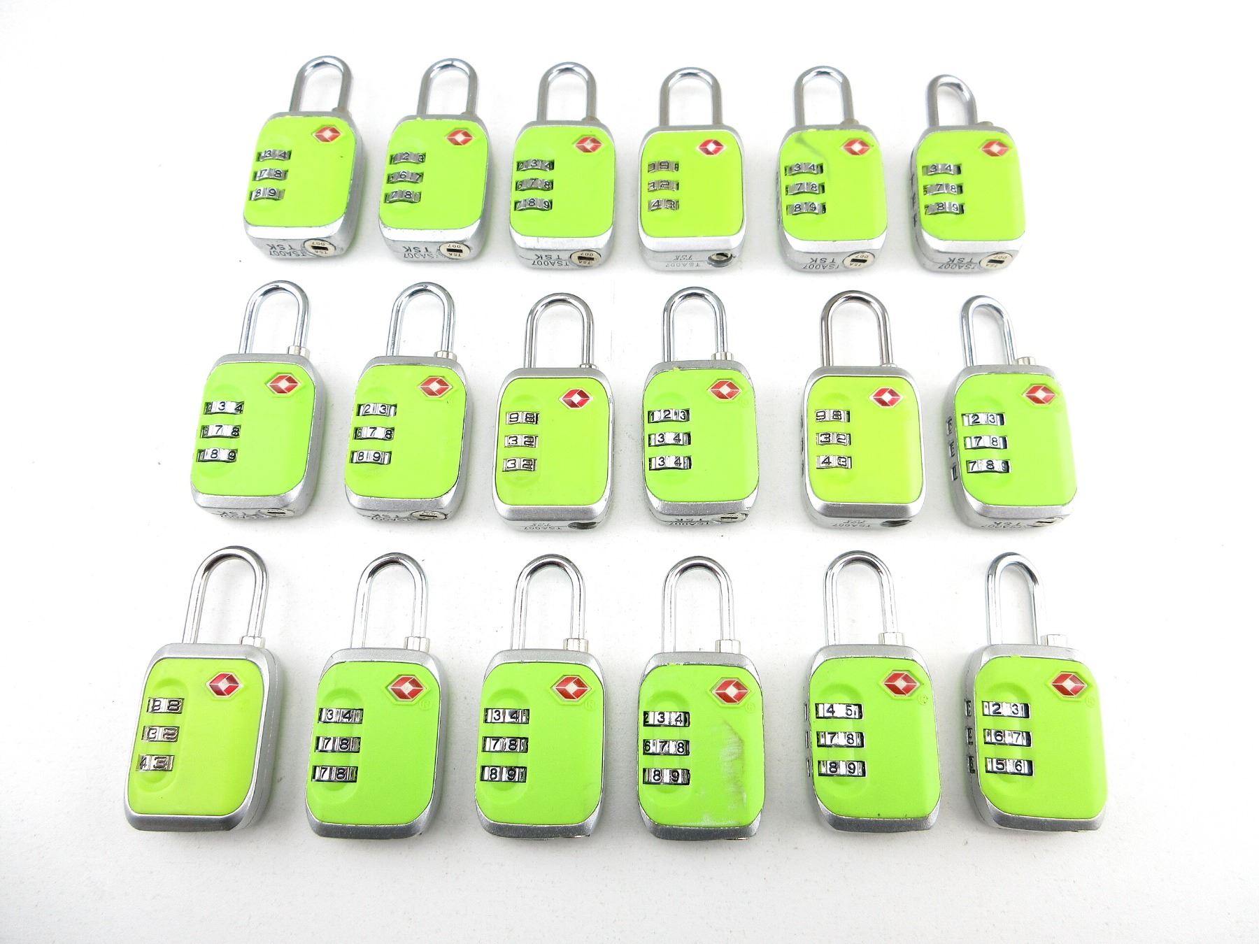LOT INCLUDES; APPROX. (18) COMBINATION LOCKS, NEON GREEN, THREE POSSIBLY DAMAGED. SEE PHOTOS.
