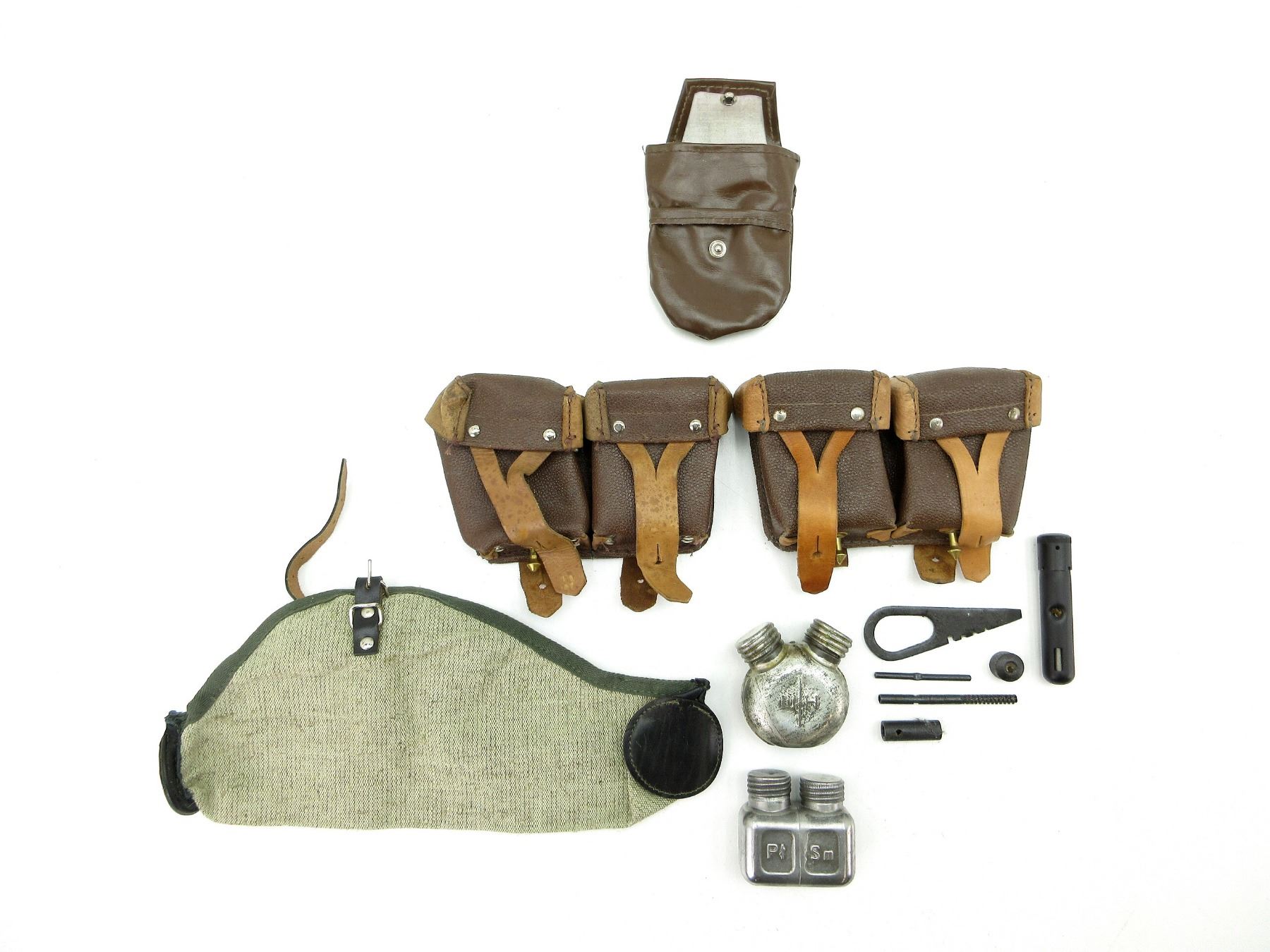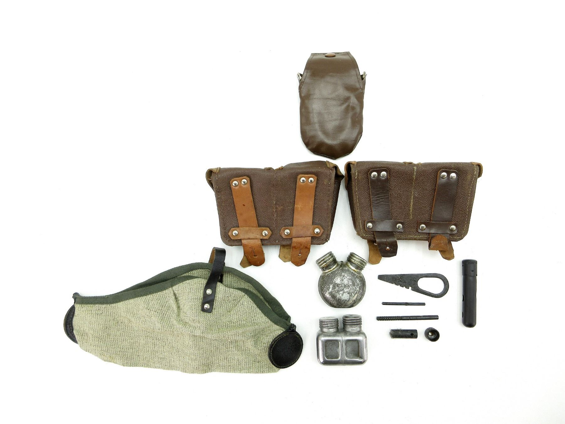 LOT INCLUDES; (2) BROWN LEATHER MOSIN NAGANT AMMO POUCHES, VARIOUS INK STAMPS / MARKINGS, BRASS / METAL FITTINGS, TWO LEATHER BELT LOOPS, (2) STEEL DOUBLE-SPOUTED OILERS, VARIOUS MARKINS, ONE ROUNDED, ONE RECTANGULAR, (1) BROWN LEATHER OILER POUCH, INK STAMP MARKING, (1) MOSIN NAGANT CLEANING KIT WITH COMBO TOOL, JAG, MUZZLE GUIDE, ETC., (1) GREEN CANVAS & LEATHER RIFLE SCOPE COVER, NO VISIBLE MARKINGS, OAL APPROX. 13" & (1) CLEANING KIT, FITS VARIOUS COMBLOC STYLE RIFLES, LID STUCK ON, COMES WITH BRUSH, JAG, PIN PUNCH & COMBO TOOL. SEE PHOTOS.