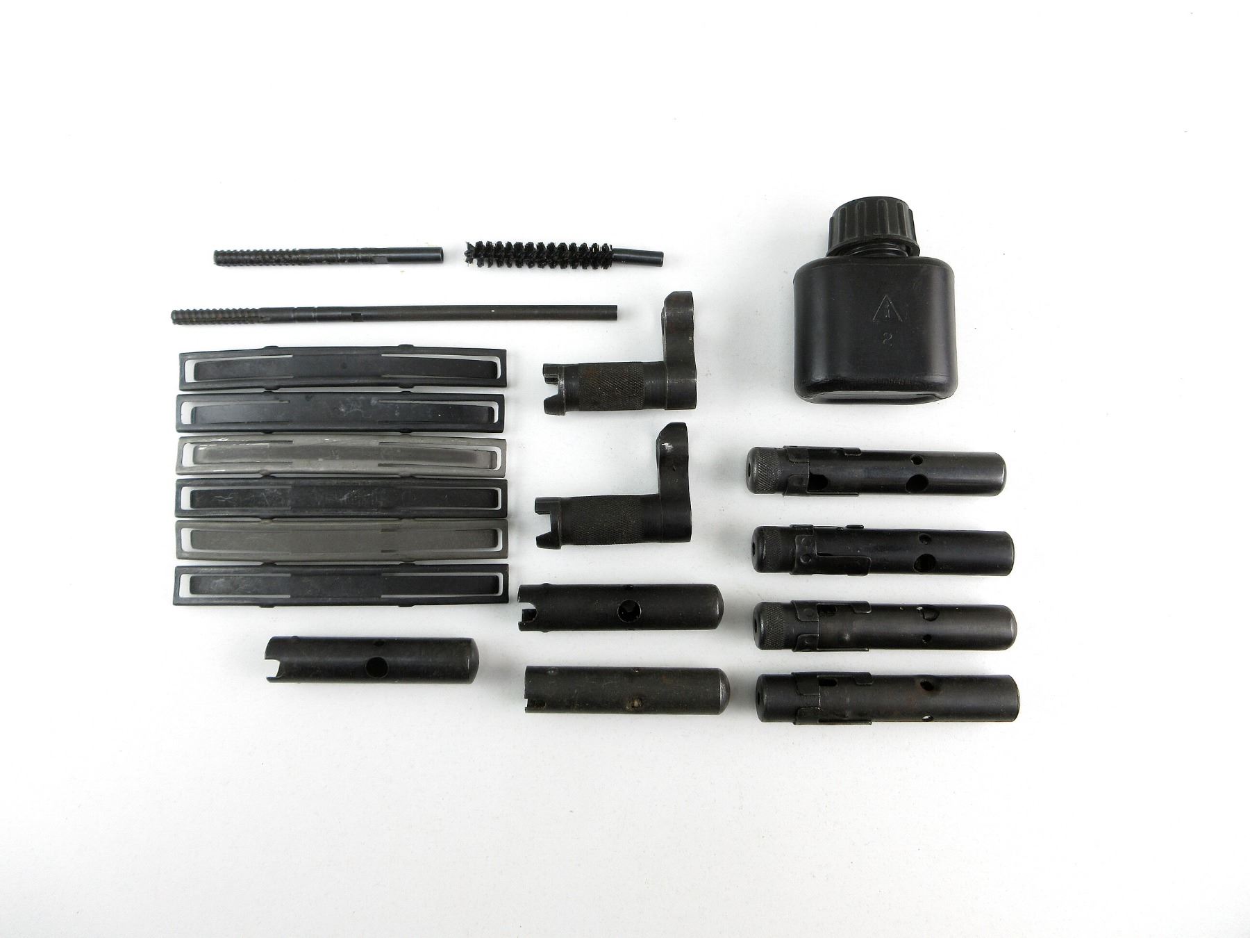 LOT INCLUDES; (6) 7.62X39MM 10-RND STRIPPER CLIPS, STEEL / BLUED STEEL, VARIOUS MARKINGS, (4) SKS METAL CLEANING KIT CONTAINERS (EMPTY), TWO MISSING CAPS, (3) SKS CLEANING KITS WITH JAG, WIRE BRUSH & PIN PUNCH, ONE MISSING CAP, (2) METAL SKS BAYONET GRIPS, ONE WITH PARTIAL PROOF MARK, (1) METAL JAG & (1) BLACK PLASTIC OILER BOTTLE, VARIOUS MARKINGS. SEE PHOTOS.