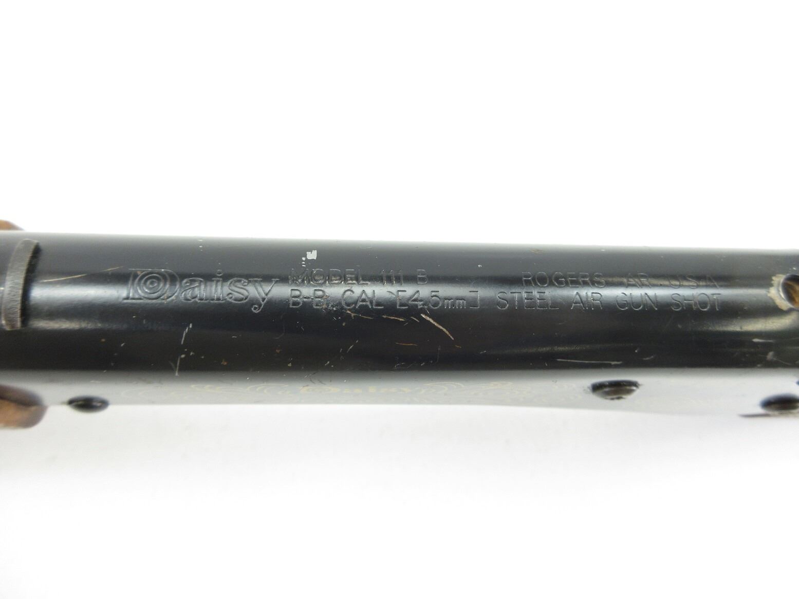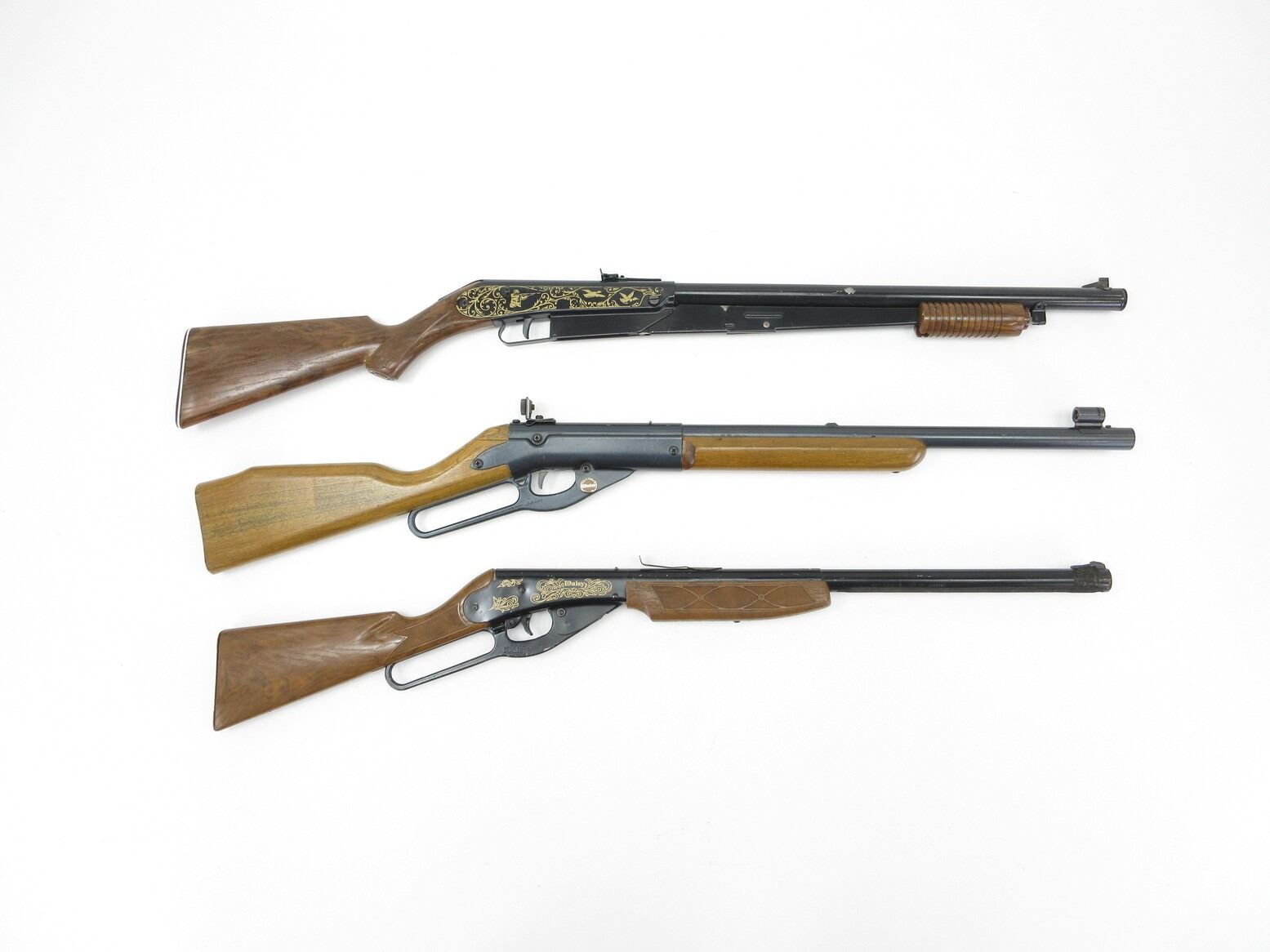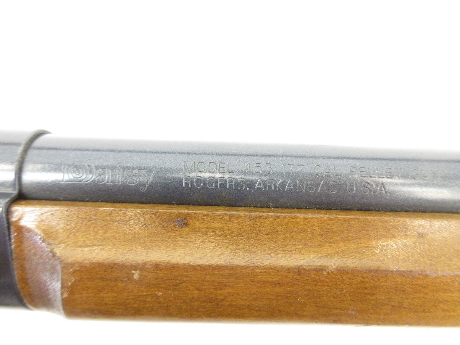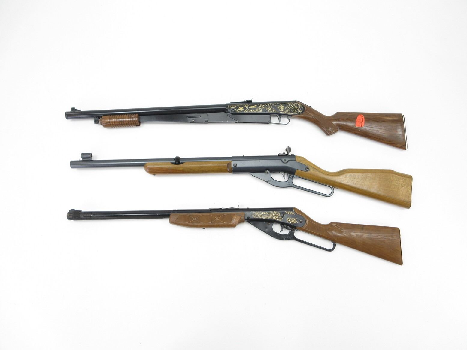 ASSORTED DAISY AIR RIFLES LOT. LOT INCLUDES; (1) DAISY MODEL 453 AIR RIFLE, .177 CAL, AIR / SPRING POWERED, LEVER ACTION, WITH 8 ROUND ROTARY STYLE MAGAZINE, METAL & WOOD CONSTRUCTION, INCLUDES FRONT & REAR SIGHTS, NO COCKING ISSUES, NOT FULLY TESTED, (1) DAISY MODEL 111B .177 / 4.5MM BB, AIR / SPRING POWERED, LEVER ACTION, MAG FED, METAL & POLYMER CONSTRUCTION, WITH FRONT 7 REAR SIGHTS, NO COCKING ISSUES, NOT FULLY TESTED, (1) DAISY MODEL 25 AIR RIFLE, .177 CAL, SPRING / AIR POWERED, PUMP ACTION, METAL & POLYMER CONSTRUCTION, WITH FRONT & REAR SIGHTS, NO COCKING ISSUES, NOT FULLY TESTED. SEE PHOTOS.