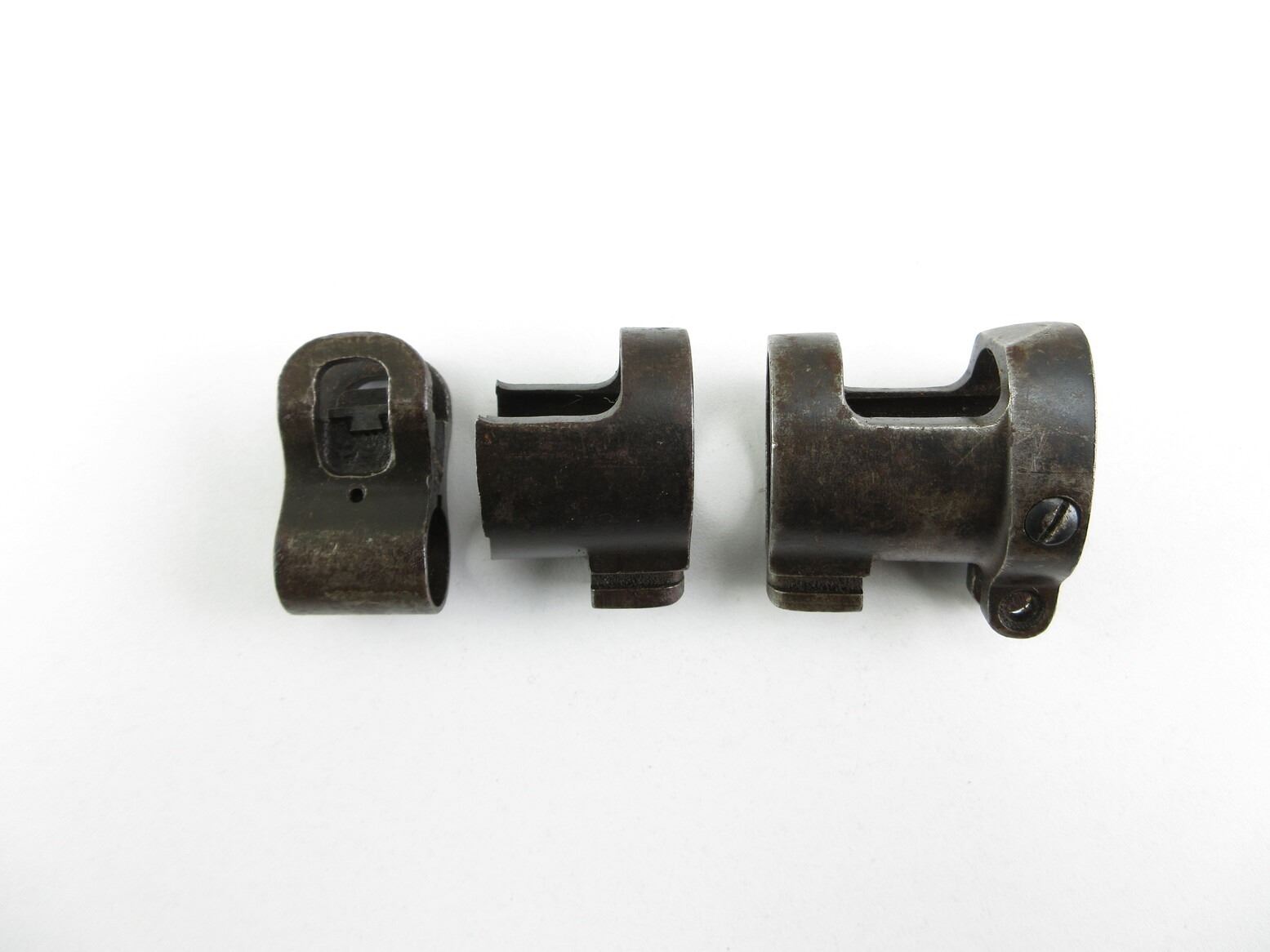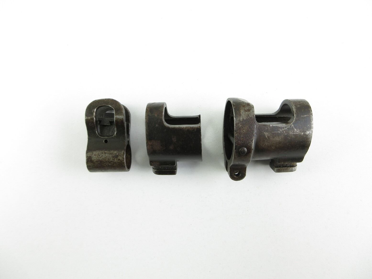 LOT INCLUDES; (2) BARREL BANDS, ONE DAMAGED / CUT OFF, ONE WITH BAYONET LUG, (1) FRONT SIGHT HOOD, WITH FRONT SIGHT. SEE PHOTOS.