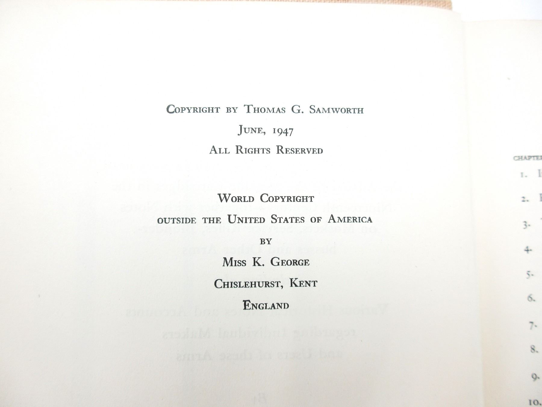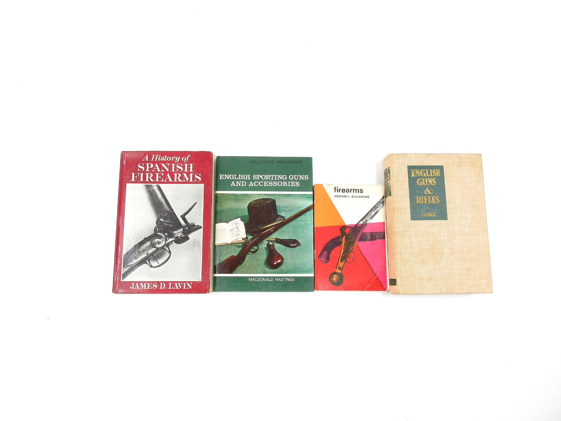 LOT INCLUDES; (1) "A HISTORY OF SPANISH FIREARMS" BOOK, BY JAMES D. LAVIN, HARD COVER WITH DUST COVER, COPYRIGHT 1965, (1) "ENGLISH GUNS & RIFLES" BOOK, BY J. N. GEORGE, HARD COVER, COPYRIGHT 1947, (1) "ENGLISH SPORTING GUNS AND ACCESSORIES" BOOK, BY MACDONALD HASTINGS, HARD COVER WITH DUST COVER, COPYRIGHT 1969, (1) "FIREARMS" BOOK, BY HOWARD L. BLACKMORE, SOFT COVER, COPYRIGHT 1964. SEE PHOTOS.