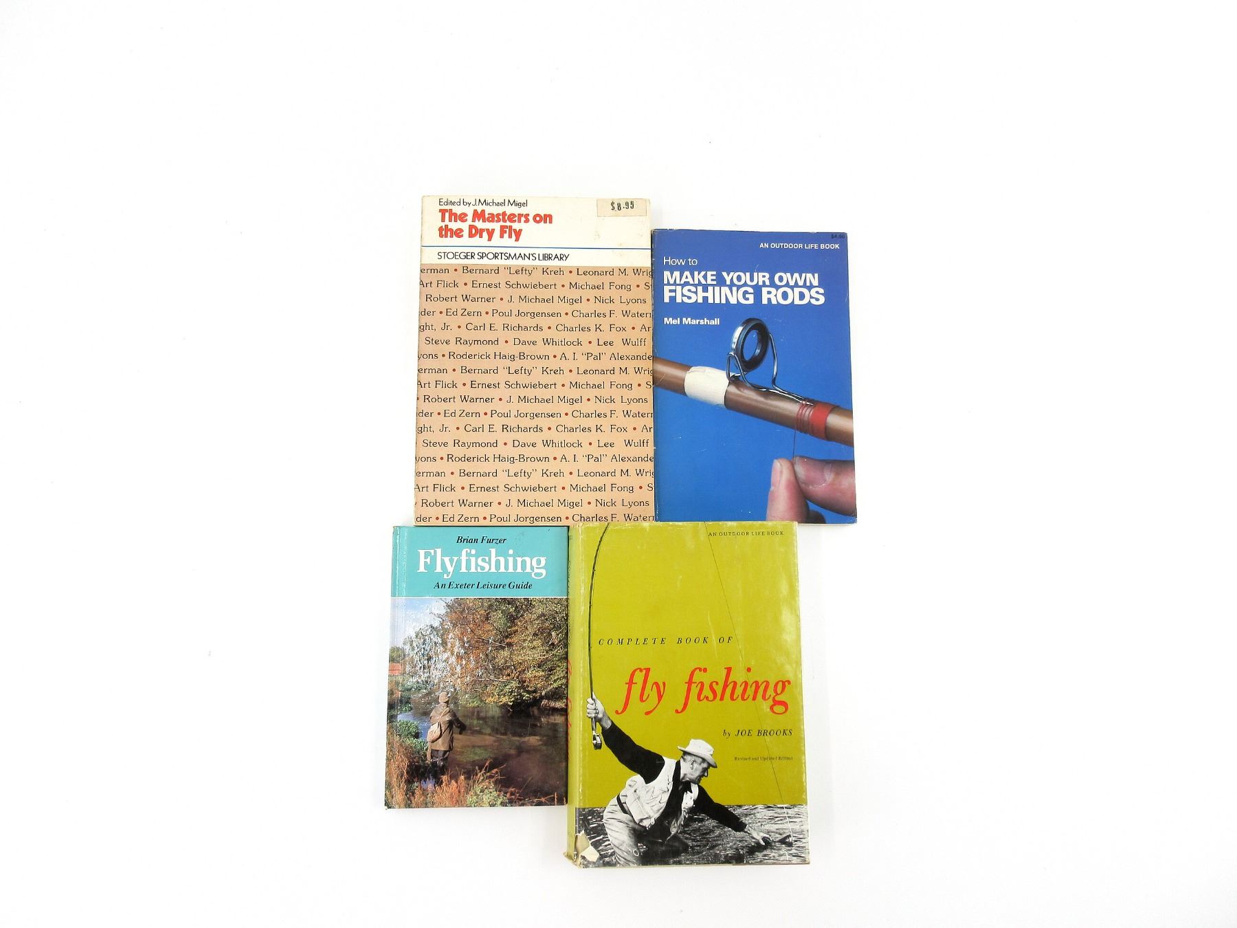 LOT INCLUDES; (1) "THE MASTERS ON THE DRY FLY" BOOK EDITED BY J. MICHAEL MIGEL, SOFT COVER, ISBN: 0-88317-046-9, (1) "HOW TO MAKE YOUR OWN FISHING RODS" BOOK BY MEL MARSHALL, SOFT COVER, COPYRIGHT 1978, (1) "COMPLETE BOOK OF FLY FISHING" BOOK BY JOE BROOKS, HARD COVER WITH DUST COVER, NINETH PRINT, COPYRIGHT 1976 & "FLYFISHING AN EXETER LEISURE GUIDE" BOOK BY BRIAN FURZER, HARD COVER, ISBN: 0-89673-051-4. SEE PHOTOS.