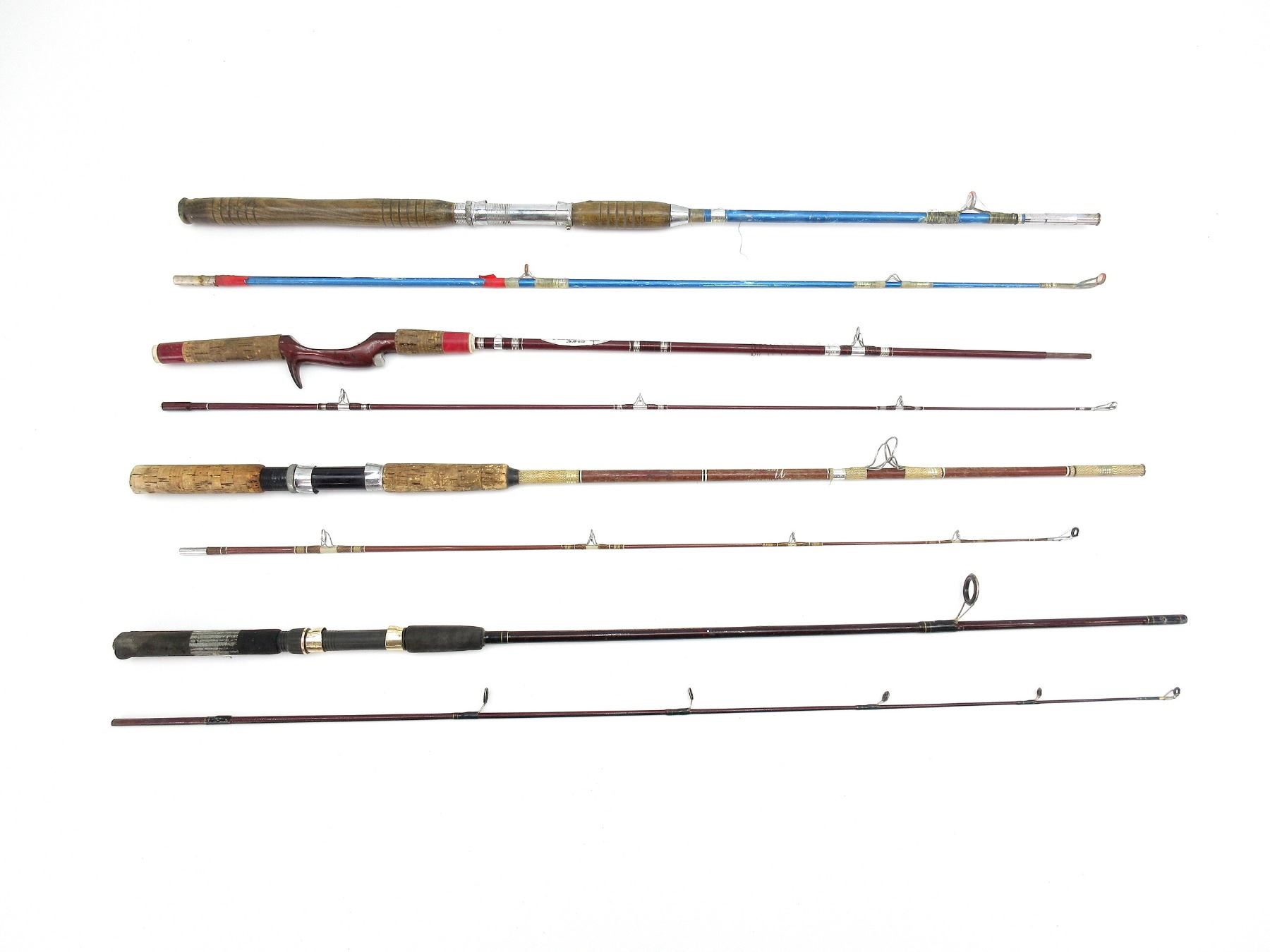 LOT INCLUDES; (4) ASSORTED 2-PIECE FISHING POLLS ONLY, VARIOUS COLOURS / STYLES, OAL APPROX. 81" - 87". SEE PHOTOS.