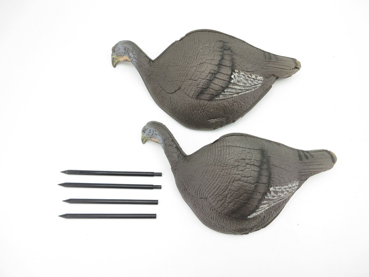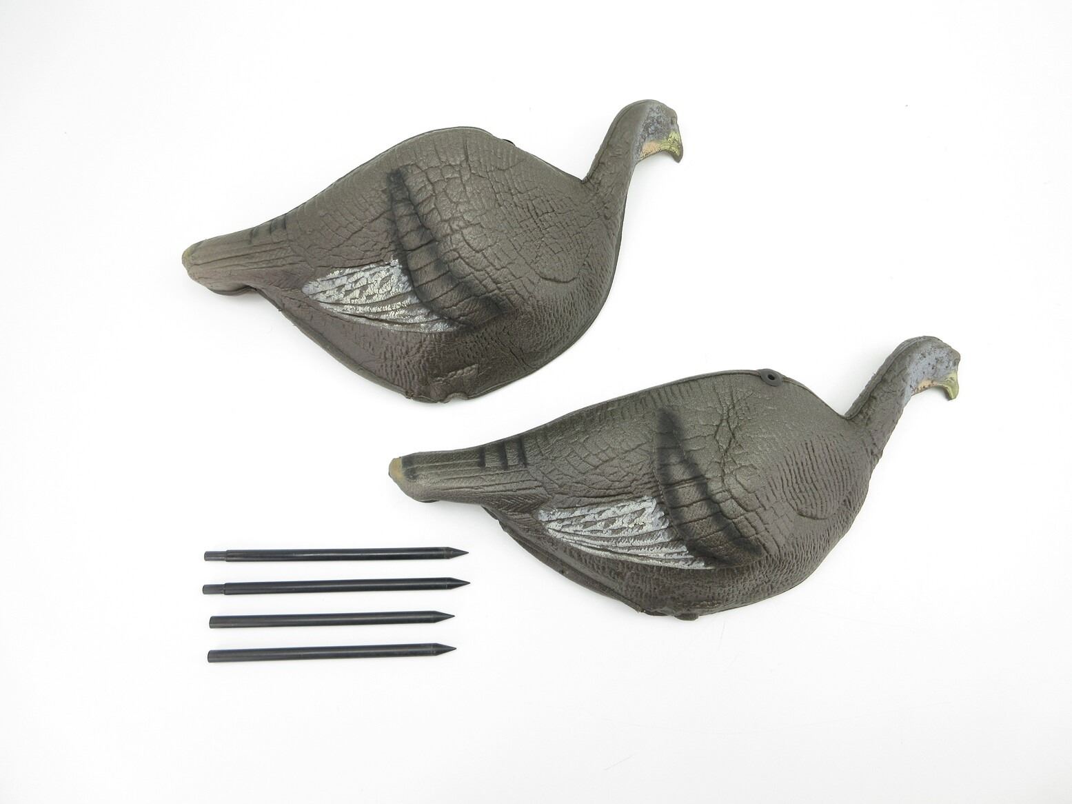 LOT INCLUDES; (2) FOAM TURKEY HEN DECOYS, SHOW LIGHT WEAR & TEAR / USE MARKS, WITH PLASTIC STAKES, DECOYS APPROX. 24" X 17". SEE PHOTOS.