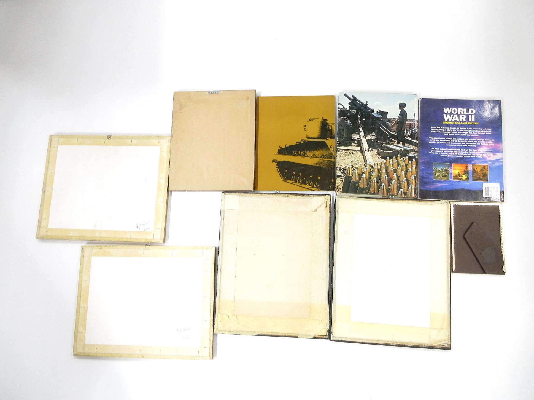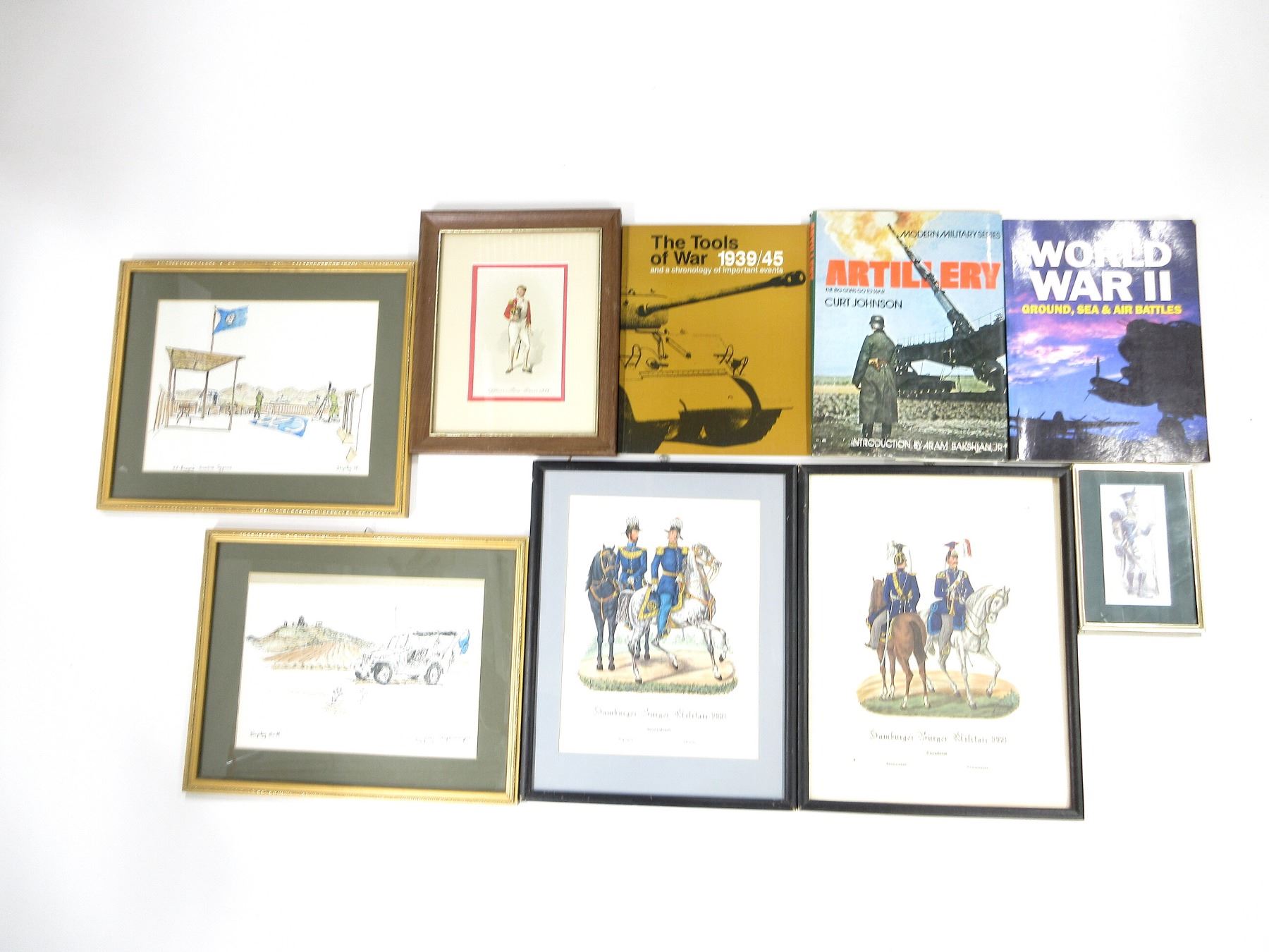 LOT INCLUDES; (1) "IN THE OPEN FIELDS WEST OF NICOSIA CYPRUS, O.P. ROYAL" FRAMED PRINT, SIGNED BY ARTIST, FRAME APPROX. 14 7/8" X 11.5" X 0.50" (1) "O.P. VINEYARD - NICOSIA CYPRUS" FRAMED PRINT, SIGNED BY ARTIST, FRAME APPROX. 14.5" X 12" X 0.50", (1) "HAMBURGER BURGER-MILITAIR 1868, CAVALLERIE, RITTMEISTER., TROMPETER." FRAMED PRINT, FRAME BACKING & PICTURE NOT SECURED, FALLING AWAY, FRAME APPROX. 14.75" X 11.75" X 0.50", (1) "HAMBURGER BURGER-MILITAIR 1868, GENERALSTAB, ADJUDANT., OBERST." FRAMED PRINT, FRAME APPROX. 14 7/8" X 11.75" X 0.50", (1) "OFFICER LEVEE DRESS 1828" FRAMED PRINT, FRAME APPROX. 11.5" X 9.5" X 0.75" & (1) FRAMED SOLDIER PRINT & FRAME APPROX. 7.25" X 5.25" X 0.50", (1) "MODERN MILITARY SERIES: ARTILLERY, THE BIG GUNS GO TO WAR" BOOK BY CURT JOHNSON, HARD COVER WITH DUST COVER, ISBN: 0-7064-0411-4, (1) "THE TOOLS OF WAR AND A CHRONOLOGY OF IMPORTANT EVENTS, 1939/45" BOOK BY READER'S DIGEST, SOFT COVER, ISBN: 0-88850-148-X & (1) "WORLD WAR II, GROUND, SEA & AIR BATTLES" BOOK BY KAREN FARRINGTON, SOFT COVER, ISBN: 1-86147-115-7. SEE PHOTOS. *NO GUARANTEE ON GLASS FOR SHIPPING*