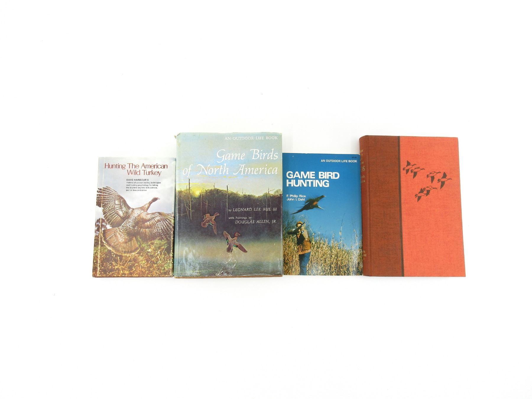 LOT INCLUDES; (1) "HUNTING THE AMERICAN WILD TURKEY" BOOK BY DAVE HARBOUR, HARD COVER WITH DUST COVER, ISBN: 0-8117-1863-2, (1) GAME BIRD HUNTING AN OUTDOOR LIFE BOOK" BOOK BY F. PHILIP RICE AND JOHN I. DAHL, SOFT COVER, ISBN: 0-308-10323-8, (1) "WATER PREY AND GAME BIRDS OF NORTH AMERICA" BOOK BY ALEXANDER WETMORE, NATIONAL GEOGRAPHIC SOCIETY, HARD COVER, COPYRIGHT 1965 & (1) "GAME BIRDS OF NORTH AMERICA AN OUTDOOR LIFE BOOK" BOOK BY LEONARD LEE RUE III, HARD COVER WITH DUST COVER, SBN: 0-06-013714-2, SEE PHOTOS.