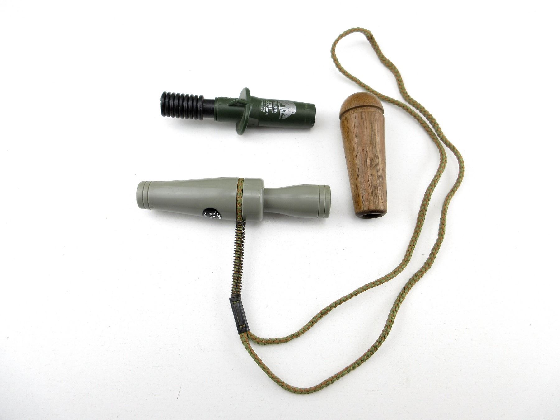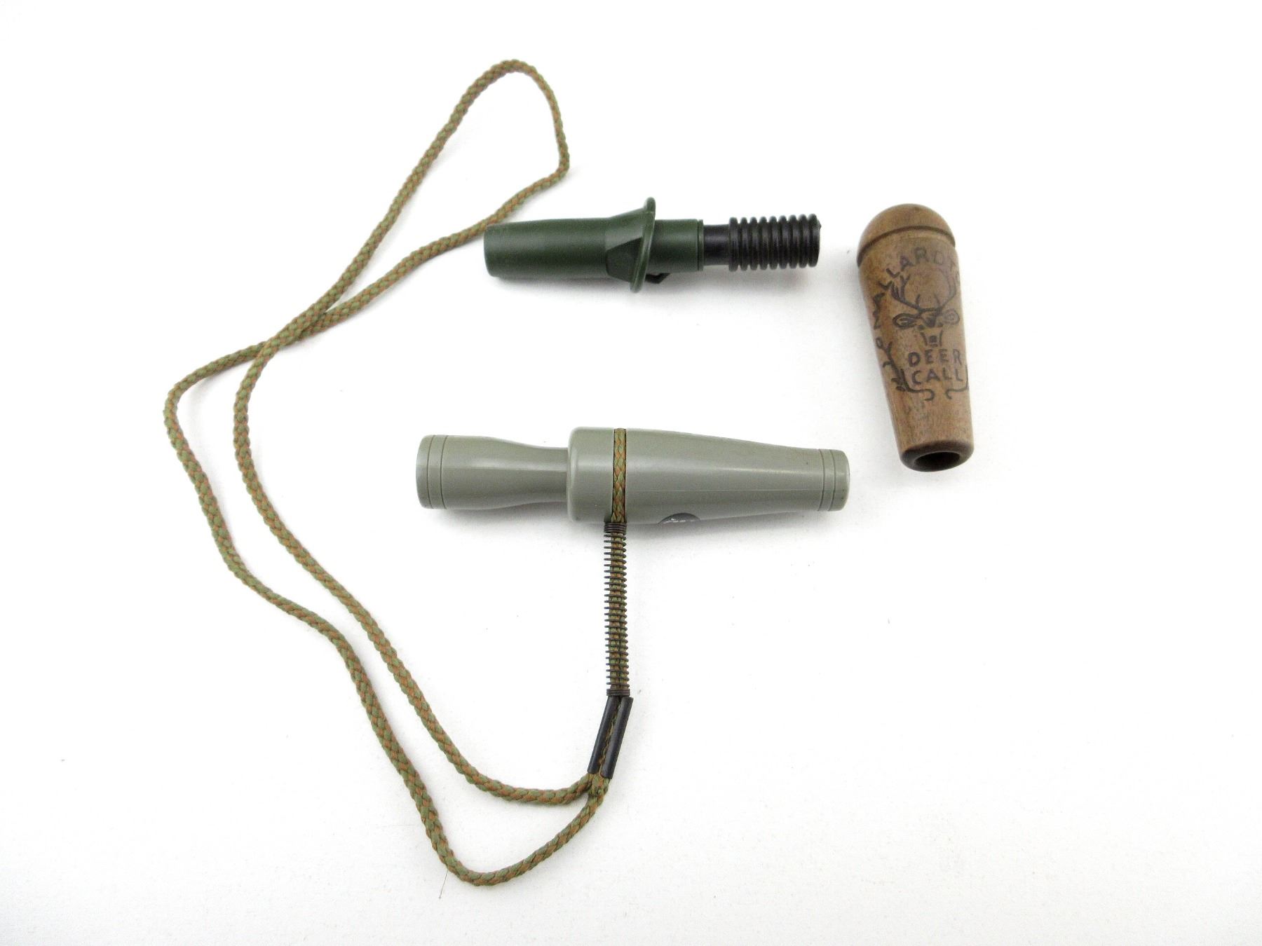 LOT INCLUDES; (1) MALLARDTONE DEER CALL, WOOD CONSTRUCTION, UNTESTED, (1) PRIMOS STILL JACKRABBIT CALL, GREEN & BLACK POLYMER CONSTRUCTION, UNTESTED & (1) UNKNOWN CALL, GREY POLYMER, UNTESTED. SEE PHOTOS.