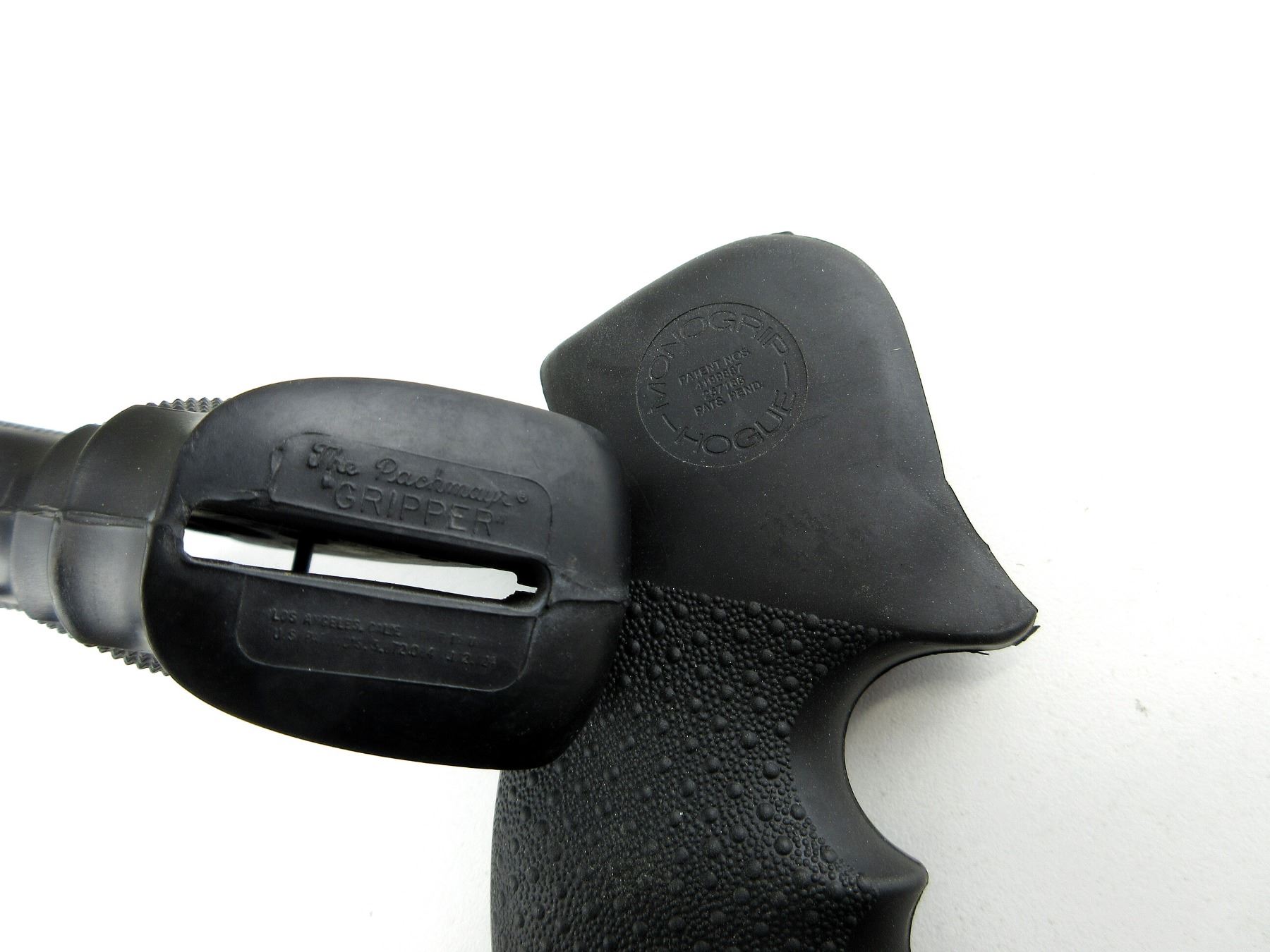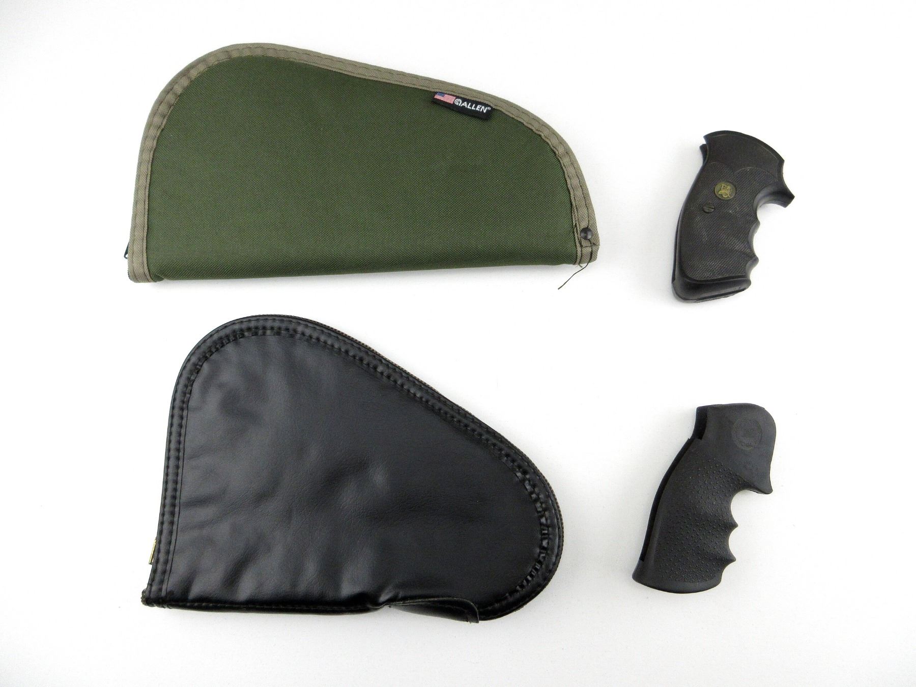LOT INCLUDES; (2) ASSORTED BLACK RUBBER GRIPS, CONSIGNOR STATES" "FITS SMITH & WESSON K FRAMES", ONE MARKED: "S&W" / ONE MARKED: "HOGUE MONOGRIP" & (2) ASSORTED PADDED SOFT HANDGUN CASES, ZIPPERED (WORKS), OAL APPROX. 9.75"-12". MAY REQUIRE FITTING. SEE PHOTOS