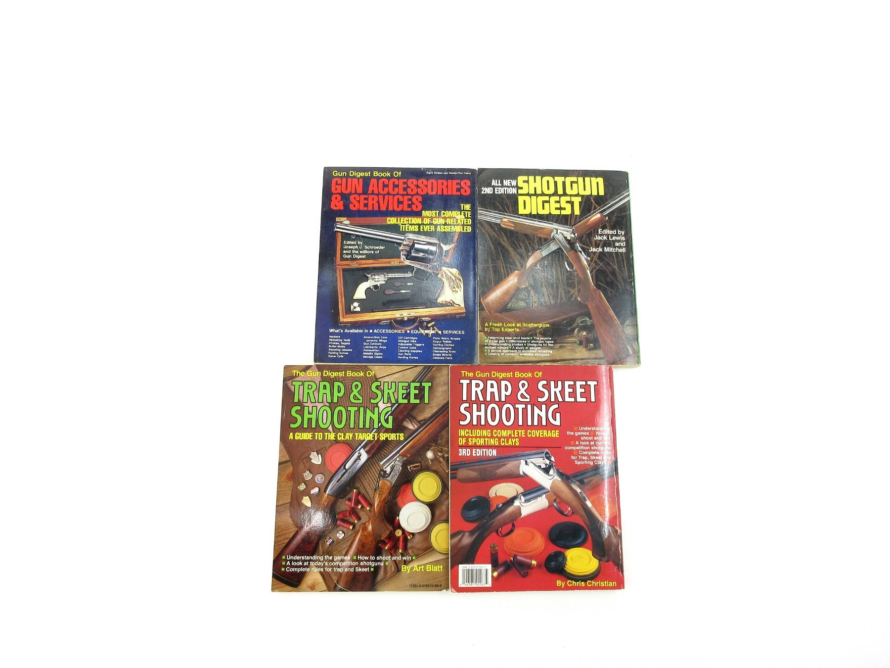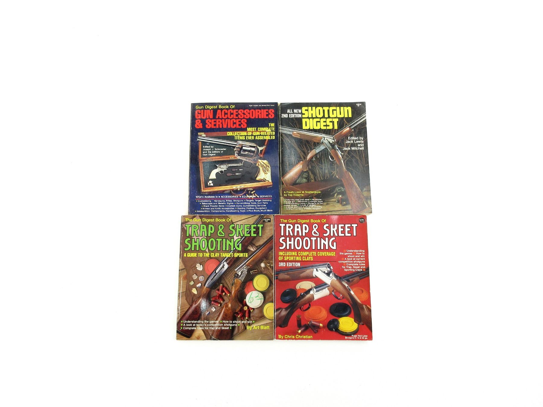 LOT INCLUDES; (1) "TRAP & SKEET SHOOTING" BOOK, BY ART BLATT, SOFT COVER, ISBN 0-910676-66-6, (1) "GUN ACCESSORIES & SERVICES" BOOK, EDITED BY JOSEPH J. SCHROEDER, SOFT COVER, ISBN 0-695-81313-7, (1) "TRAP & SKEET SHOOTING" BOOK, BY CHRIS CHRISTIAN, SOFT COVER, ISBN 0-87349-163-7, (1) "SHOTGUN DIGEST" BOOK, EDITED BY JACK LEWIS & JACK MITCHELL, SOFT COVER, ISBN 0-910676-13-5. SEE PHOTOS.