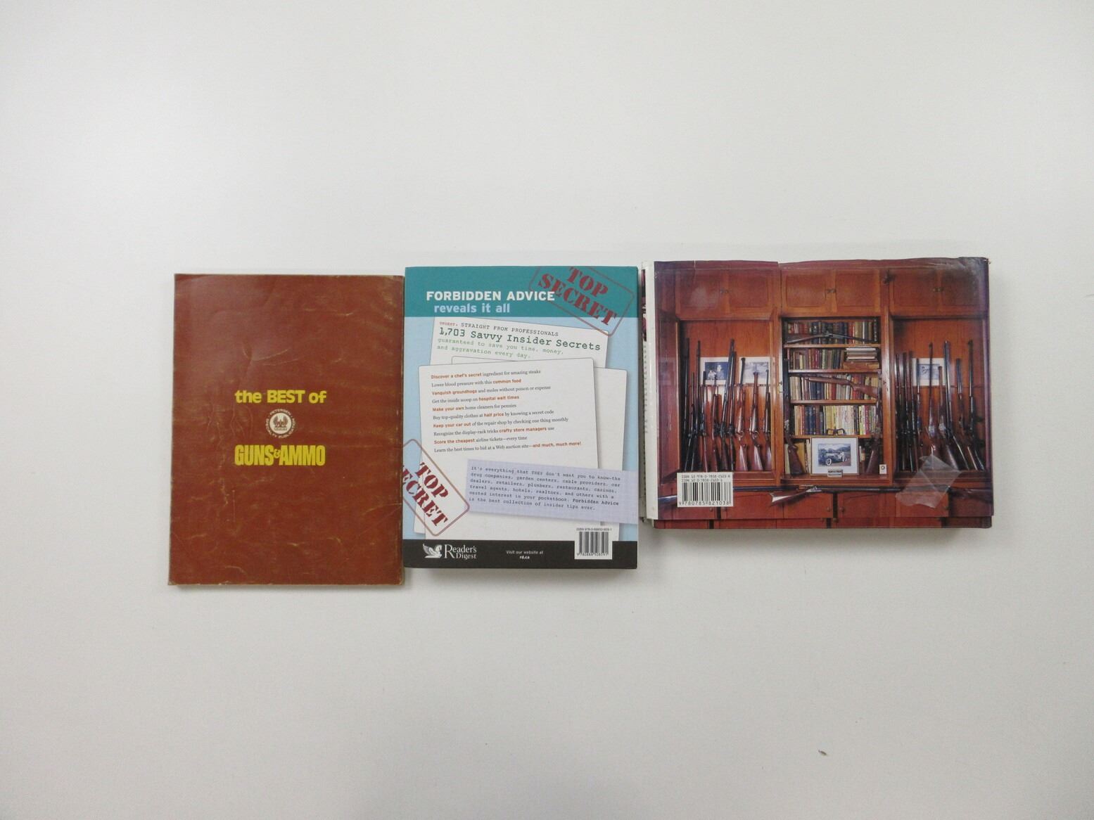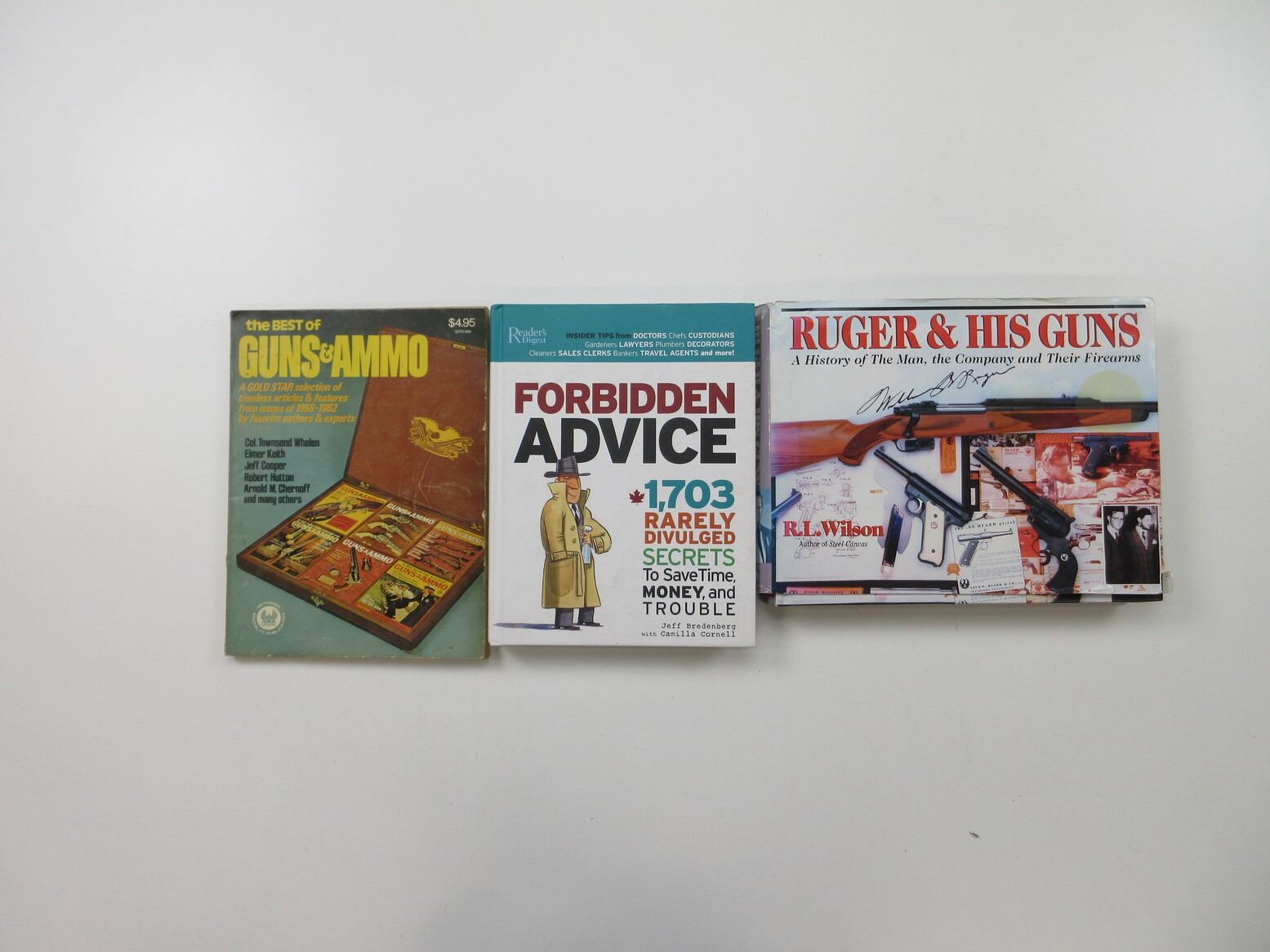 LOT INCLUDES; (1) "RUGER & HIS GUNS, A HISTORY OF THE MAN, THE COMPANY AND THEIR FIREARMS" BOOK BY R.L. WILSON, HARD COVER WITH DUST COVER, ISBN: 978-0-7858-2103-8, (1) "THE BEST OF GUNS & AMMO 1958-1962" BOOK, SOFT COVER, ISBN: 0-8227-0081-6 & (1) "READER'S DIGEST, FORBIDDEN ADVICE" BOOK BY JEFF BREDENBERG, HARD COVER , ISBN: 978-0-88850-859-1. SEE PHOTOS.