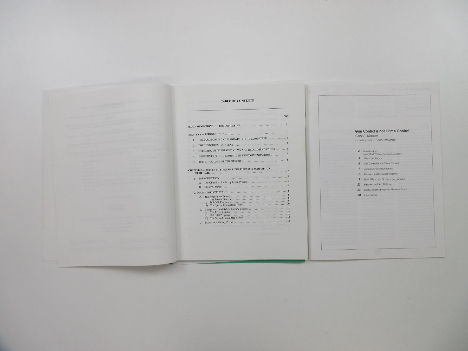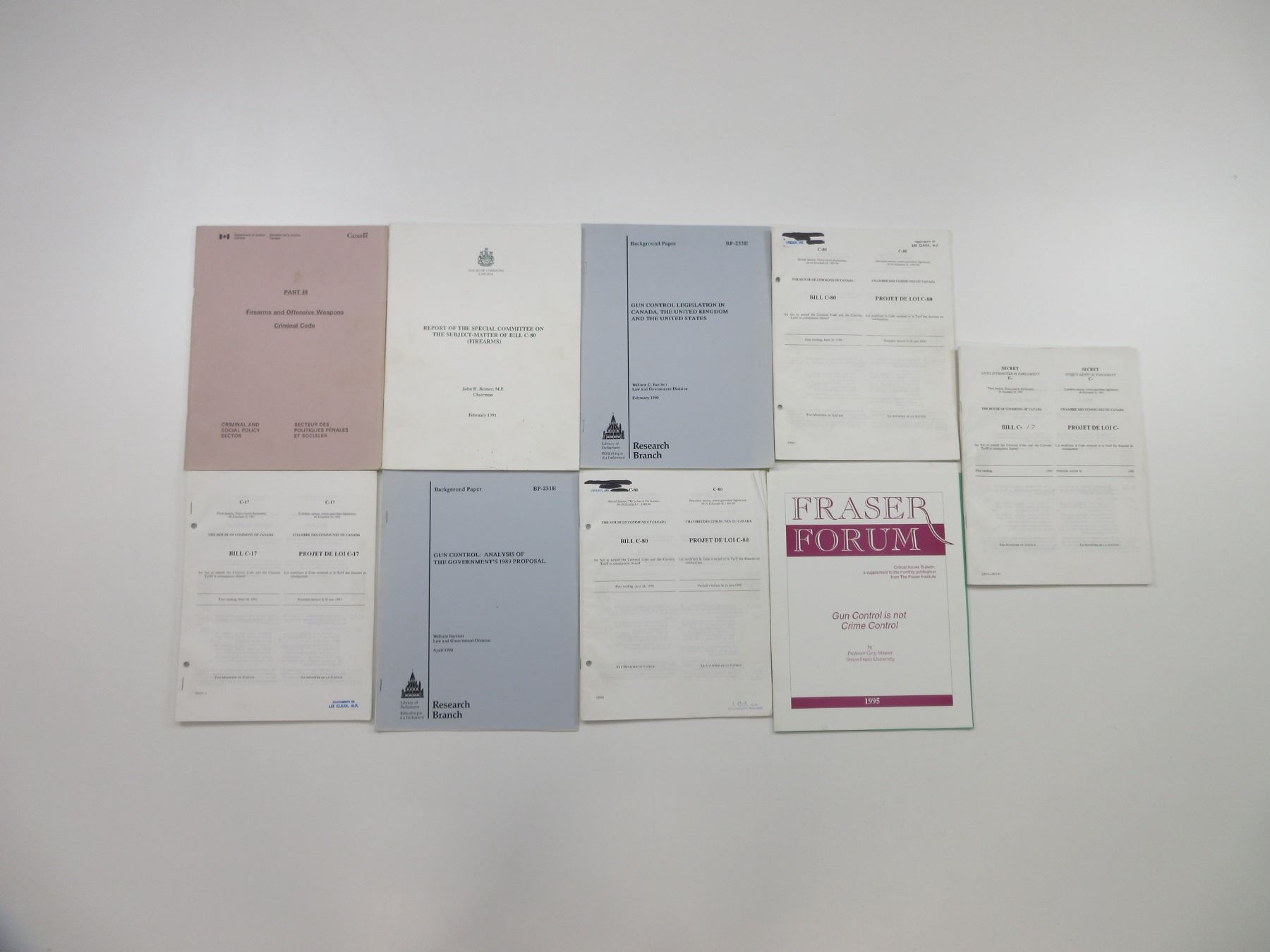 ASSORTED GUN LAW / RULE BOOKLET LOT. LOT INCLUDES; (2) "BILL C-80" BOOKLETS, (2) "BILL C-17" BOOKLETS, (1) "SPECIAL COMMITTEE ON THE SUBJECT-MATTER OF BILL C-80 (FIREARMS)" BOOKLET, (1) "PART III, FIREARMS AND OFFENSIVE WEAPONS CRIMINAL CODE" BOOKLET, (1) ""GUN CONTROL: ANALYSIS OF THE GOVERNMENT'S 1989 PROPOSAL" BOOKLET, (1) "GUN CONTROL LEGISLATION IN CANADA, THE UNITED KINGDOM AND THE UNITED STATES" BOOKLET & (1) "FRASER FORUM, GUN CONTROL IS NOT CRIME CONTROL" BOOKLET, 1995. SEE PHOTOS.