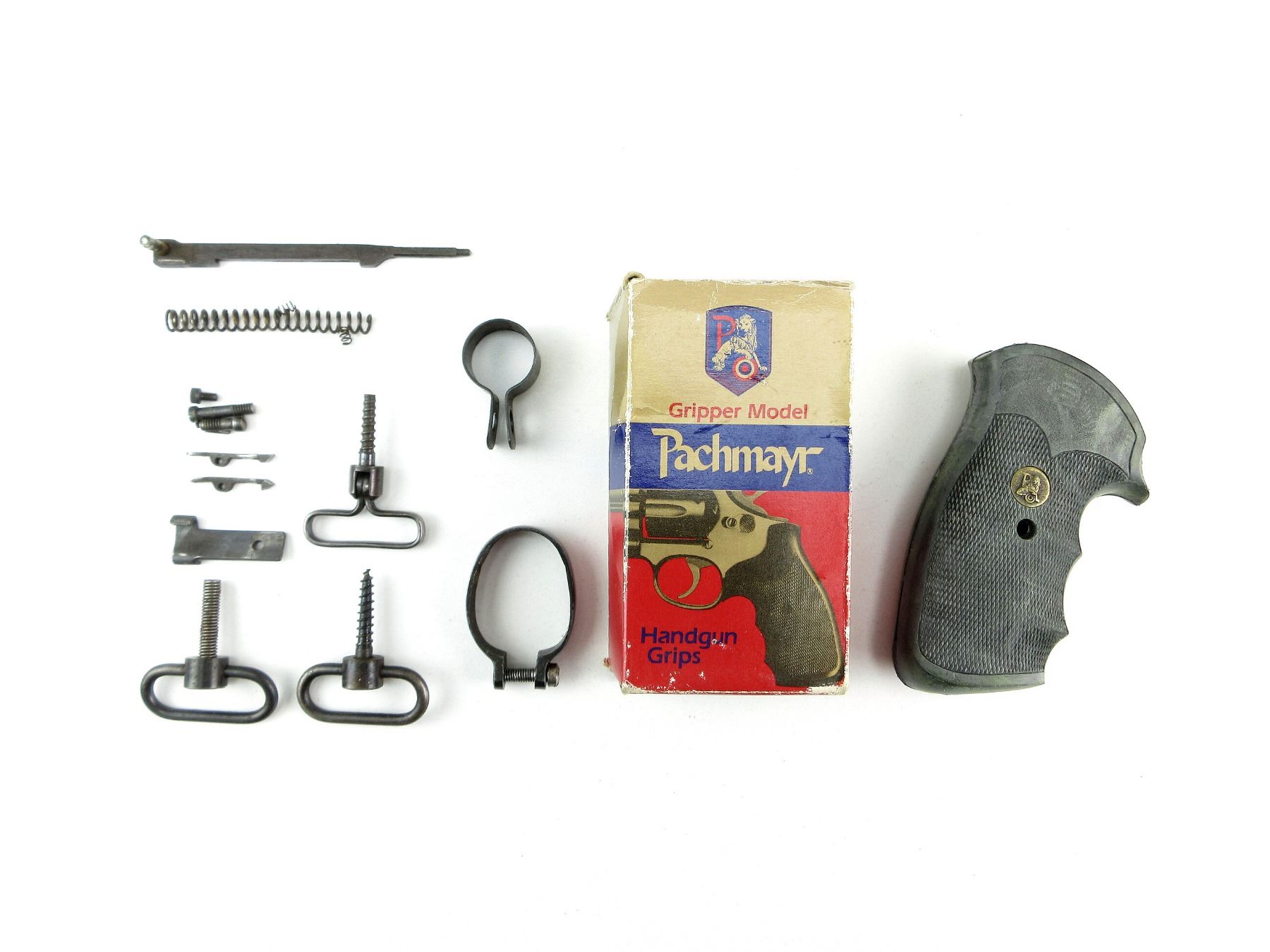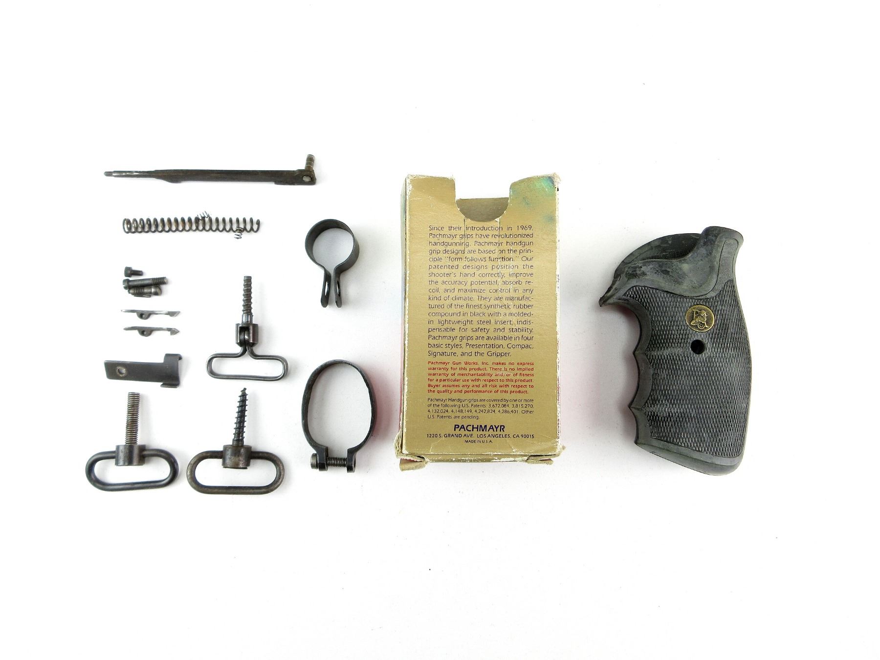 LOT INCLUDES; (1) WINCHESTER MODEL 75 BARREL BAND, (1) PAIR OF SCHULTZ & LARSEN .22 CAL RIFLE SLING SWIVELS, (1) SCHULTZ & LARSEN M70 .22 LR BOLT STOP, WITH SCREW, (1) STEVENS MODEL 414 BARREL BAND, (1) STEVENS MODEL 414 SLING SWIVEL, (1) PACHMAYR SMITH & WESSON K FRAME REVOLVER GRIPS, BLACK RUBBER CONSTRUCTION, ROUND BUTT, MISSING MOUNTING SCREW, WITH ORIGINAL BOX, ETC. SEE PHOTOS.