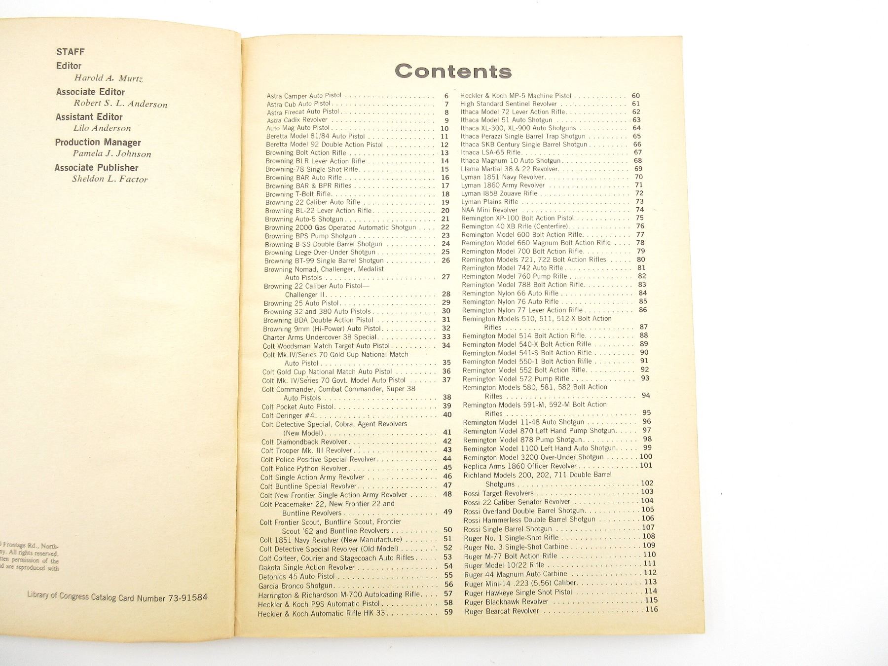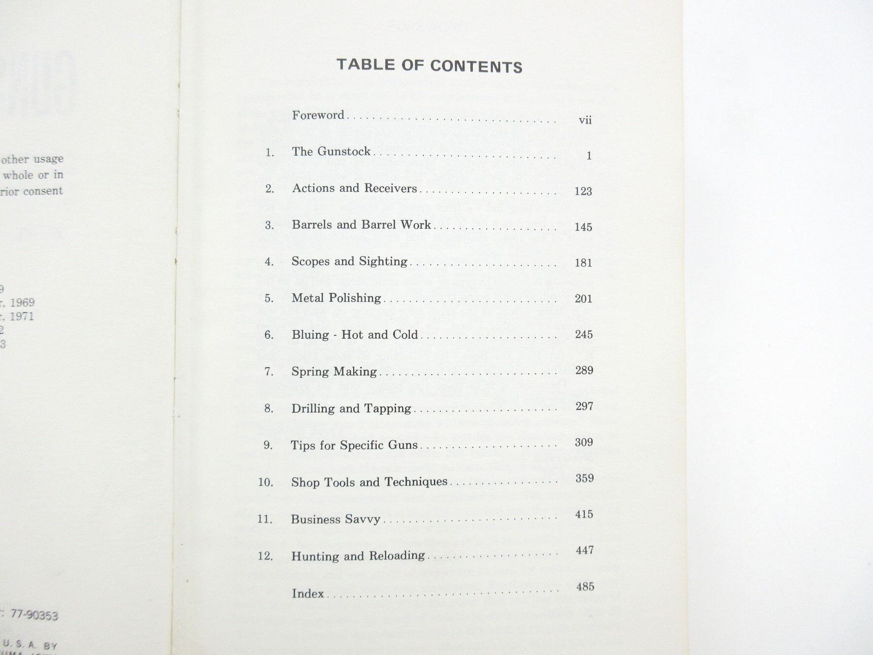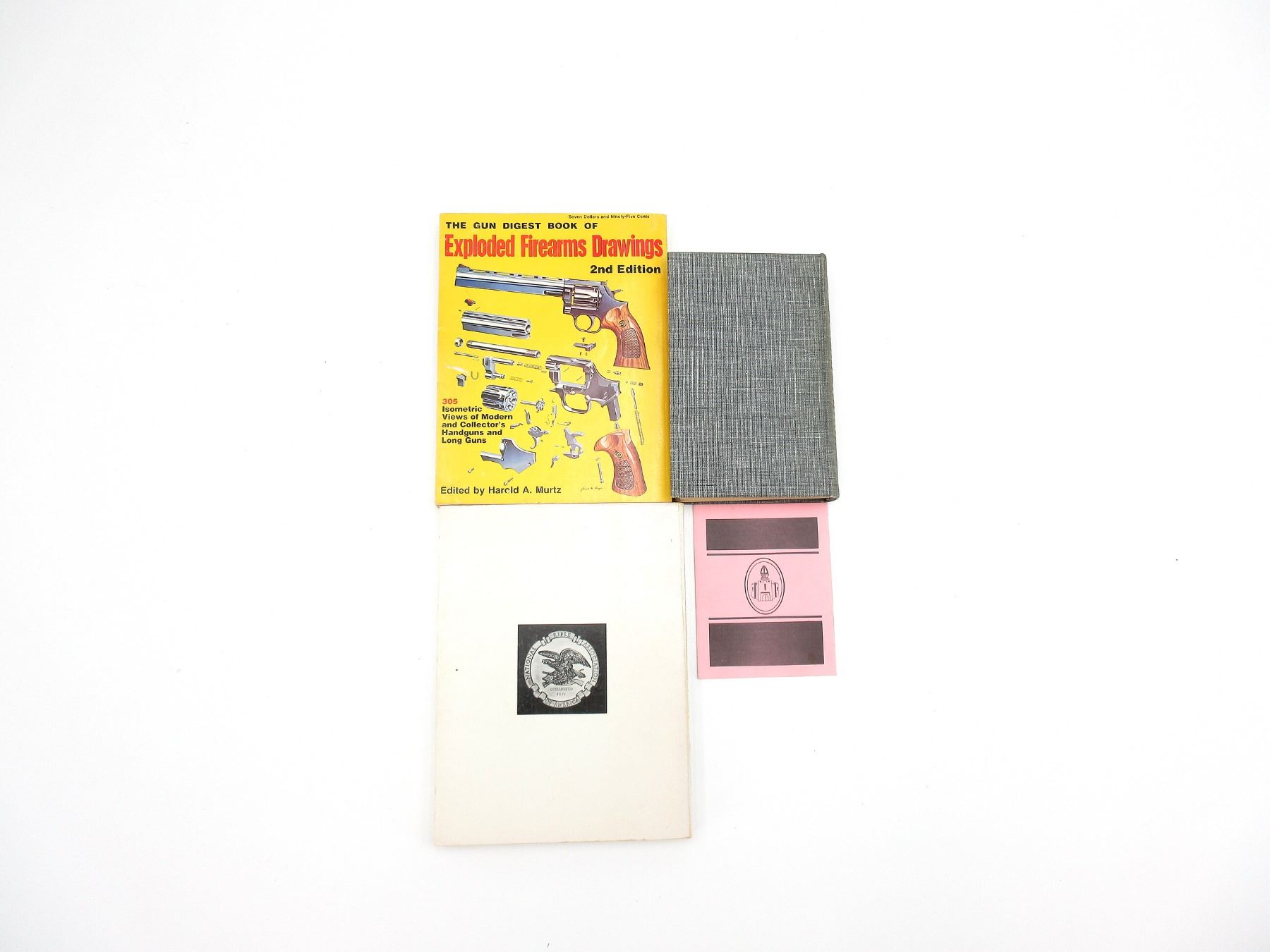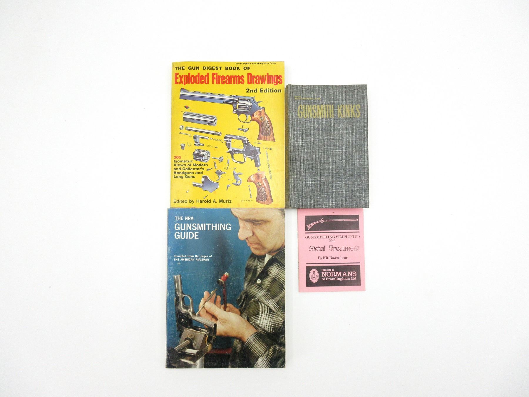 LOT INCLUDES; (1) "GUNSMITHING SIMPLIFIED NO3, METAL TREATMENT" BOOK BY KIT RAVENSHEAR, SOFT COVER, PUBLISHED BY NORMANS OF FRAMLINGHAM LTD, (1) "GUNSMITH KINKS" BOOK BY F.R. BOB BROWNELL, HARD COVER, COPYRIGHT 1969, (1) "THE NRA GUNSMITHING GUIDE" BOOK BY NATIONAL RIFLE ASSOCIATION, SOFT COVER, COPYRIGHT 1971 & (1) "THE GUN DIGEST BOOK OF EXPLODED FIREARMS DRAWINGS, 2ND EDITION" BOOK EDITED BY HAROLD A. MURTZ, SOFT COVER, ISBN: 0-695-808-42-7. SEE PHOTOS.