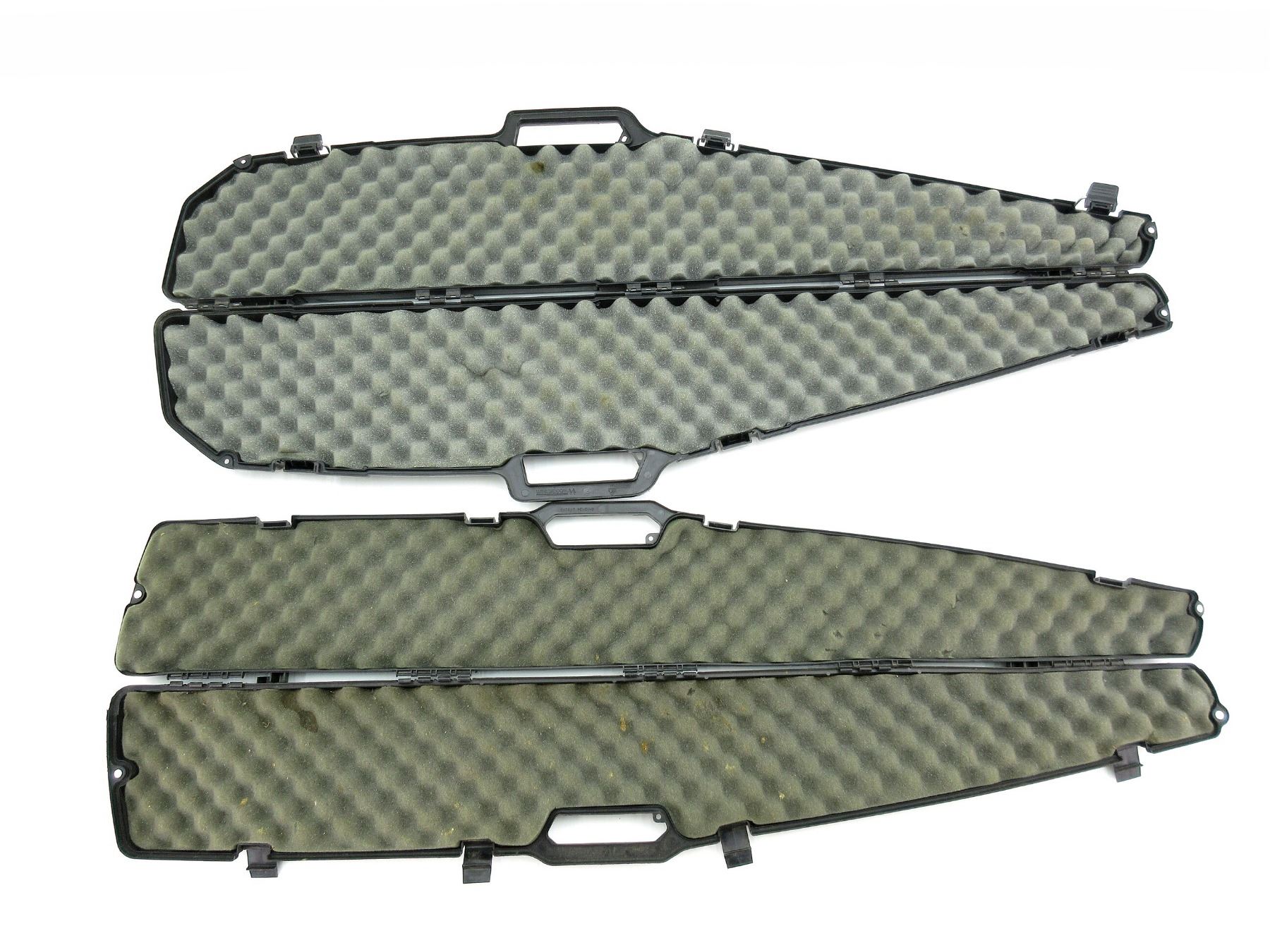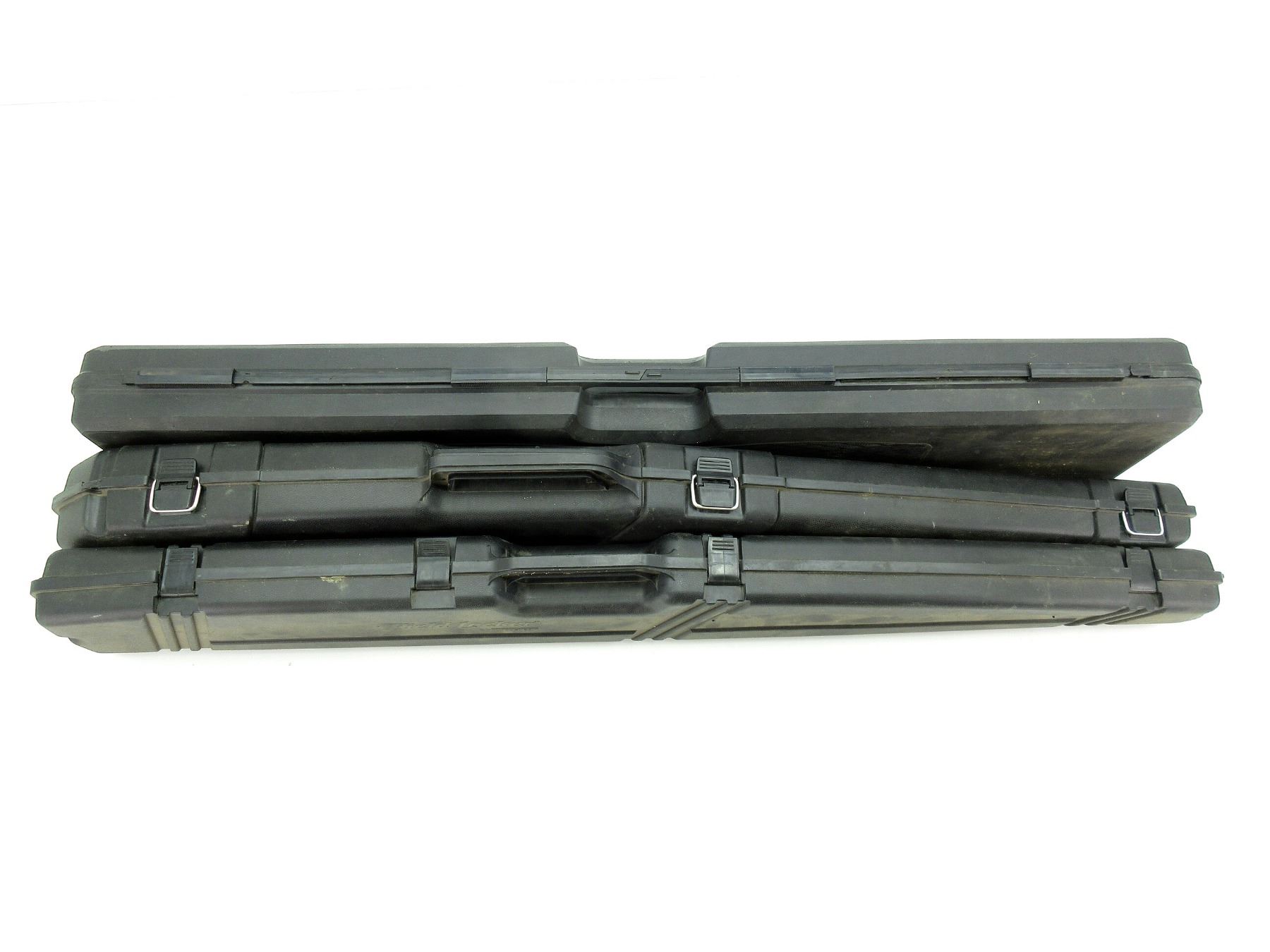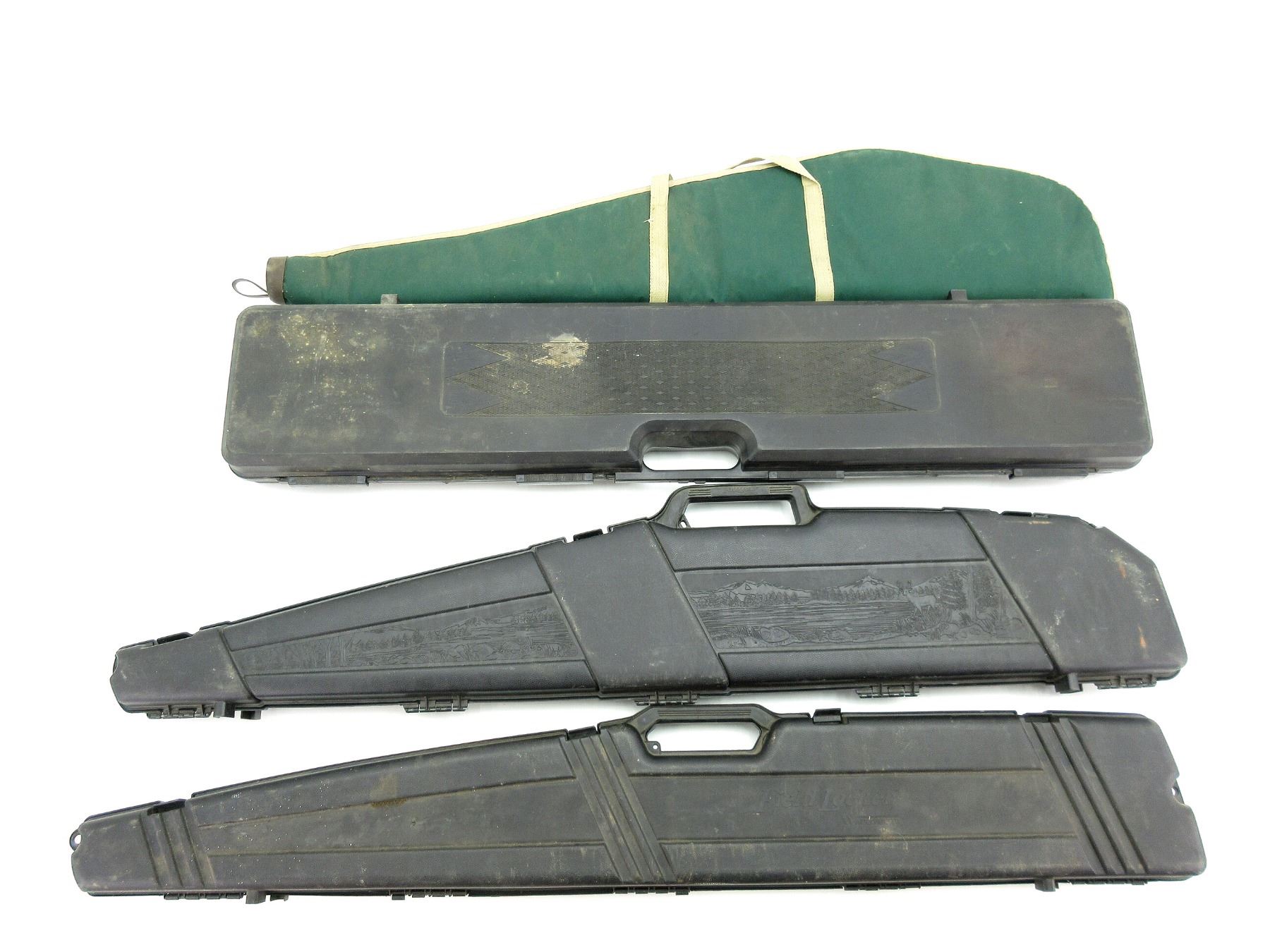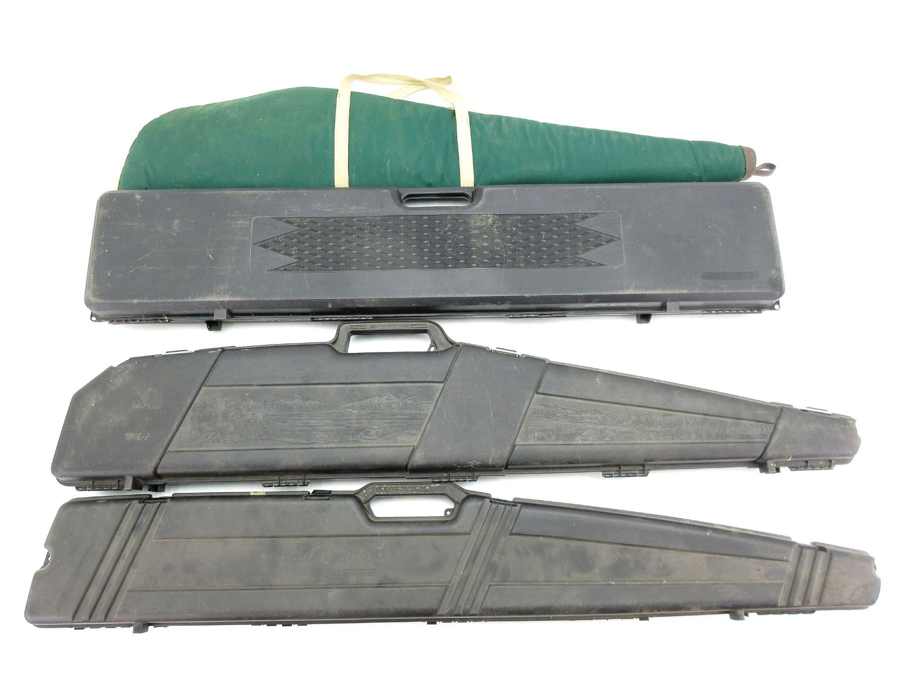 LOT INCLUDES; (2) BLACK HARD PADDED GUN CASES, CARRY HANDLE, (4) LATCHES, (1) IS MISSING A PIECE OF FOAM, (1) BLACK HARD PADDED GUN CASES, CARRY HANDLE, (3) LATCHES, (1) SOFT PADDED GUN CASE, CARRY HANDLES, ZIPPERED, APPROX. OAL 48"-51", SHOWS WEAR AND TEAR FROM USAGE, SEE PHOTOS.
