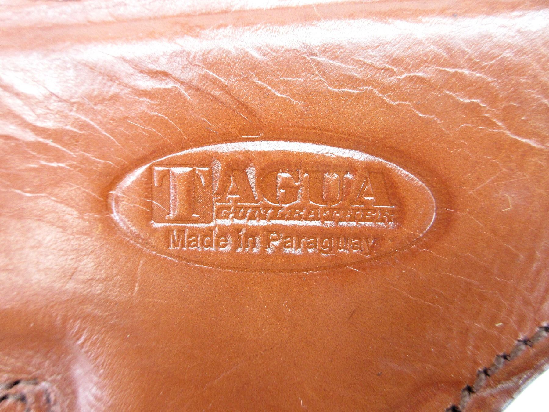 LOT INCLUDES; (1) BROWN LEATHER HOLSTER, BACK MARKED: "HUNTER, 1100 45", BELT SLIDE STYLE, RIGHT HANDED, OAL APPROX. 8.25", (1) BROWN LEATHER PISTOL HOLSTER, BACK MARKED: "TAGUA, MADE IN PARAGUAY", RIGHT HANDED, BELT SLIDE STYLE, OAL APPROX. 8", (1) UNKNOWN SMITH & WESSON REVOLVER GRIPS, WOOD CONSTRUCTION, WITH FINGER GROOVES, FITS K FRAME REVOLVERS, ROUND BUTT, INCLUDES MOUNTING SCREW, ETC. SEE PHOTOS.