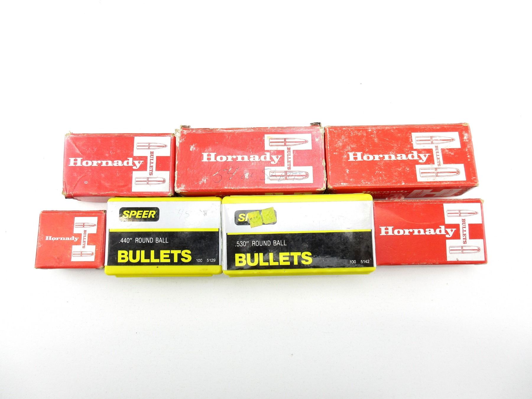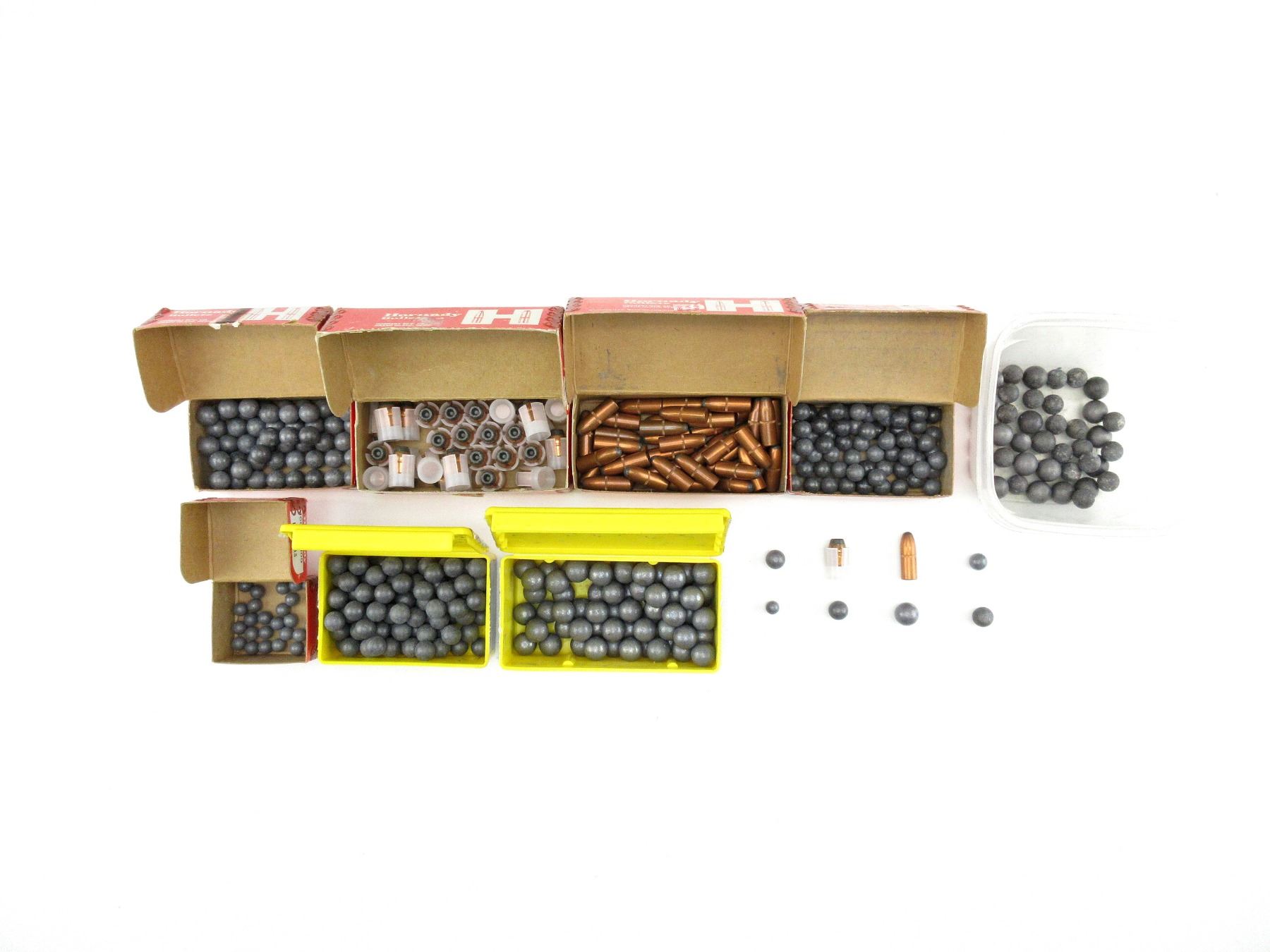 LOT INCLUDES; APPROX. 8.5 LBS LEAD BALLS & SABOTS, APPROX. DIA .395", .430", .440", .530', ETC., VARIOUS MANUFACTURERS INCLUDING; HORNADY, SPEER, ETC.