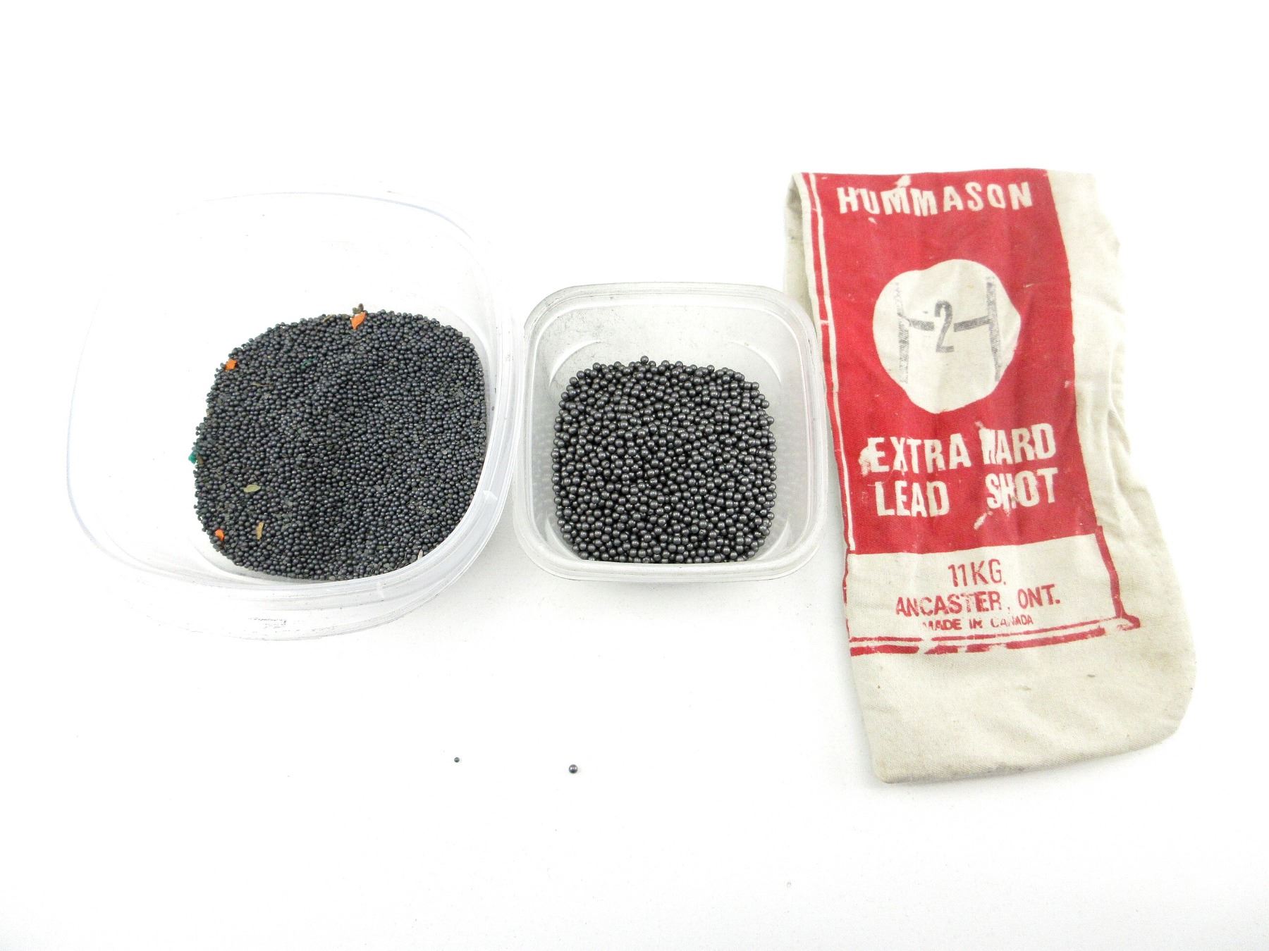 APPROX. 7.1 LBS OF LEAD SHOT, ONE BAG UNKNOWN, ONE BAG MARKED: "HUMMASON, 2, EXTRA HARD LEAD SHOT" ETC. SEE PHOTOS.