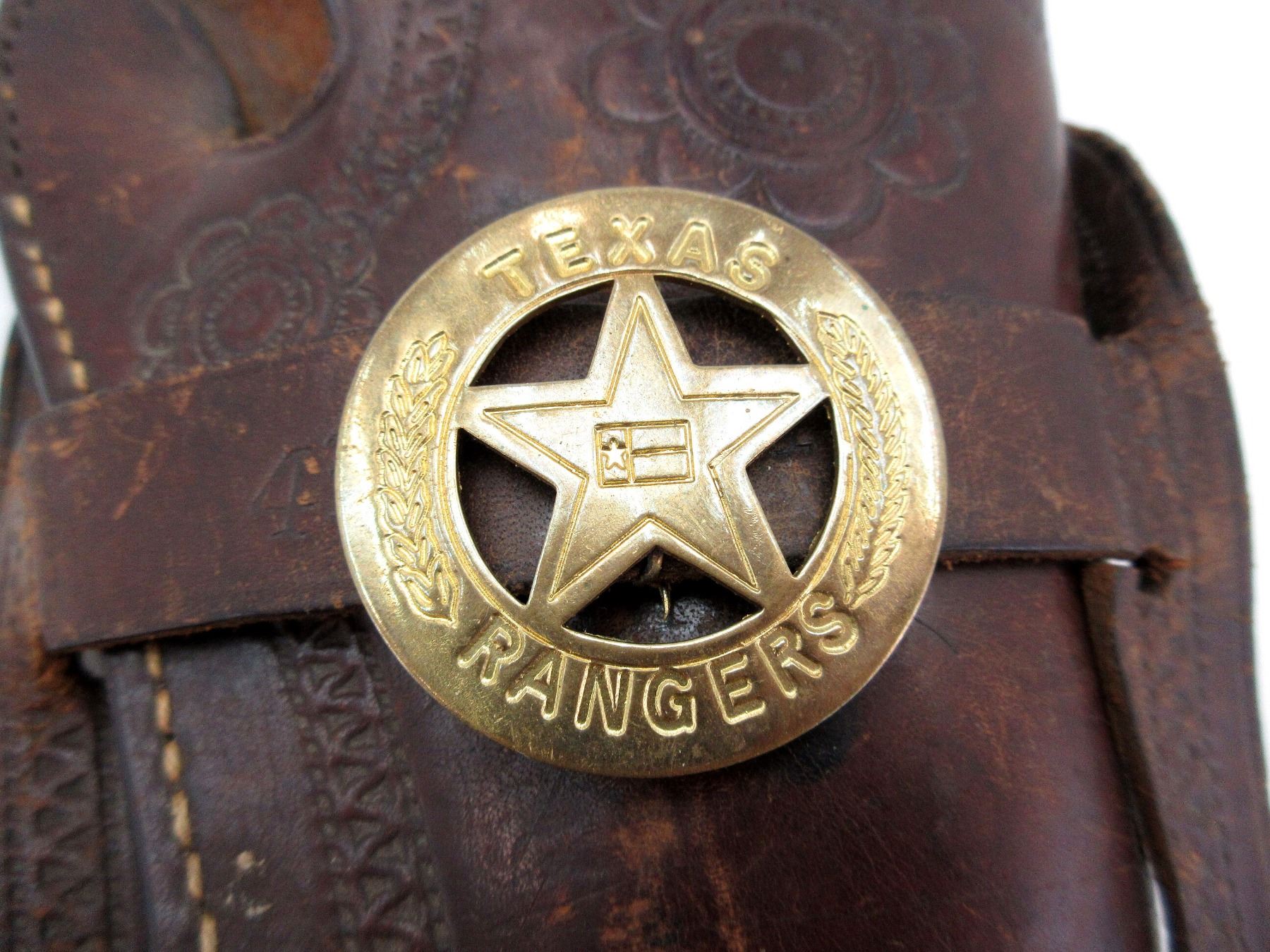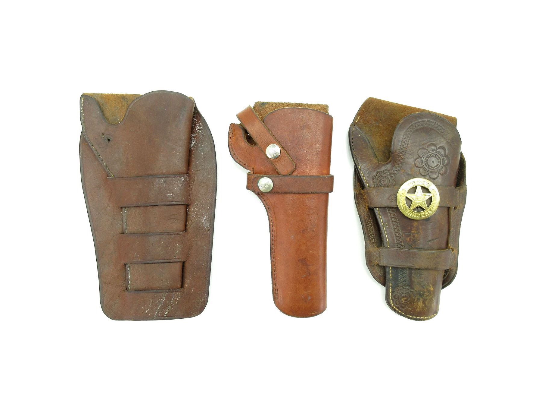 LOT INCLUDES; (1) TEXAS RANGER REVOLVER HOLSTER, BROWN LEATHER CONSTRUCTION, WITH FLORAL DESIGN, RIGHT HANDED, MARKED: "4 3/4 OLIVE 1", WITH BRASS TEXAS RANGER PIN, CONSIGNOR STATES: "FROM 1800'S", OAL APPROX. 8.75", (1) HUNTER BROWN LEATHER HOLSTER, RIGHT HANDED, BACK MARKED: "1100 40, OE", OAL APPROX. 8.75", (1) UNKNOWN BROWN LEATHER HOLSTER, RIGHT HANDED, UNMARKED, OAL APPROX. 9.5". SEE PHOTOS.