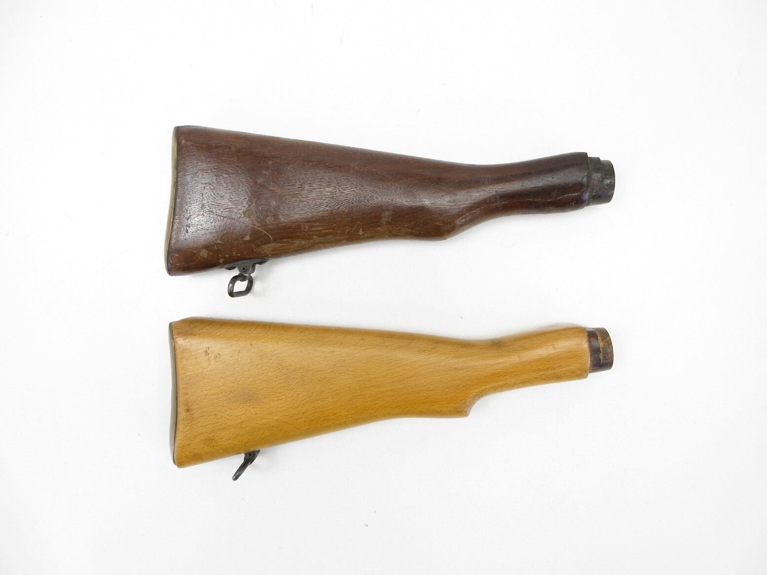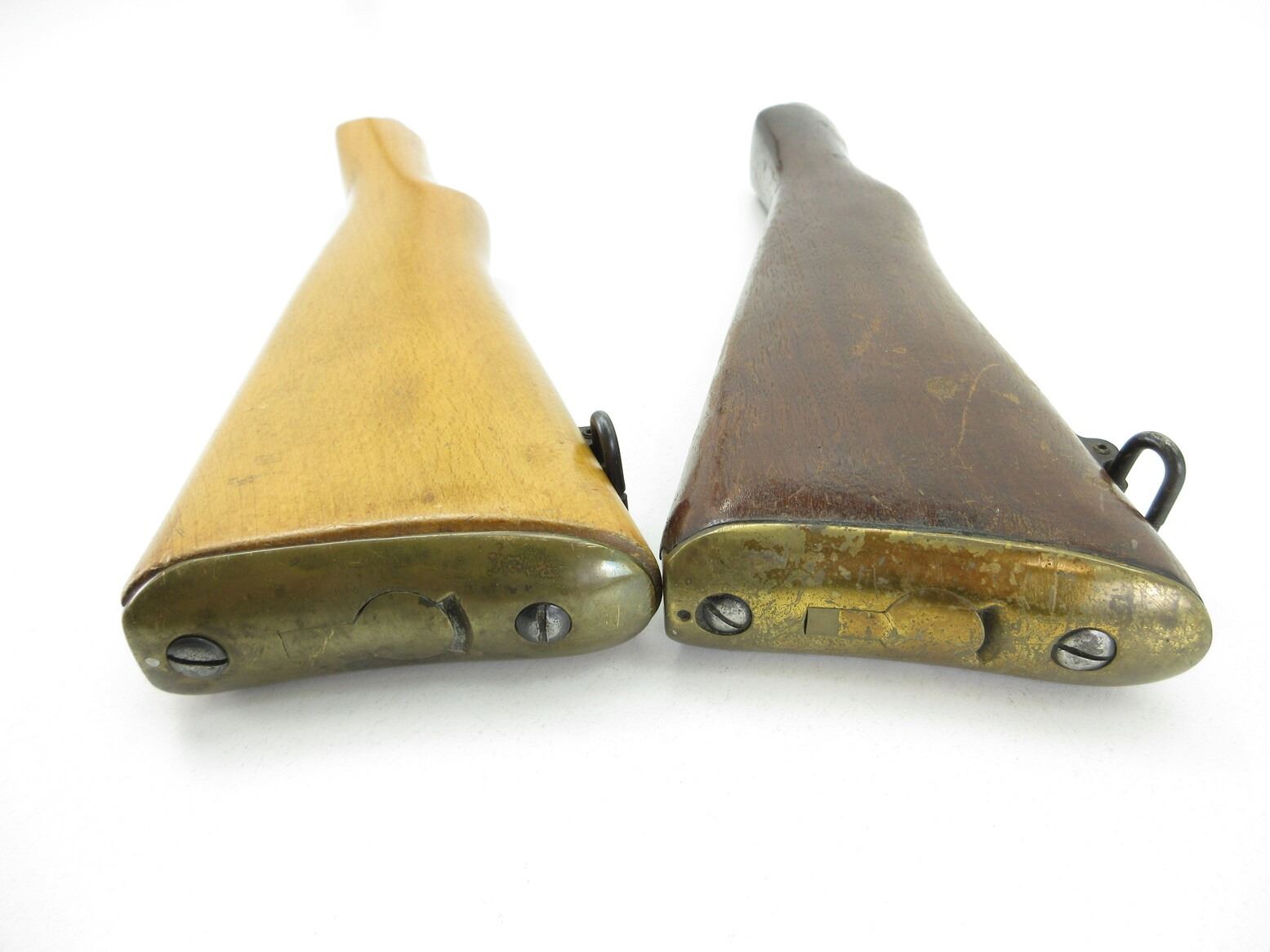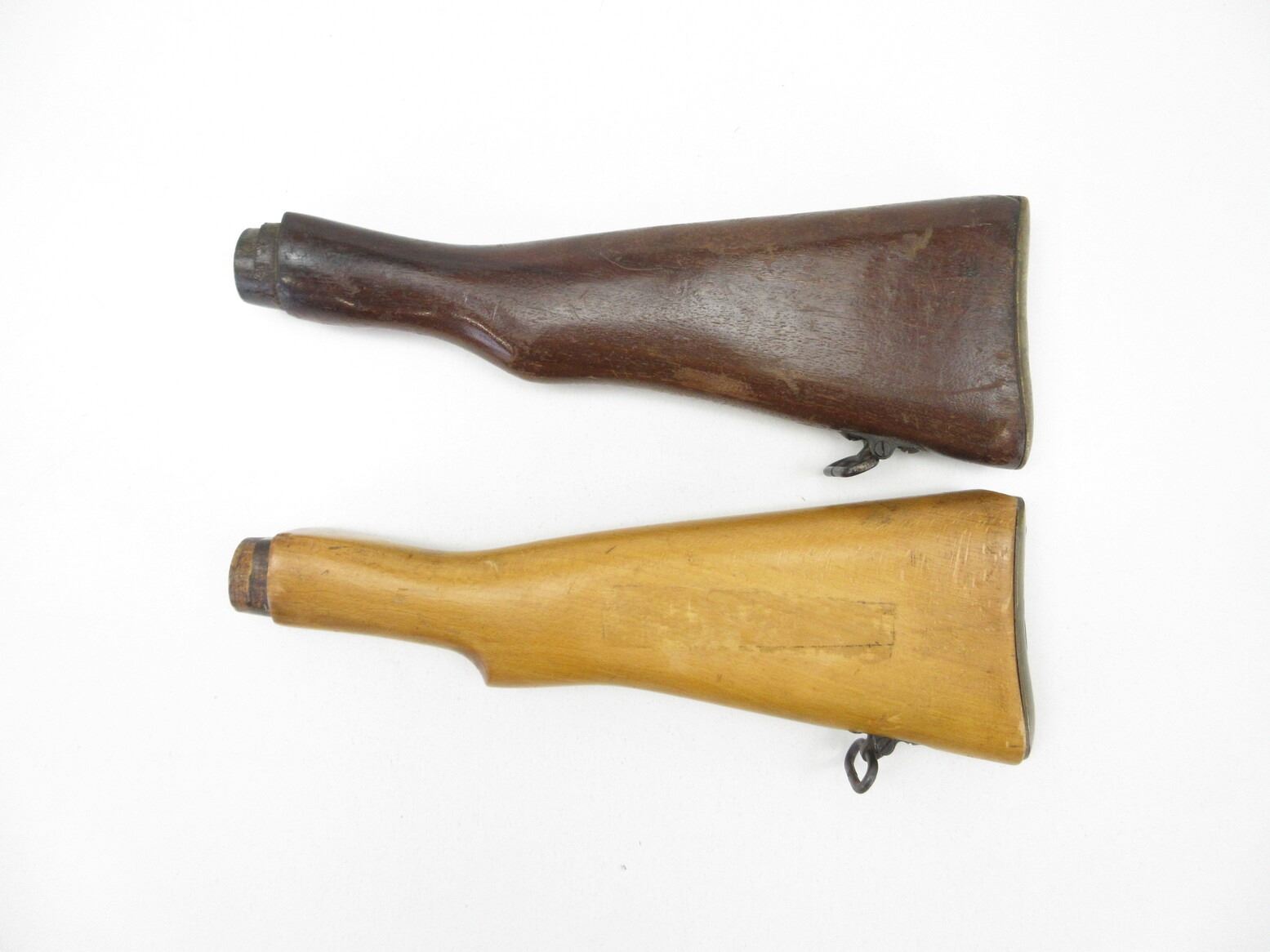 ASSORTED LEE ENFIELD BUTT STOCKS LOT. LOT INCLUDES; (1) LEE ENFIELD NO.4 RIFLE BUTT STOCK, WOOD, GOOD CONDITION, SHOWS WEAR & TEAR CHIPPED BY BUTT PLATE, WITH BRASS BUTT PLATE & REAR SLING SWIVEL, OAL APPROX. 13.25", (1) LEE ENFIELD NO.3 MKIII RIFLE BUTT STOCK, WOOD, IN GOOD CONDITION, SHOWS WEAR & TEAR, WITH STOCK BOLT, BUTT PLATE & REAR SLING SWIVEL, OAL APPROX. 13.5". MAY REQUIRE FITTING. SEE PHOTOS.