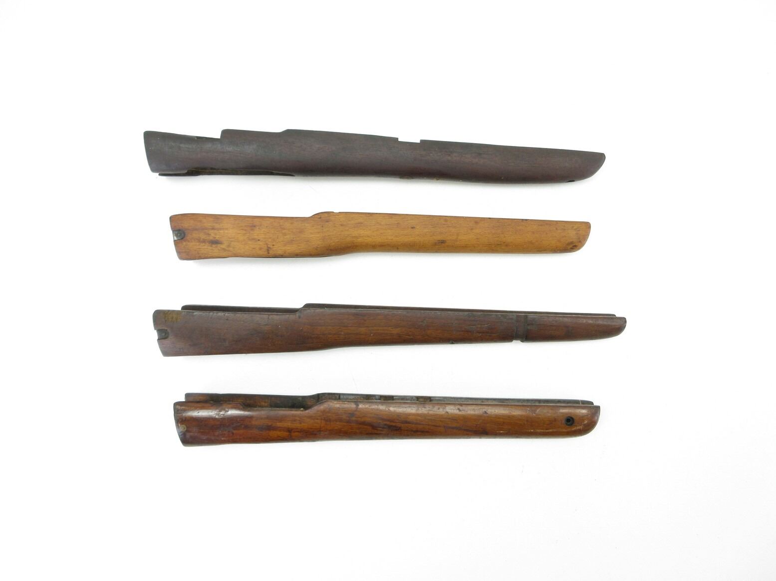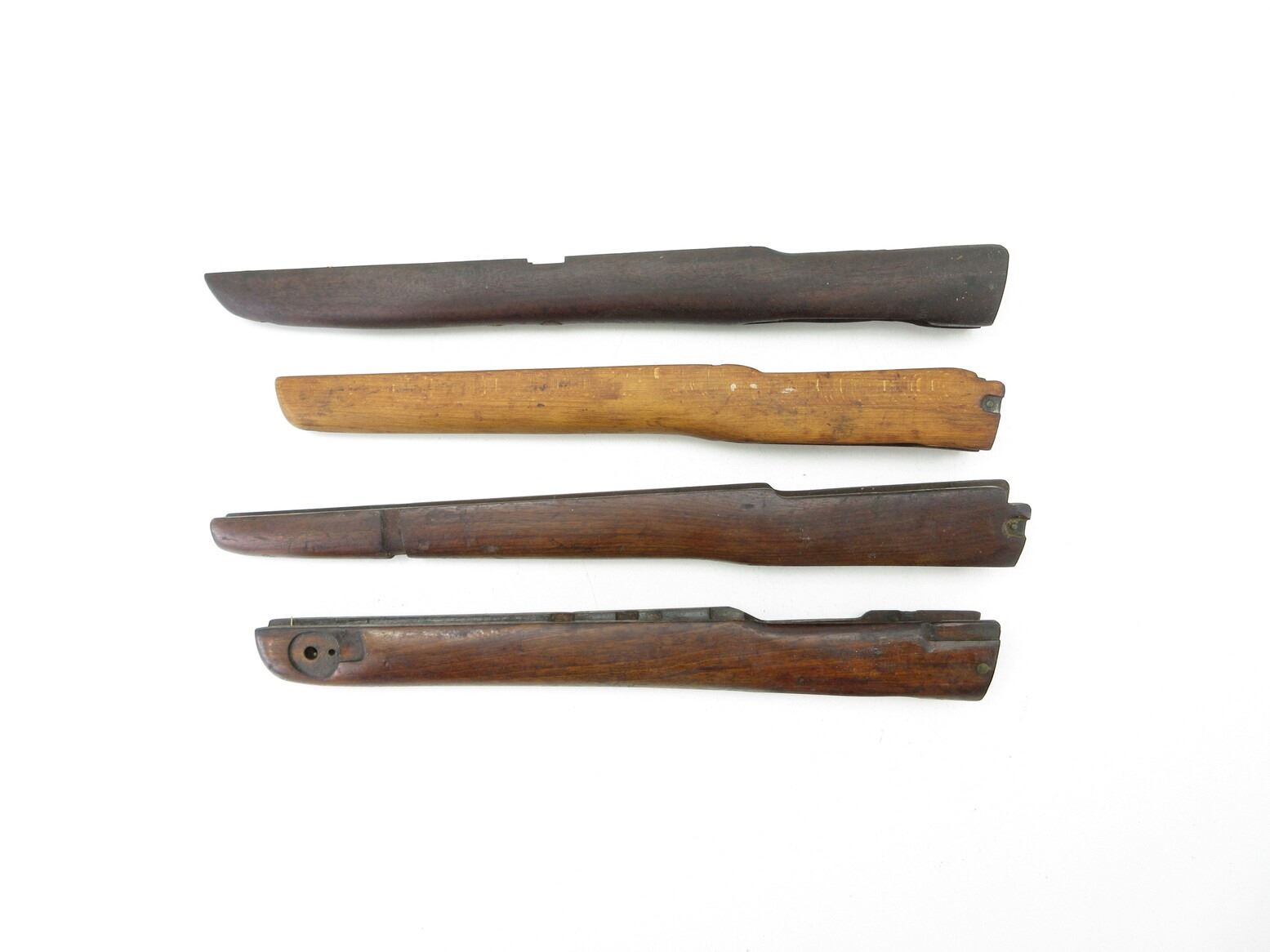 ASSORTED LEE ENFIELD FORENDS LOT. LOT INCLUDES; (3) LEE ENFIELD NO.4 FORENDS, WOOD, GOOD CONDITION, SHOW WEAR & TEAR, ONE MARKED: "T, 1560", ALL OTHERS APPEAR UNMARKED, OAL APPROX. 17" - 19", (1) LEE ENFIELD NO.1 MKIII FOREND, WOOD, GOOD CONDITION, SHOWS SOME WEAR & TEAR, UNMARKED, OAL APPROX. 19". MAY REQUIRE FITTING. SEE PHOTOS.