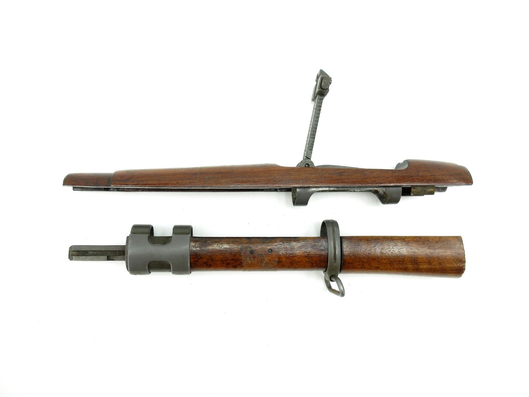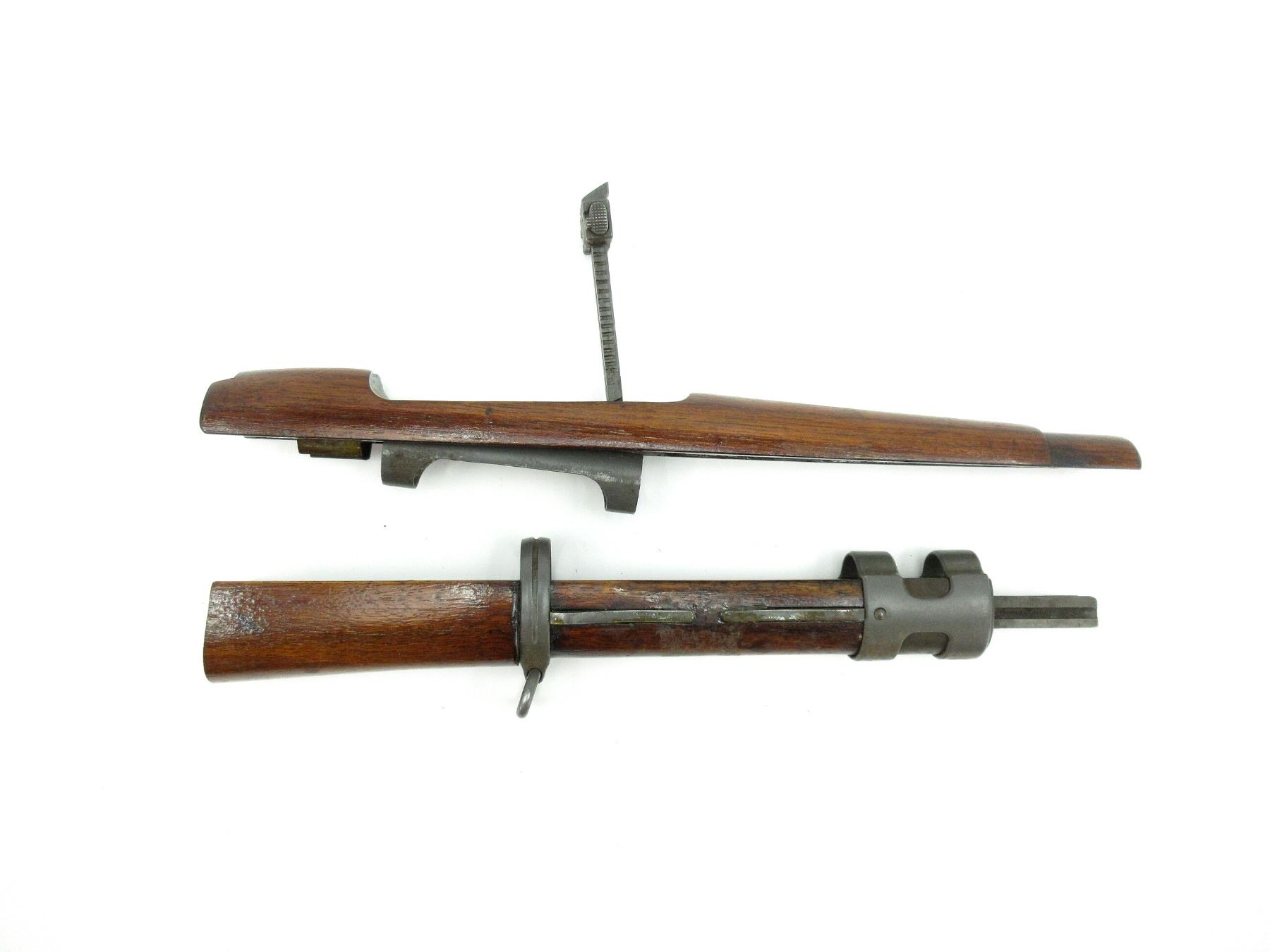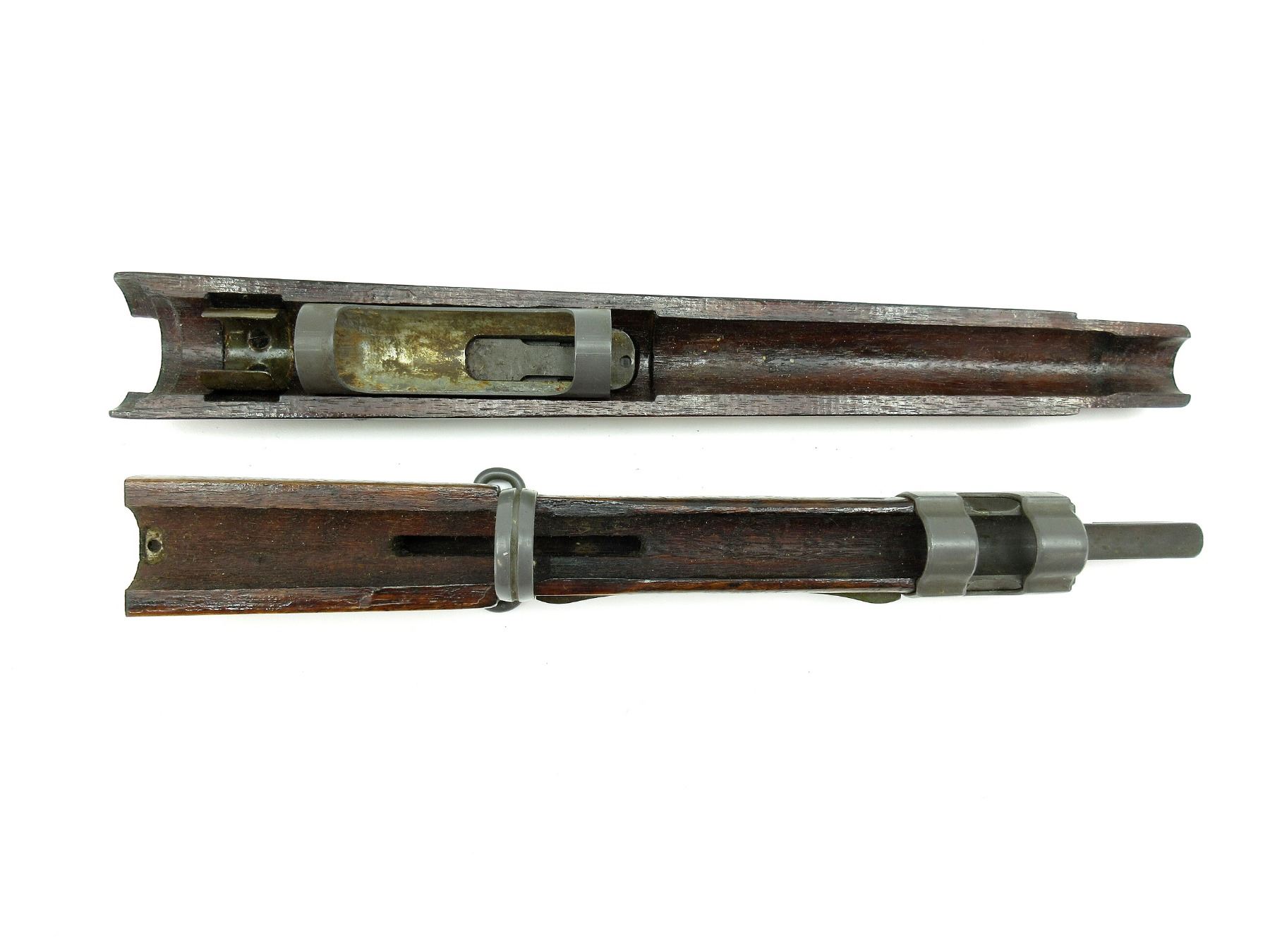 LOT INCLUDES; (1) HANDGUARD, WOOD CONSTRUCTION, WITH FAINT / UNCLEAR MARKINGS INSIDE, INCLUDES REAR SIGHT, SIGHT MARKED: "S, 12", OAL APPROX. 12.5", (1) HANDGUARD, WOOD CONSTRUCTION, UNMARKED, WITH BARREL BAND & NOSE CAP, OAL APPROX. 12". MAY REQUIRE FITTING. SEE PHOTOS.