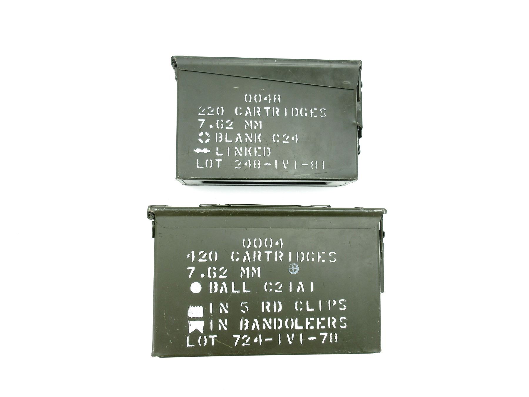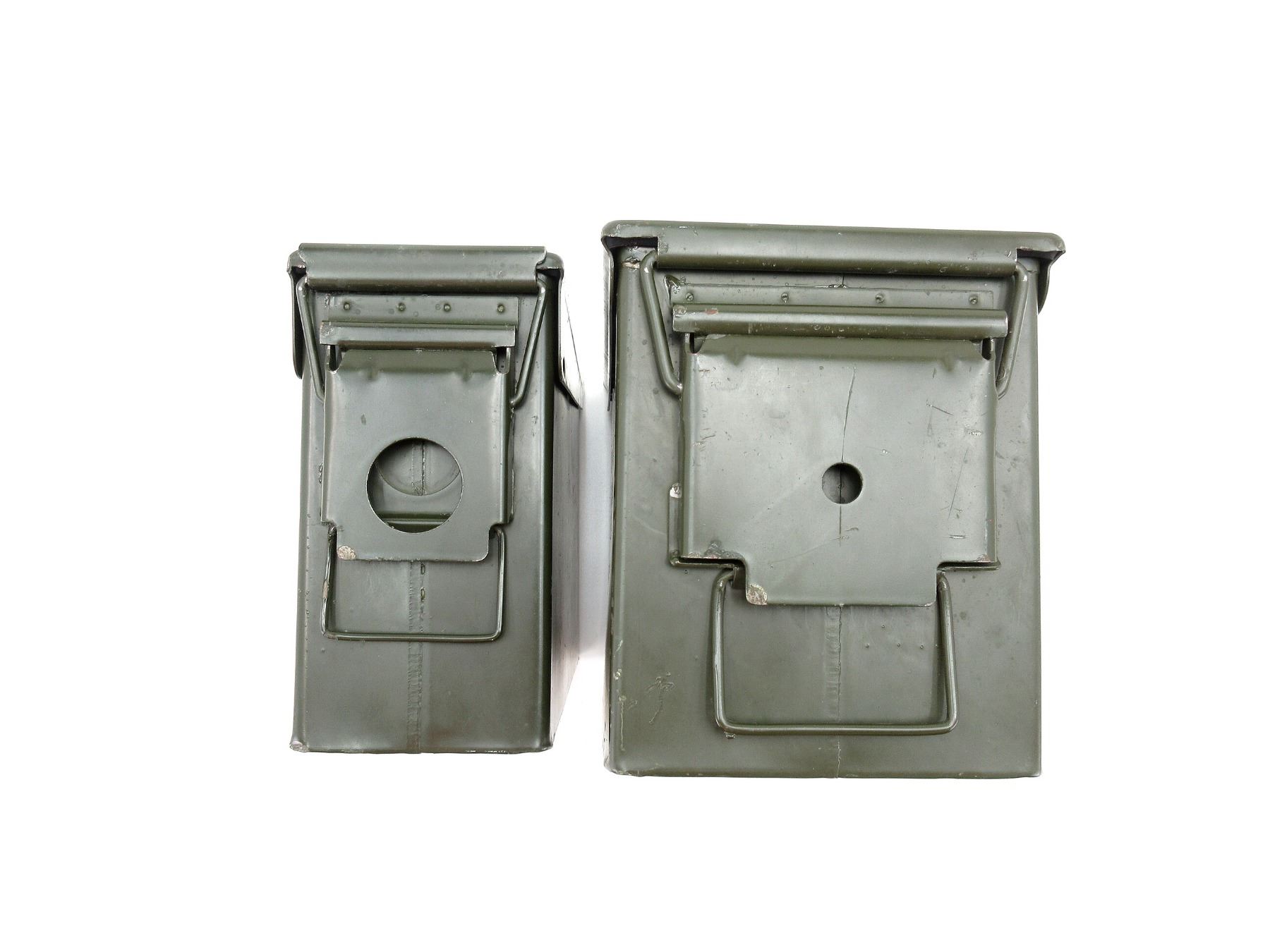 LOT INCLUDES; (1) GREEN PAINTED METAL AMMO TIN, VARIOUS MARKINGS, APPROX. 12" X 6" X 7" & (1) GREEN PAINTED METAL AMMO TIN, VARIOUS MARKINGS, APPROX. 11" X 4" X 7". SEE PHOTOS.
