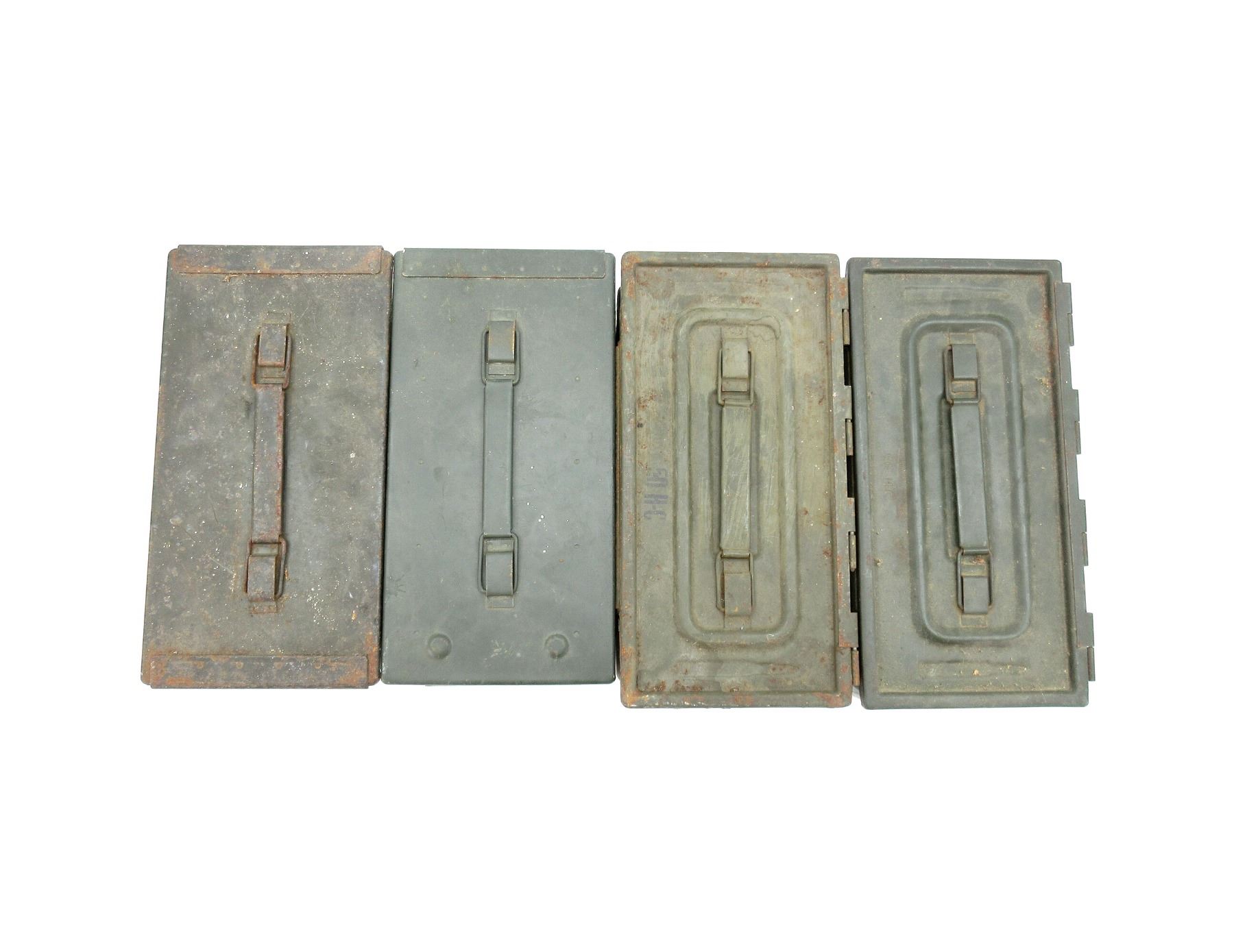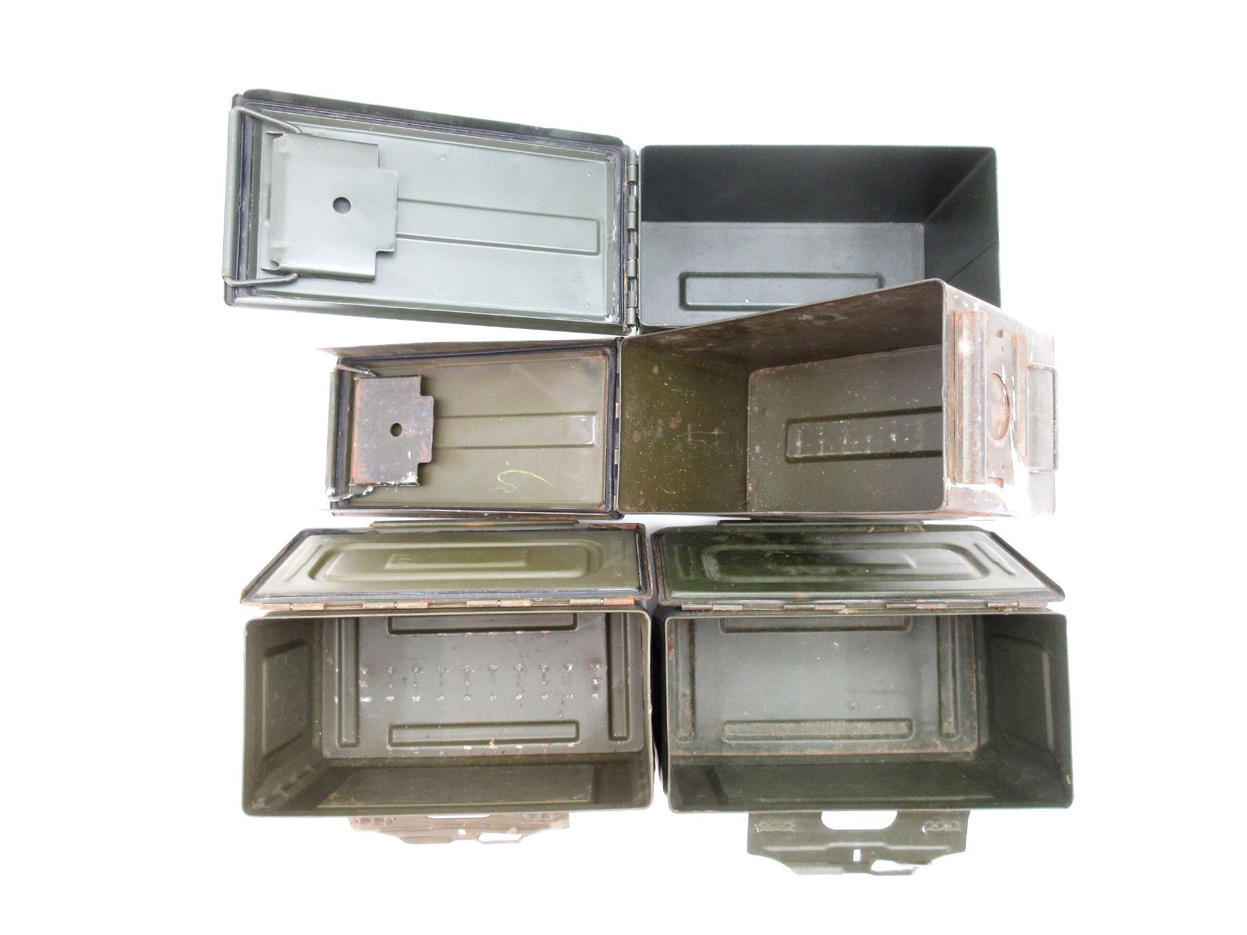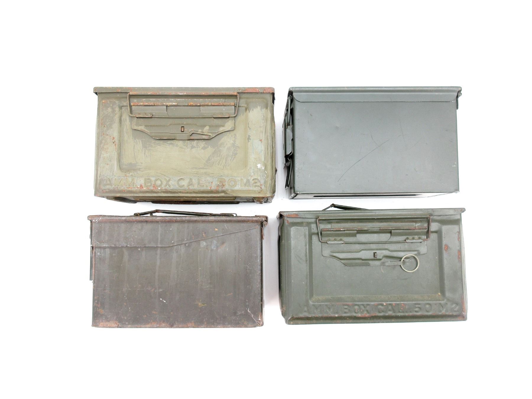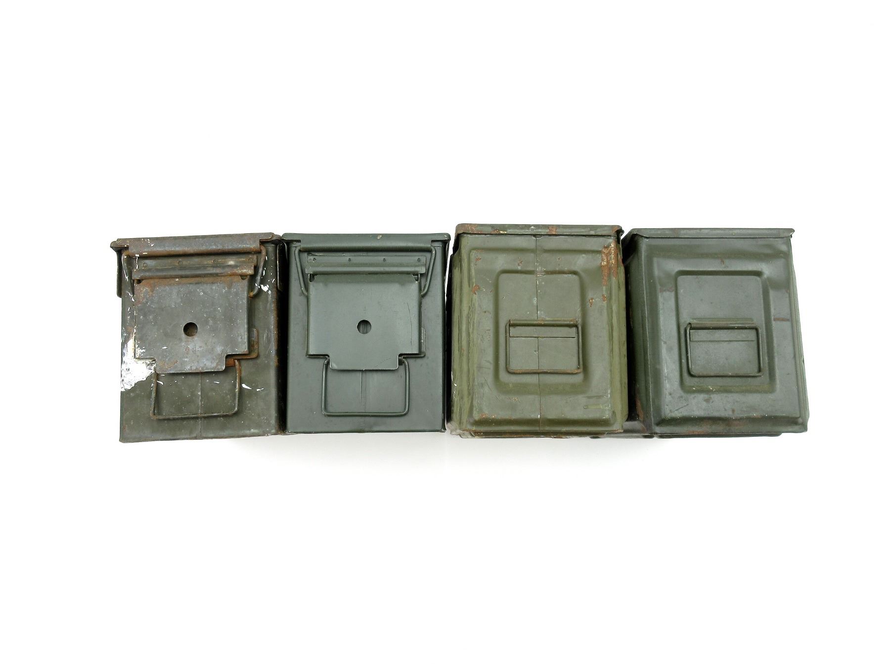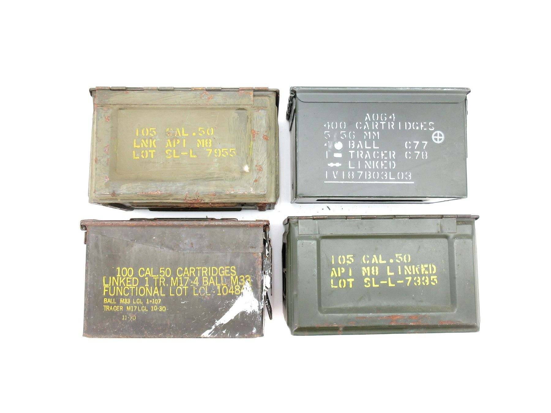 LOT INCLUDES; (2) GREEN PAINTED METAL AMMO TINS, VARIOUS MARKINGS, APPROX. 12.25" X 6 1/8" X 7.5" & (2) GREEN PAINTED METAL AMMO TINS, VARIOUS MARKINGS, APPROX. 12" X 6 1/8" X 7 1/8". SEE PHOTOS.