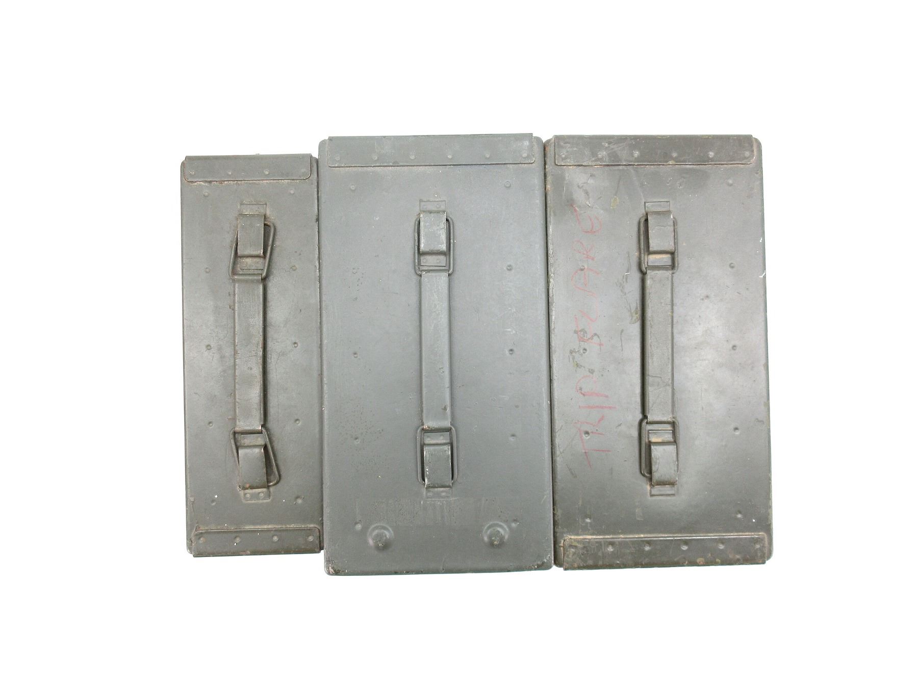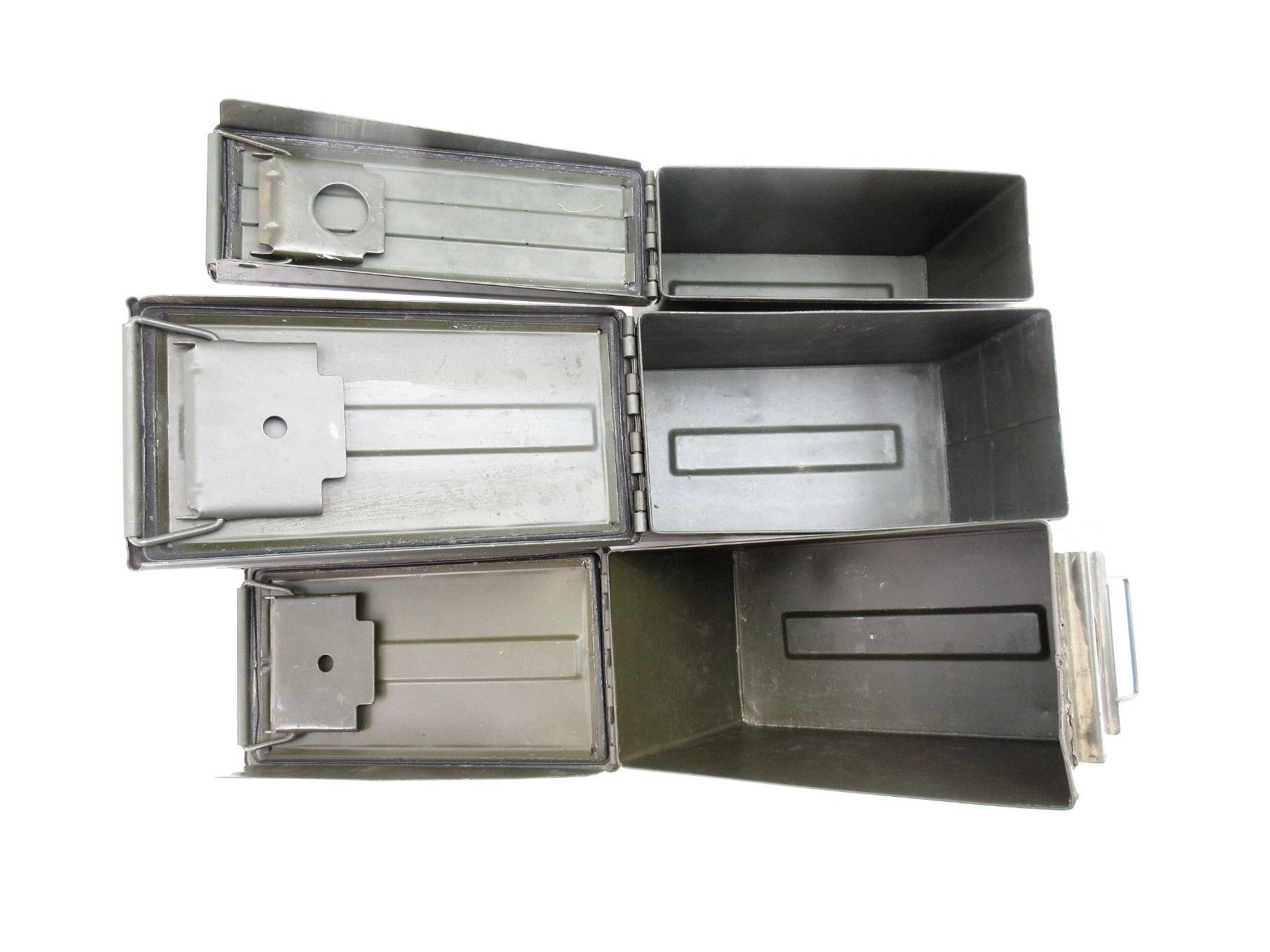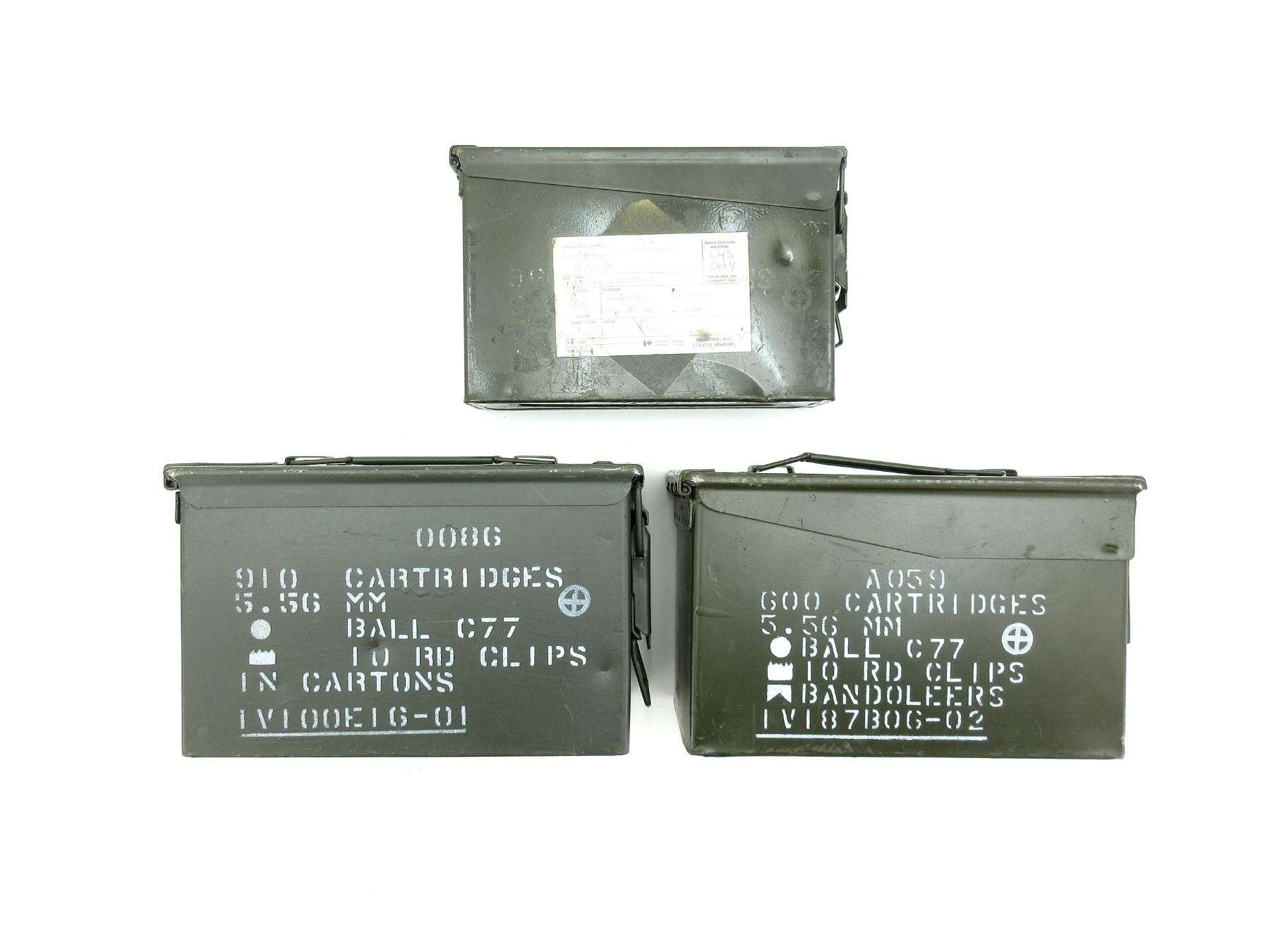 LOT INCLUDES; (2) GREEN PAINTED METAL AMMO TINS, VARIOUS MARKINGS, APPROX. 12" X 6" X 7.25" & (1) GREEN PAINTED METAL AMMO TIN, VARIOUS MARKINGS & APPROX. 11" X 3.75" X 7". SEE PHOTOS.