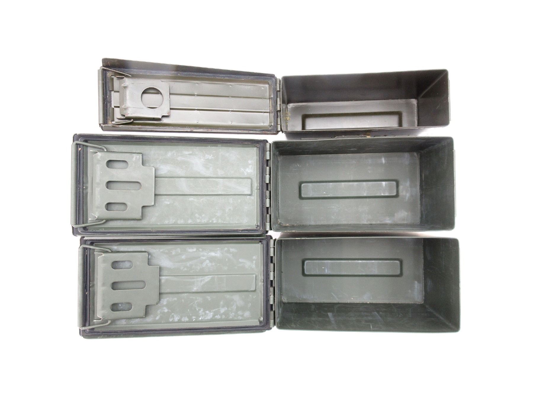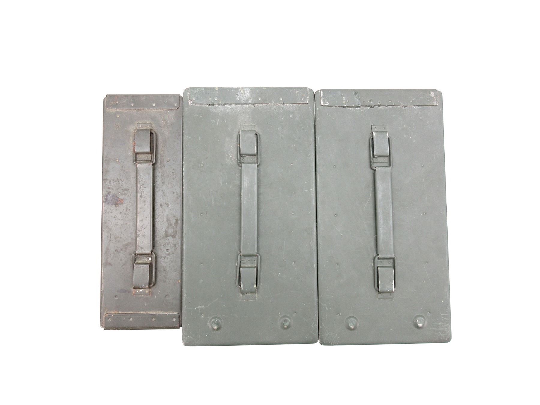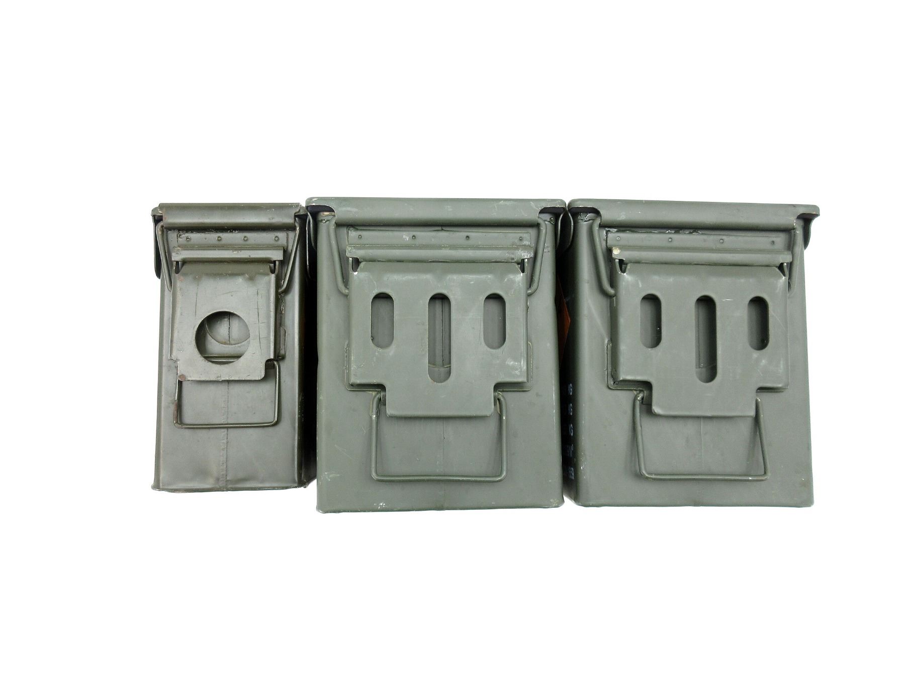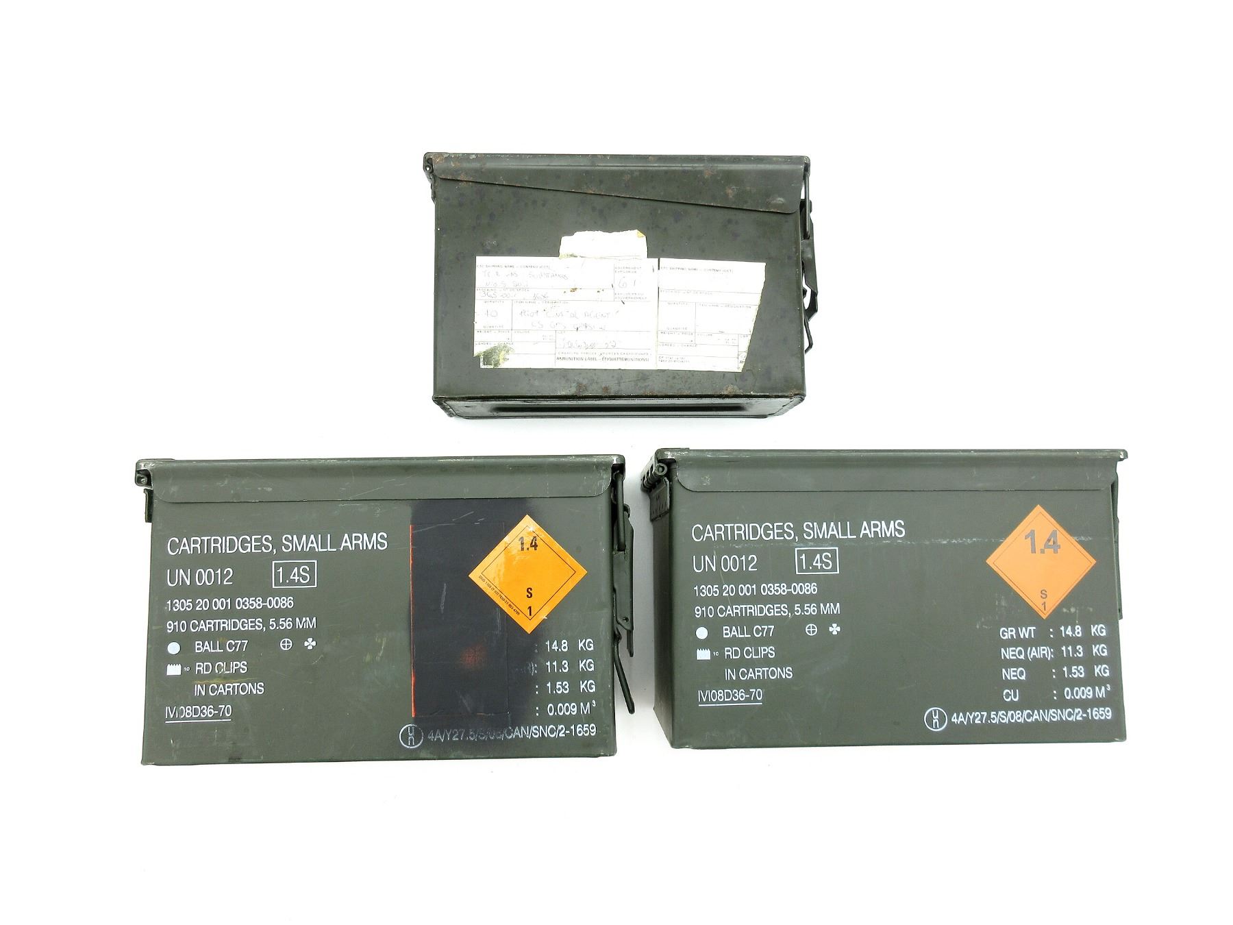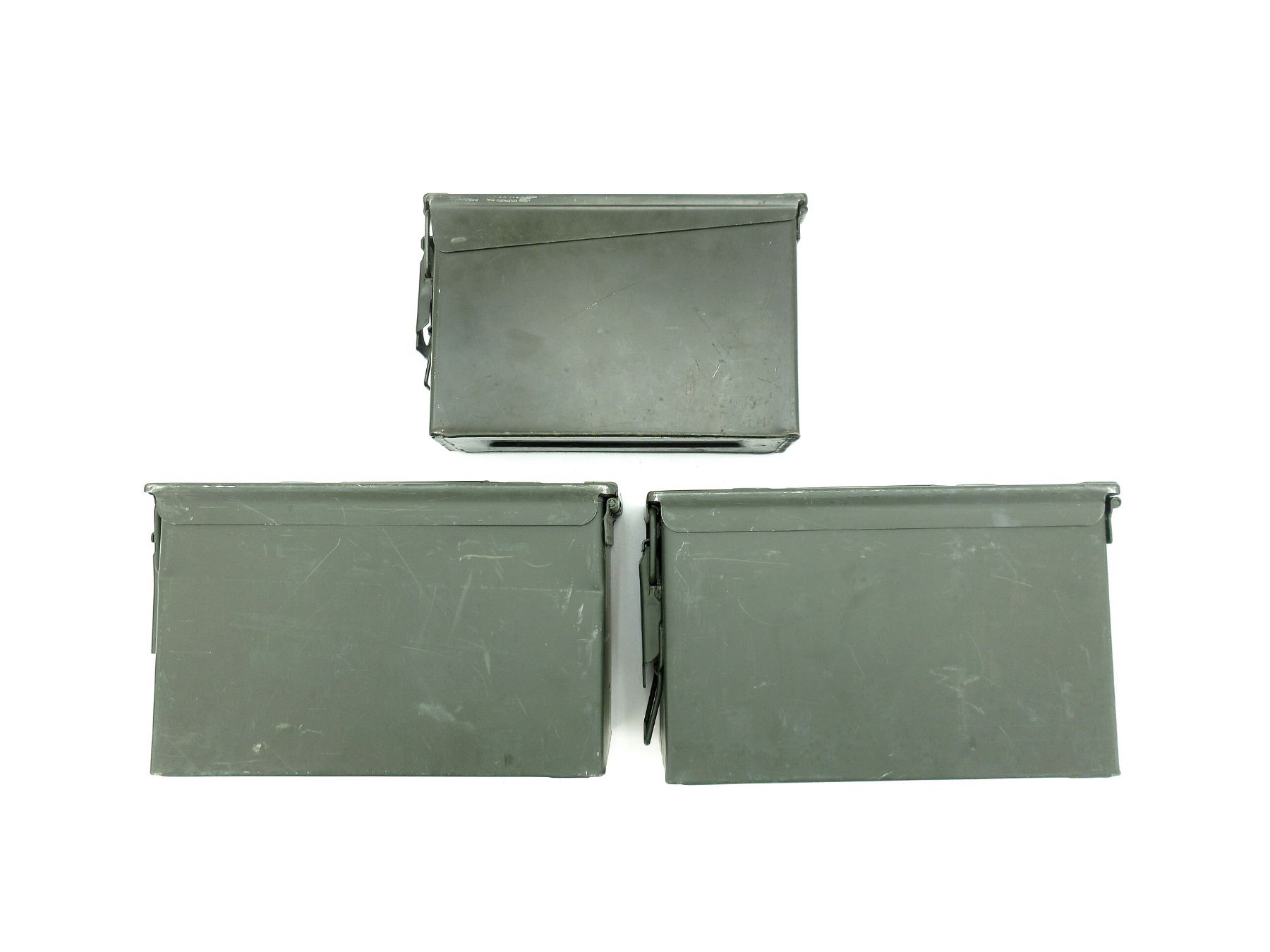 LOT INCLUDES; (2) GREEN PAINTED METAL AMMO TINS, VARIOUS MARKINGS, APPROX. 12" X 6" X 7.25" & (1) GREEN PAINTED METAL AMMO TIN, VARIOUS MARKINGS & APPROX. 11" X 3.75" X 7". SEE PHOTOS.