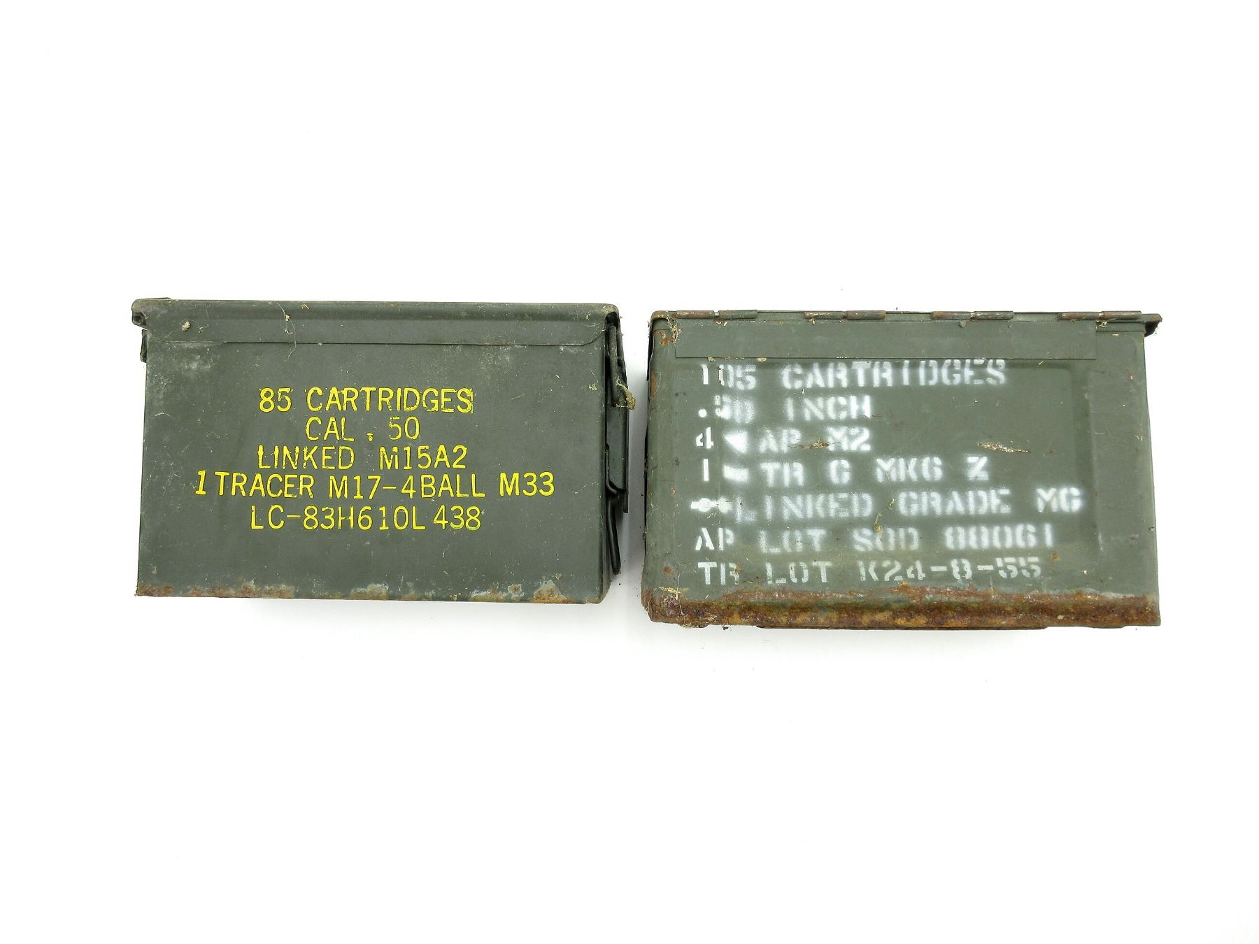 LOT INCLUDES; (2) GREEN PAINTED METAL AMMO TINS, VARIOUS MARKINGS, SHOWS AGE / WEAR, APPROX. 12" X 6" X 7.25" & APPROX. 12.25" X 6.25" X 7.5". SEE PHOTOS.