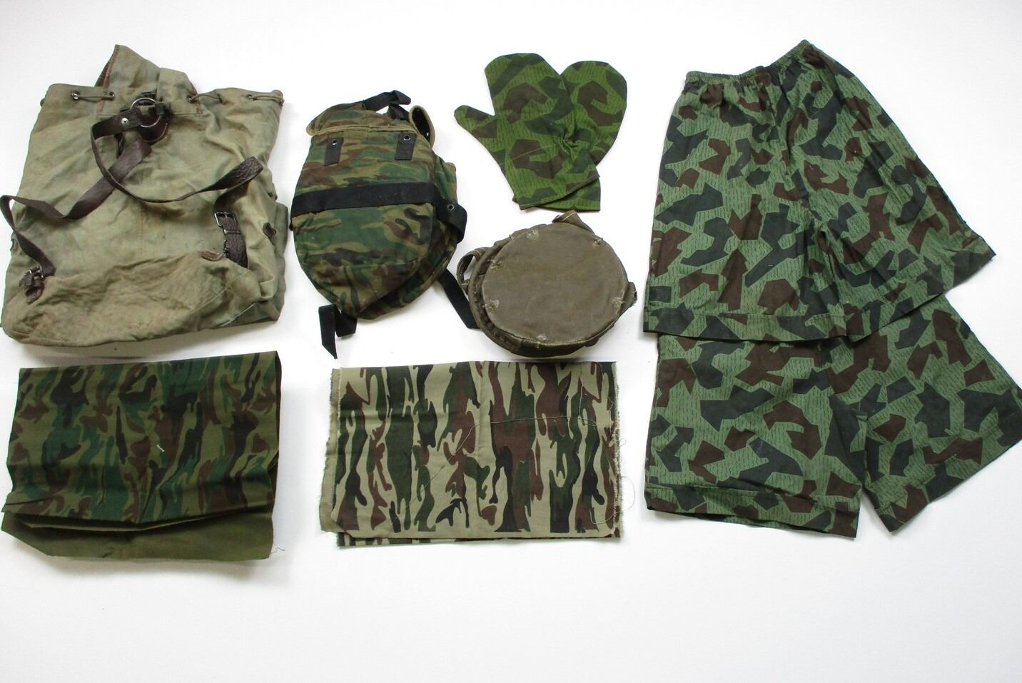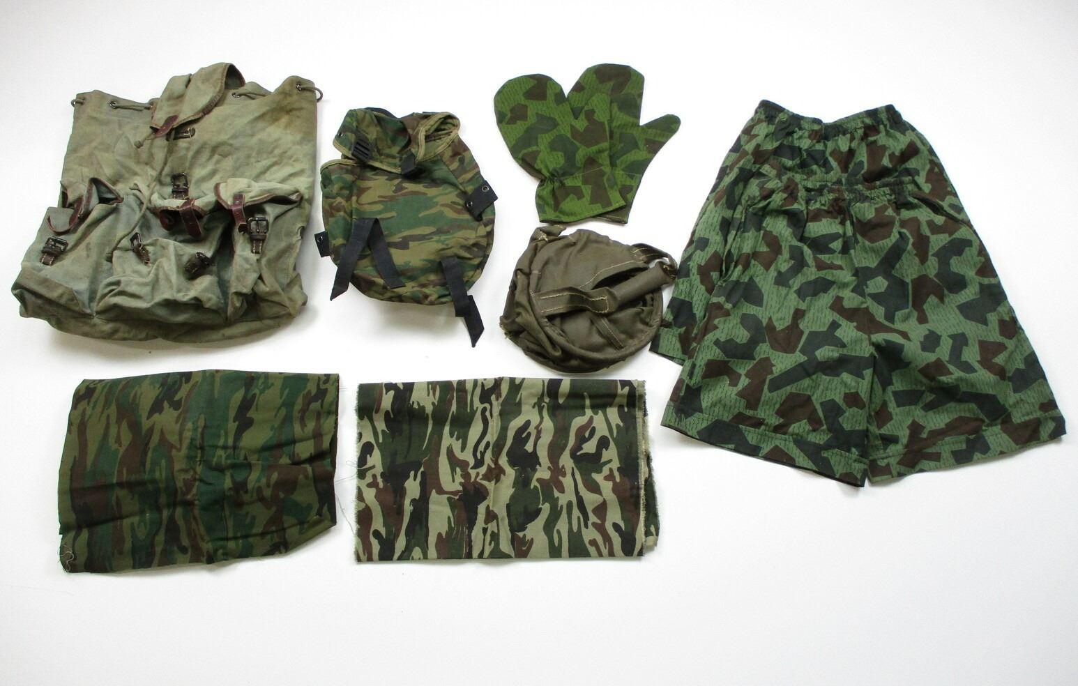 ASSORTED MILITARIA LOT , (1) SET OF BULGARIAN GLOVES. (2) BULGARIAN SHORTS (1) GUATEMALAN CAMO BAG. WITH NYLON STRAPS, PLASTIC FITTINGS. (1) CAMO CANTEEN COVER (1) SHEATH WITH METAL BELT CLIP. (2) DIFFERENT TYPES OF MILITARY FABRIC. (1) FINNISH BACKPACK, 3 OUTER POCKETS, MAIN POCKET HAS DRAW STRING. METAL BUCKLES, LEATHER SHOULDER STRAPS, SHOWS WEAR/AGE. (1) UNKNOWN WATER BUCKET, HAS HOLES, HANDLE MARKED PLASTINIFUGE, WATER PROOFED CANVAS TYPE MATERIAL.