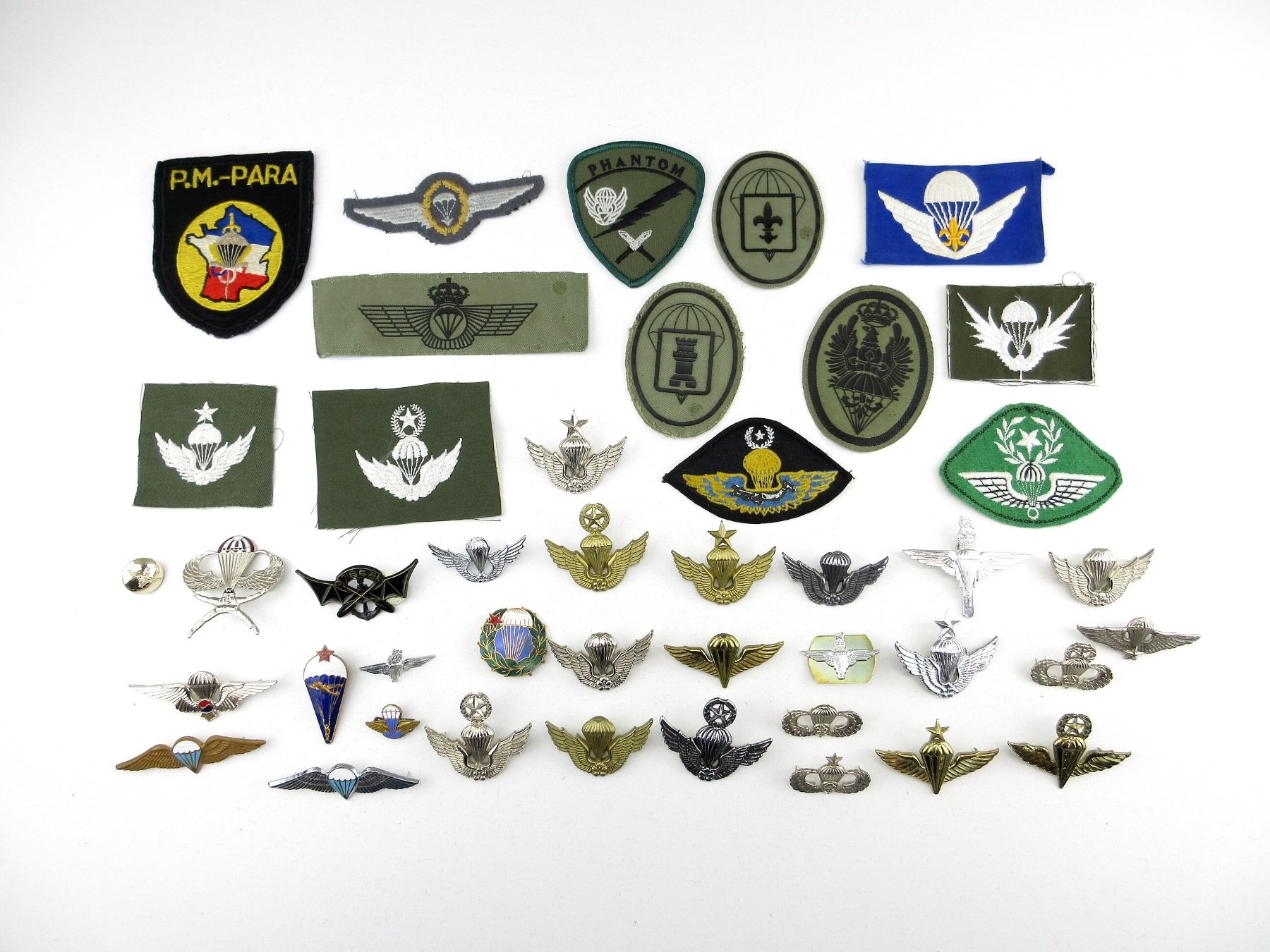 APPROX. (43) BADGES, BUTTONS, PINS, VARIOUS COUNTRIES, VARIOUS MATERIALS, COLOURS, SIZES, INCLUDES; REPUBLIC OF KOREA MARINE CORPS AMBUSH SPECIAL FORCES, REPUBLIC OF KOREA BASIC PARACHUTE, REPUBLIC OF KOREA SENIOR PARACHUTE, REPUBLIC OF KOREA MASTER PARACHUTE, FRANCE PARACHUTE, FRANCE PARATROOPER TRAINING, RUSSIAN PARATROOPER, GREECE HALO PARACHUTIST, ETC. SEE PHOTOS.