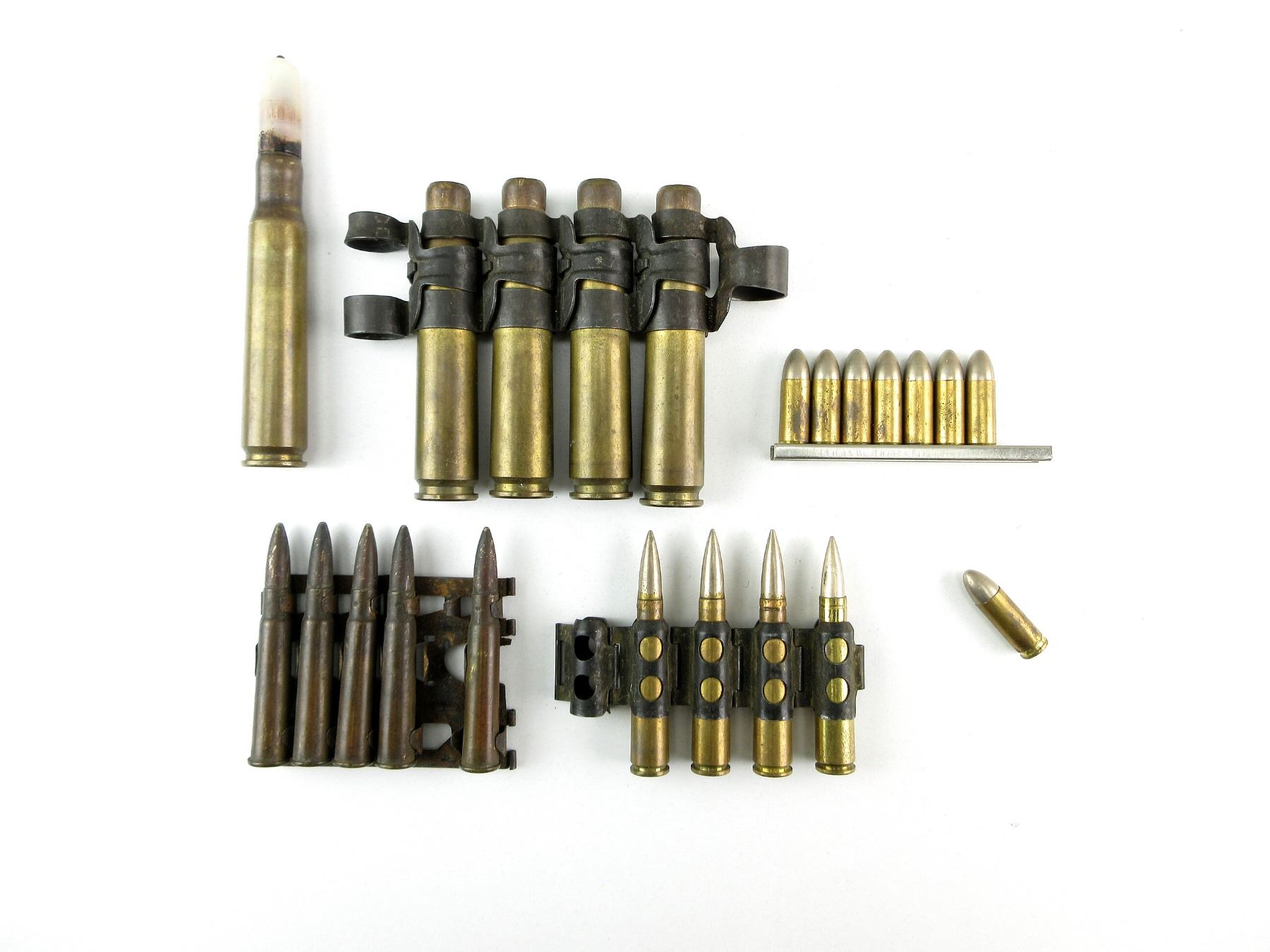 LOT INCLUDES; APPROX. (18) RNDS, VARIOUS CALIBERS INCLUDING; 9MM STEYR, 7.5X55MM ON LINKS, , .303 BR, .50 MS, (4) .50 MS BLANKS ON LINKS, (1) STRIPPER CLIP.