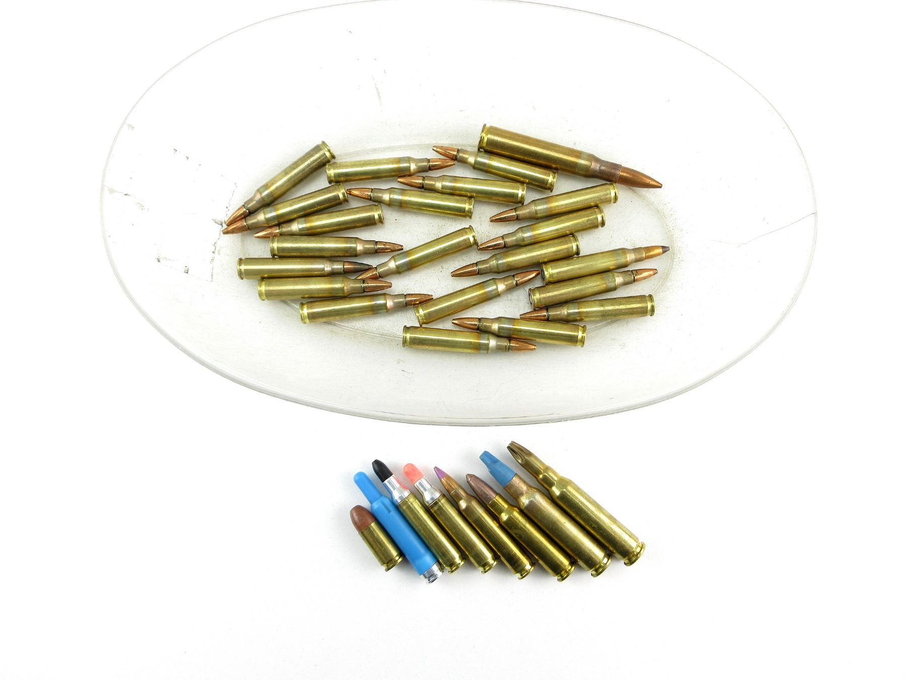 LOT INCLUDES; APPROX. (25) RNDS, VARIOUS CALIBERS INCLUDING; 5.56MM BALL CARBINE, 9MM LUGER, .30-06 SPRG, ETC., (4) TRAINING RNDS, (1) DUMMY RND.