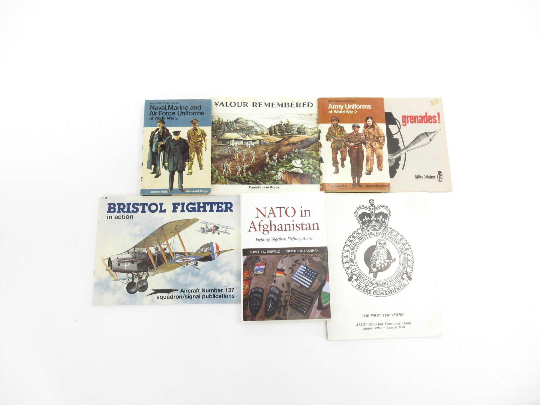 LOT INCLUDES; (1) "ARMY UNIFORMS OF WORLD WAR 2" BOOK BY ANDREW MOLLO, HARD COVER WITH DUST COVER, COPYRIGHT 1974, (1) "NAVAL, MARINE AND AIR FORCE UNIFORMS OF WORLD WAR 2" BOOK BY ANDREW MOLLO, HARD COVER WITH DUST COVER, (1) "BRISTOL FIGHT IN ACTION" BOOK BY PETER COOKSLEY, SOFT COVER, AIRCRAFT #137 SQUADRON/SIGNAL PUBLICATIONS, ISBN: 0-89747-301-9, (1) "GRENADES!" BOOK BY MIKE WEBER, SOFT COVER, COPYRIGHT 1979, (1) "VALOUR REMEMBERED, CANADIAN IN KOREA" BOOK, SOFT COVER, ISBN: 0-662-52115-3, (1) "NATO IN AFGHANISTAN, FIGHTING TOGETHER, FIGHTING ALONE" BOOK BY DAVID P. AUERSWALD, HARD COVER WITH DUST COVER, ISBN: 978-0-691-15938-6 & (1) "ASDU REUNION SOUVENIR BOOK, THE FIRST TEN YEARS, AUGUST 1980-AUGUST 1990" BOOK, SOFT COVER, COPYRIGHT 1990. SEE PHOTOS.