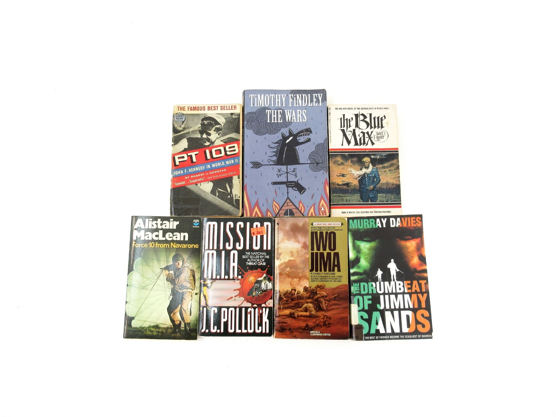 LOT INCLUDES; (1) "THE DRUMBEAT OF JIMMY SANDS" BOOK BY MURRAY DAVIES, SOFT COVER, ISBN: 0-00-651155-4, (1) "THE WARS" BOOK BY TIMOTHY FINDLEY, SOFT COVER, ISBN: 0-14-024116-7, (1) "THE BLUE MAX" BOOK BY JACK D. HUNTER, SOFT COVER, COPYRIGHT 1964, (1) "IWO JIMA" BOOK BY RICHARD F. NEWCOMB, SOFT COVER, ISBN: 0-553-27547-X, (1) "PT 109, JOHN F. KENNEDY IN WORLD WAR II" BOOK BY ROBERT J. DONOVAN, SOFT COVER, (1) "MISSION M.I.A." BOOK BY J.C. POLLOCK, SOFT COVER, ISBN: 0-440-15819-2 & (1) "FORCE 10 FROM NAVARONE" BOOK BY ALISTAIR MACLEAN, SOFT COVER, COPYRIGHT 1968, SOME PAGES MAY BE MISSING. SEE PHOTOS.