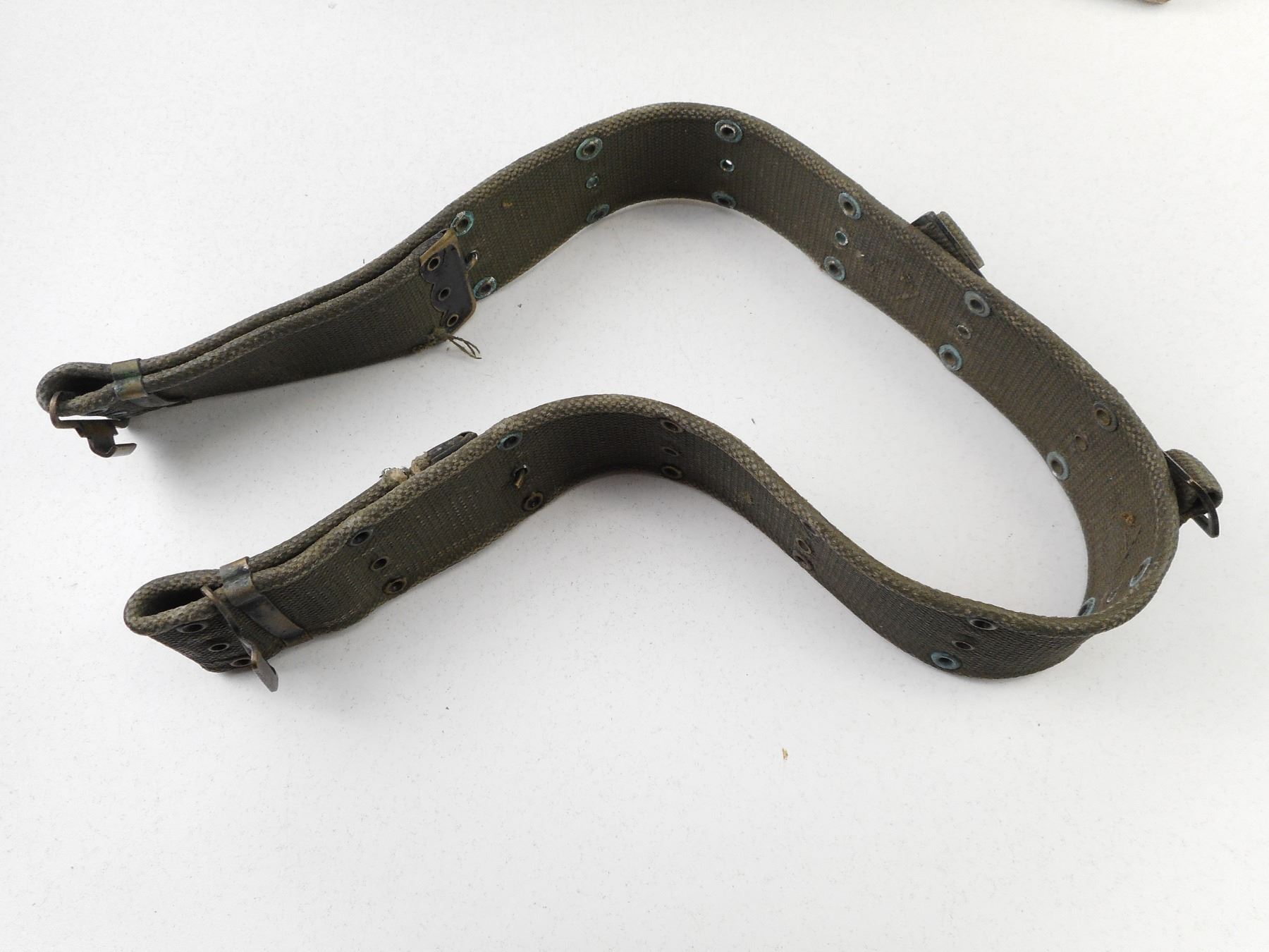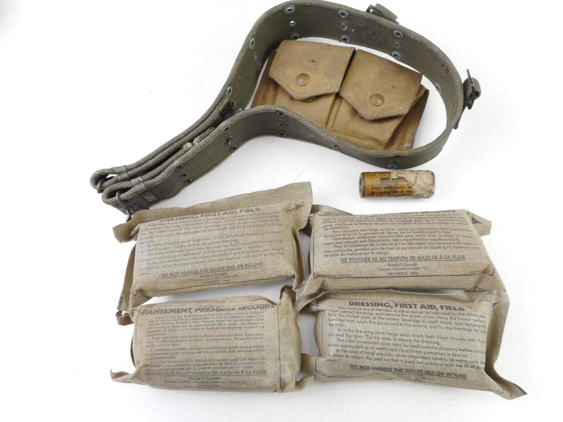 ASSORTED MILITARY EQUIPMENT , INCLUDES: (4) FIRST AID FIELD DRESSING (1) FIRE STARTER (1) WWII CANADIAN POUCH (1) BELT. LOT OF 7